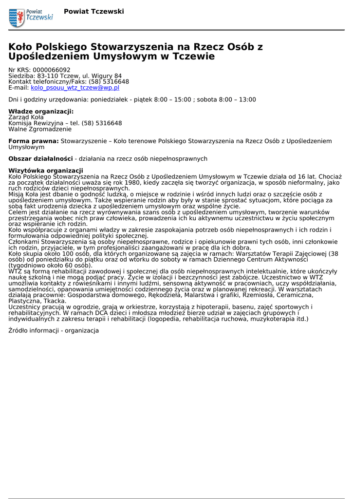 Powiat Tczewski Koło Polskiego Stowarzyszenia na Rzecz Osób z Upośledzeniem Umysłowym w Tczewie Nr KRS: 0000066092 Siedziba: 83-110 Tczew, ul. Wigury 84 Kontakt telefoniczny/Faks: (58) 5316648 E-mail: [email protected] Dni i godziny urzędowania: poniedziałek - piątek 8:00 – 15:00 ; sobota 8:00 – 13:00 Władze organizacji: Zarząd Koła Komisja Rewizyjna – tel. (58) 5316648 Walne Zgromadzenie Forma prawna: Stowarzyszenie – Koło terenowe Polskiego Stowarzyszenia na Rzecz Osób z Upośledzeniem Umysłowym Obszar działalności - działania na rzecz osób niepełnosprawnych Wizytówka organizacji Koło Polskiego Stowarzyszenia na Rzecz Osób z Upośledzeniem Umysłowym w Tczewie działa od 16 lat. Chociaż za początek działalności uważa się rok 1980, kiedy zaczęła się tworzyć organizacja, w sposób nieformalny, jako ruch rodziców dzieci niepełnosprawnych. Misją Koła jest dbanie o godność ludzką, o miejsce w rodzinie i wśród innych ludzi oraz o szczęście osób z upośledzeniem umysłowym. Także wspieranie rodzin aby były w stanie sprostać sytuacjom, które pociąga za sobą fakt urodzenia dziecka z upośledzeniem umysłowym oraz wspólne życie. Celem jest działanie na rzecz wyrównywania szans osób z upośledzeniem umysłowym, tworzenie warunków przestrzegania wobec nich praw człowieka, prowadzenia ich ku aktywnemu uczestnictwu w życiu społecznym oraz wspieranie ich rodzin. Koło współpracuje z organami władzy w zakresie zaspokajania potrzeb osób niepełnosprawnych i ich rodzin i formułowania odpowiedniej polityki społecznej. Członkami Stowarzyszenia są osoby niepełnosprawne, rodzice i opiekunowie prawni tych osób, inni członkowie ich rodzin, przyjaciele, w tym profesjonaliści zaangażowani w pracę dla ich dobra. Koło skupia około 100 osób, dla których organizowane są zajęcia w ramach: Warsztatów Terapii Zajęciowej (38 osób) od poniedziałku do piątku oraz od wtorku do soboty w ramach Dziennego Centrum Aktywności (tygodniowo około 60 osób). WTZ są formą rehabilitacji zawodowej i społecznej dla osób niepełnosprawnych intelektualnie, które ukończyły naukę szkolną i nie mogą podjąć pracy. Życie w izolacji i bezczynności jest zabójcze. Uczestnictwo w WTZ umożliwia kontakty z rówieśnikami i innymi ludźmi, sensowną aktywność w pracowniach, uczy współdziałania, samodzielności, opanowania umiejętności codziennego życia oraz w planowanej rekreacji. W warsztatach działają pracownie: Gospodarstwa domowego, Rękodzieła, Malarstwa i grafiki, Rzemiosła, Ceramiczna, Plastyczna, Tkacka. Uczestnicy pracują w ogrodzie, grają w orkiestrze, korzystają z hipoterapii, basenu, zajęć sportowych i rehabilitacyjnych. W ramach DCA dzieci i młodsza młodzież bierze udział w zajęciach grupowych i indywidualnych z zakresu terapii i rehabilitacji (logopedia, rehabilitacja ruchowa, muzykoterapia itd.) Źródło informacji - organizacja Powered by TCPDF (www.tcpdf.org)