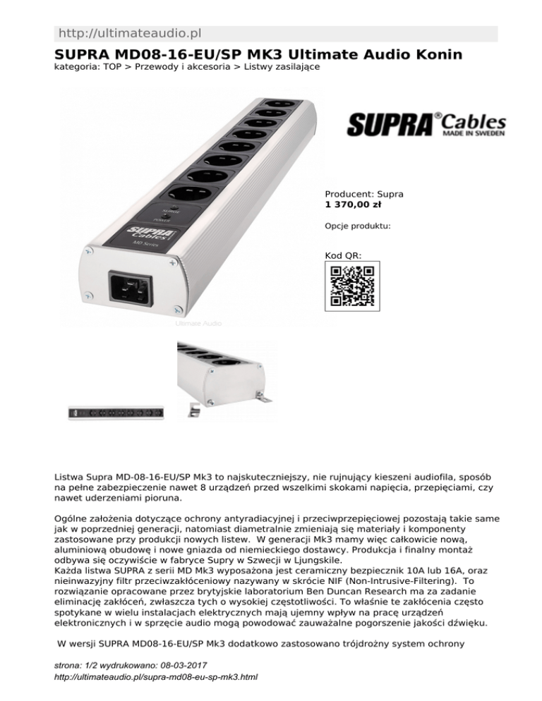 http://ultimateaudio.pl SUPRA MD08-16-EU/SP MK3 Ultimate Audio Konin kategoria: TOP > Przewody i akcesoria > Listwy zasilające Producent: Supra 1 370,00 zł Opcje produktu: Kod QR: Listwa Supra MD-08-16-EU/SP Mk3 to najskuteczniejszy, nie rujnujący kieszeni audiofila, sposób na pełne zabezpieczenie nawet 8 urządzeń przed wszelkimi skokami napięcia, przepięciami, czy nawet uderzeniami pioruna. Ogólne założenia dotyczące ochrony antyradiacyjnej i przeciwprzepięciowej pozostają takie same jak w poprzedniej generacji, natomiast diametralnie zmieniają się materiały i komponenty zastosowane przy produkcji nowych listew. W generacji Mk3 mamy więc całkowicie nową, aluminiową obudowę i nowe gniazda od niemieckiego dostawcy. Produkcja i finalny montaż odbywa się oczywiście w fabryce Supry w Szwecji w Ljungskile. Każda listwa SUPRA z serii MD Mk3 wyposażona jest ceramiczny bezpiecznik 10A lub 16A, oraz nieinwazyjny filtr przeciwzakłóceniowy nazywany w skrócie NIF (Non-Intrusive-Filtering). To rozwiązanie opracowane przez brytyjskie laboratorium Ben Duncan Research ma za zadanie eliminację zakłóceń, zwłaszcza tych o wysokiej częstotliwości. To właśnie te zakłócenia często spotykane w wielu instalacjach elektrycznych mają ujemny wpływ na pracę urządzeń elektronicznych i w sprzęcie audio mogą powodować zauważalne pogorszenie jakości dźwięku. W wersji SUPRA MD08-16-EU/SP Mk3 dodatkowo zastosowano trójdrożny system ochrony strona: 1/2 wydrukowano: 08-03-2017 http://ultimateaudio.pl/supra-md08-eu-sp-mk3.html przeciwprzepięciowej. Obejmuje on ochronę przed przepięciami nie tylko między przewodami fazowymi, ale także pomiędzy każdym przewodem fazowym a uziemieniem. Filtr ten zabezpiecza przed nagłymi udarami w sieci elektrycznej o bardzo wysokim napięciu i trwającymi bardzo niewielki ułamek sekundy a mogącymi spowodować uszkodzenie sprzętu. W takich przypadkach zwykły bezpiecznik nie zdaje egzaminu, bowiem skok napięcia trwa zbyt krótko aby drut bezpiecznika zdążył się stopić i ulec przerwaniu, odcinając obieg prądu. Rozwiązanie to zabezpiecza jednocześnie i użytkownika i urządzenia przed możliwymi przebiciami prądu. Listwy o mniejszej ilości gniazd są dostępne w wersji Mk3 i SP: SUPRA MD-06 EU Mk3 i SUPRA MD06 EU/SP Mk3. Najważniejszym w listwie, obok bezpiecznika elementem zabezpieczającym podłączone urządzenia, jest filtr Supra NIF (Non-Intrusive-Filtering) - nieinwazyjny filtr przeciwzakłóceniowy opracowany przez Ben Duncan Research w Anglii. Jego zadaniem jest eliminowanie wszelkich zakłóceń, zwłaszcza tych o wysokiej częstotliwości. To właśnie te zakłócenia często spotykane w wielu instalacjach elektrycznych mają ujemny wpływ na pracę urządzeń elektronicznych i w sprzęcie audio mogą powodować zauważalne pogorszenie jakości dźwięku. Istotną zaletą listwy zasilającej Supra MD-08-16-EU/SP jest fakt, iż zastosowane rozwiązania zabezpieczające nie wpływają ujemnie na dźwięk. Wprost przeciwnie - "oczyszczony" z zakłóceń prąd sprawia, że podłączone urządzenia pracują w stabilniejszych warunkach elektrycznych, dając w efekcie czystszy i bardziej przestrzenny dźwięk. UWAGA: W zestawie nie znajduje się kabel zasilajacy. Polecamy kabel Supra LoRad Mk2 2.5 CS-16-EU. Obudowa: Aluminum Gniazda: Standard Europejski Wejście: SUPRA MCH-16, IEC320 16A Wyjścia: 8 x SUPRA MCH-16/EU, Schuko Female. Max AC Current: 16A Max AC Voltage: 250V Max Continuous Power: 3680W Bezpiecznik: Ceramiczny 16A, Slow Ochrona przeciwprzepięciowa Filtr przeciwzakłóceniowy Uoc = 2.5kV(P-N), 4.0kV(P(N)-PE) Up = 2.0kV(P-N), 2.05V(P(N)-PE) Waga: 1.5Kg Wymiary: (DxSxW): 537 x 89 x 53mm Możliwość montażu nasciennego Uwaga: Nie zawiera kabla zasilającego! strona: 2/2 wydrukowano: 08-03-2017 http://ultimateaudio.pl/supra-md08-eu-sp-mk3.html