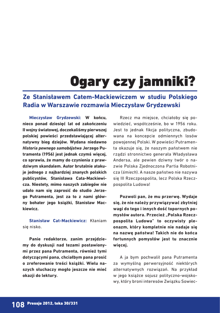 Ogary czy jamniki? Ze Stanisławem Catem-Mackiewiczem w studiu Polskiego Radia w Warszawie rozmawia Mieczysław Grydzewski Mieczysław Grydzewski: W końcu, nieco ponad dziesięć lat od zakończeniu II wojny światowej, doczekaliśmy pierwszej polskiej powieści przedstawiającej alternatywny bieg dziejów. Wydana niedawno Historia pewnego samobójstwa Jerzego Putramenta (1956) jest jednak czymś więcej, co sprawia, że mamy do czynienia z prawdziwym skandalem. Autor brutalnie atakuje jednego z najbardziej znanych polskich publicystów, Stanisława Cata-Mackiewicza. Niestety, mimo naszych zabiegów nie udało nam się zaprosić do studio Jerzego Putramenta, jest za to z nami główny bohater jego książki, Stanisław Mackiewicz. Stanisław Cat-Mackiewicz: Kłaniam się nisko. Panie redaktorze, zanim przejdziemy do dyskusji nad tezami postawionymi przez pana Putramenta, również tymi dotyczącymi pana, chciałbym pana prosić o zreferowanie treści książki. Wielu naszych słuchaczy mogło jeszcze nie mieć okazji do lektury. 108 Pressje 2012, teka 30/331 Rzecz ma miejsce, chciałoby się powiedzieć, współcześnie, bo w 1956 roku. Jest to jednak fikcja polityczna, zbudowana na koncepcie odmiennych losów powojennej Polski. W powieści Putramenta okazuje się, że naszym państwem nie rządzi stronnictwo generała Władysława Andersa, ale pewien dziwny twór o nazwie Polska Zjednoczona Partia Robotnicza (śmiech). A nasze państwo nie nazywa się III Rzeczpospolita, lecz Polska Rzeczpospolita Ludowa! Pozwoli pan, że mu przerwę. Wydaje się, że nie należy przywiązywać zbytniej wagi do tego i innych dość topornych pomysłów autora. Przecież „Polska Rzeczpospolita Ludowa” to oczywisty pleonazm, który kompletnie nie nadaje się na nazwę państwa! Takich nie do końca fortunnych pomysłów jest tu znacznie więcej. A ja bym pochwalił pana Putramenta za wymyślną perwersyjność niektórych alternatywnych rozwiązań. Na przykład w jego książce sojusz polityczno-wojskowy, który broni interesów Związku Sowiec- kiego, nazywa się Sojuszem Prometejskim! Hasło prometeizmu, które oznacza ideę wyzwalania Europy Wschodniej spod jarzma komunizmu, w powieści Putramenta służy obronie ZSRS! Panie redaktorze, zamiast zagłębiać się w mniej istotnych szczegółach, opowiedzmy może o tej alternatywnej Polsce Putramenta. Jaka jest jej najważniejsza cecha? Nawet nie wie pan, jakie to trudne pytanie! Nie potrafię wskazać istoty tego dziwnego tworu. Przede wszystkim nie sądzę, byśmy mogli go nazywać Polską. Ten kraj istnieje tylko jako wypadkowa interesu sowieckiego. To ZSRS określa jego granice, skład rządu, politykę wewnętrzną i zagraniczną, życie kulturalne. Słowem wszystko, co wykracza poza najbardziej prywatne życie jednostek. Jest pan wybitnym specjalistą od Sowietów. Niedawno w Krakowie, w nowym wydawnictwie Universitas, ukazało się kolejne wydanie pańskiego bestsellera Myśl w obcęgach. Na czym polega „zaobcęgowanie” polskiej myśli w alternatywnym świecie opisanym przez Putramenta? Pozwoli pan, panie redaktorze, że odpowiem na to pytanie za chwilę. Myślę, że jestem tu przede wszystkim nie jako autor Myśli w obcęgach, ale jako osoba, która stała się celem niezwykle perfidnego ataku. To ja bowiem jestem w rzeczy samej ofiarą tytułowego samobójstwa. W największym skrócie: w powieści Putramenta po wojnie zostałem na emigracji w Londynie, nie chcąc pogodzić się z sowieckim panowaniem w Polsce, ale po pewnym czasie za obietnicę wydawania książek oraz korzyści materialnych wracam do kraju i staję się swego rodzaju listkiem figowym dla panującego porządku. To haniebna kalumnia! Nie wolno milczeć o niskich pobudkach pana Putramenta, do niedawna mojego redakcyjnego kolegi, z którym rozstaliśmy się w nieprzyjemnej atmosferze. Jego wejście do polityki i objęcie mandatu poselskiego z list Ruchu Trzeciej Rzeczypospolitej Władysława Andersa nie było dla mnie specjalnym zaskoczeniem. Jerzy nigdy nie ukrywał swych ogromnych ambicji. Uważam, że Historia pewnego samobójstwa jest po prostu próbą zdyskredytowania mnie w oczach zwolenników prezydenta Andersa, do których, jak powszechnie wiadomo, i ja się zaliczam. To dlatego już kilka dni po opublikowaniu powieści Putramenta ogłosił pan na łamach „Dziennika Polskiego” artykuł pod wiele mówiącym tytułem Argumenty o niemożliwości zdrady (Mackiewicz 1956). Tak jest. Decyzję mojego powieściowego odpowiednika uważam za zdradę tym dotkliwszą, im mniej oczywistą. Nie został on przecież donosicielem, nie szkodził bezpośrednio byłym przyjaciołom i sprzymierzeńcom. Zdradził on jednak swą własną myśl. Czy aby na pewno? Przecież w jednej z pierwszych pańskich książek, w Kropkach nad i, zarzucił pan niekonsekwencje „białej” emigracji rosyjskiej, która nie chciała wracać do kraju… Czy powrót do kraju, gdzie można bardziej wpływać na sytuację polityczną, nie jest raczej przejawem politycznej przytomności, a nie zdrady? Ogary czy jamniki? 109 Emigrantom rosyjskim zarzucałem strach o własne życie, które mogło być zagrożone w razie kontynuowania działalności publicystycznej w ich ojczyźnie. Publicyście politycznemu wolno, czasem nawet należy, ryzykować własnym życiem. Pod żadnym pozorem nie może on jednak ryzykować swą myślą. Jeśli publicysta służy idei państwowej, w takim wypadku ryzykuje własnym państwem. To jak różnica między poświęceniem życia za swą rodzinę, a oddaniem córki do burdelu. Nie muszę chyba wyjaśniać, który czyn jest bardziej chwalebny. Putrament obsadził mnie w roli stręczyciela idei państwowej! W jego chorej wizji wróciłem do kraju w celu kupczenia moją wizją polityki polskiej, bez żadnej szansy jej urzeczywistnienia. W tych fantastycznych okolicznościach, opisanych w powieści Putramenta, jedyna uczciwa myśl polityczna może być tylko myślą antypańst