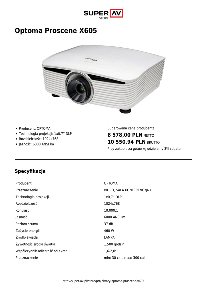 Optoma Proscene X605 Producent: OPTOMA Technologia projekcji: 1x0,7'' DLP Rozdzielczość: 1024x768 Jasność: 6000 ANSI lm Sugerowana cena producenta: 8 578,00 PLN NETTO 10 550,94 PLN BRUTTO Przy zakupie za gotówkę udzielamy 3% rabatu Specyfikacja Producent OPTOMA Przeznaczenie BIURO, SALA KONFERENCYJNA Technologia projekcji 1x0,7'' DLP Rozdzielczość 1024x768 Kontrast 10.000:1 Jasność 6000 ANSI lm Poziom szumu 37 dB Zużycie energii 460 W Źródło światła LAMPA Żywotność źródła światła 1.500 godzin Współczynnik odległość od ekranu 1,6-2,0:1 Przeznaczenie min: 30 cali, max: 300 cali http://super-av.pl/store/projektory/optoma-proscene-x605 HDMI x 1 DisplayPort x 1 D-Sub15 x 2 RGBHV (5xBNC) x 1 Wejścia video component video (3xchinch RCA) x 1 S-Video x 1 composite video (1xchinch RCA) x 1 3D Sync x 1 HDBaseT (RJ45) x 1 Wyjścia video D-Sub 15 x 1 audio stereo in (2x chinch RCA) x 2 Wejścia audio Mikrofon in x 1 audio stereo out (mini jack 3,5mm) x 2 USB x 1 RS232 x 1 Porty komunikacyjne RJ45 x 1 trigger 12V x 1 3D Sync-out Waga 5.9 kg Wymiary 430x183x340 mm PILOT ZDALNEGO STEROWANIA - tak Wymiary KABEL ZASILAJĄCY - tak CD-ROM Z OPROGRAMOWANIEM - tak Lens shift Kompatybilność 3D pionowy: +60/-20% , poziomy: +/-10% Frame Packing (Full HD 3D) Frame Sequential (3D Ready) Sterowanie zoom ELEKTRYCZNE ZALEŻNE OD OBIEKTYWU Sterowanie focus ELEKTRYCZNE ZALEŻNE OD OBIEKTYWU Obiektyw f = 22,8-28,5mm (standardowy) Audio 20W Montaż sufitowy TAK Korekcja Keystone pionowa +/-20 stopni Wyrównanie jasności 85% FULL HD 1080P LENS-SHIFT DYNAMICZNY IRIS Funkcje specjalne INSTALACJA 360 STOPNI PIP STEROWANIE PRZEZ PRZEGLĄDARKĘ WWW SYMULACJA DICOM http://super-av.pl/store/projektory/optoma-proscene-x605 ultrakrótkoogniskowy 0,8:1 krótkoogniskowy 1,1-1,4:1 Obiektywy opcjonalne standardowy 1,6-2,0:1 długoogniskowy 2,0-3,0:1 ultradługoogniskowy 3,1-5,2:1 Przybliżony czas realizacji 7-10 DNI ROBOCZYCH Informacje Optoma X605 Potężne narzędzie prezentacji jasność 6000 lumenów wymienne obiektywy pełne wsparcie systemó sterowania Crestron, Extron, AMX, PJ-Link i Telnet LAN wsparcie standardu DICOM zaprojektowany specjalnie do projekcji profesjonalnych, bardzo mocny projektor X515 zapewnia wysoka jasność 6,000 lumenów ANSI i może być z powodzeniem stosowany nawet w najbardziej zaawansowanych instalacjach. Potężna jasność w połączeniu z kontrastem 10.000:1 gwarantuje jasny obraz i żywe kolory w prezentacjach oraz w projekcjach materiałów filmowych. Dla prezentacji medycznych możliwe jest zastosowanie trybu DICOM wzmacniającego skalę szarości kluczowa w obrazowaniu medycznym. Super AV al. Jana Pawła II 32 43 - 100 Tychy tel: 32 217 01 12 http://super-av.pl/store/projektory/optoma-proscene-x605