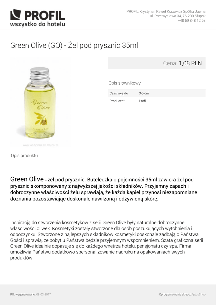 PROFIL Krystyna i Paweł Kosowicz Spółka Jawna ul. Przemysłowa 34, 76-200 Słupsk +48 59 848 12 63 Green Olive (GO) - Żel pod prysznic 35ml Cena: 1,08 PLN Opis słownikowy Czas wysyłki 3-5 dni Producent Profil Opis produktu Green Olive – żel pod prysznic. Buteleczka o pojemności 35ml zawiera żel pod prysznic skomponowany z najwyższej jakości składników. Przyjemny zapach i dobroczynne właściwości żelu sprawiają, że każda kąpiel przynosi niezapomniane doznania pozostawiając doskonale nawilżoną i odżywioną skórę. Inspiracją do stworzenia kosmetyków z serii Green Olive były naturalne dobroczynne właściwości oliwek. Kosmetyki zostały stworzone dla osób poszukujących wytchnienia i odpoczynku. Stworzone z najlepszych składników kosmetyki doskonale zadbają o Państwa Gości i sprawią, że pobyt u Państwa będzie przyjemnym wspomnieniem. Szata graficzna serii Green Olive idealnie dopasuje się do każdego wnętrza hotelu, pensjonatu czy spa. Firma umożliwia Państwu dodatkowo spersonalizowanie nadruku na opakowaniach swych produktów. Plik wygenerowano: 08-03-2017 Oprogramowanie sklepu: AptusShop PROFIL Krystyna i Paweł Kosowicz Spółka Jawna ul. Przemysłowa 34, 76-200 Słupsk +48 59 848 12 63 Produkt sprzedawany jest w opakowaniu zbiorczym - 55 sztuk. Plik wygenerowano: 08-03-2017 Powered by TCPDF (www.tcpdf.org) Oprogramowanie sklepu: AptusShop