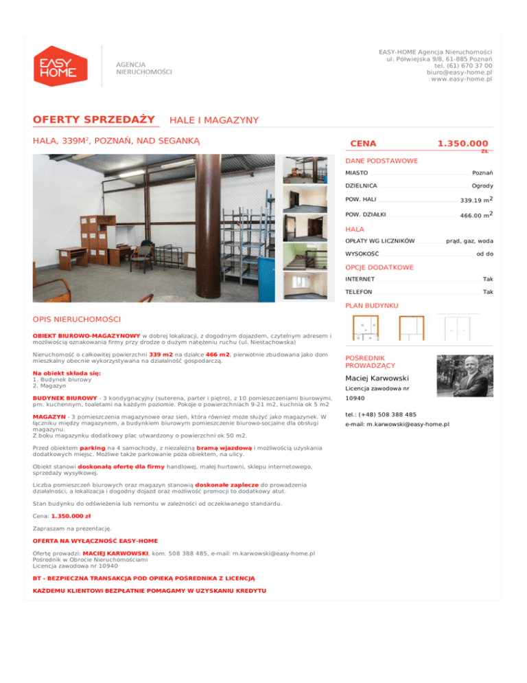 EASY-HOME Agencja Nieruchomości ul. Półwiejska 9/8, 61-885 Poznań tel. (61) 670 37 00 [email protected] www.easy-home.pl OFERTY SPRZEDAŻY HALE I MAGAZYNY HALA, 339M 2, POZNAŃ, NAD SEGANKĄ CENA 1.350.000 ZŁ DANE PODSTAWOWE MIASTO Poznań DZIELNICA Ogrody POW. HALI 339.19 m 2 POW. DZIAŁKI 466.00 m 2 HALA OPŁATY WG LICZNIKÓW prąd, gaz, woda WYSOKOŚĆ od do OPCJE DODATKOWE INTERNET Tak TELEFON Tak PLAN BUDYNKU OPIS NIERUCHOMOŚCI OBIEKT BIUROWO-MAGAZYNOWY w dobrej lokalizacji, z dogodnym dojazdem, czytelnym adresem i możliwością oznakowania firmy przy drodze o dużym natężeniu ruchu (ul. Niestachowska) Nieruchomość o całkowitej powierzchni 339 m2 na działce 466 m2, pierwotnie zbudowana jako dom mieszkalny obecnie wykorzystywana na działalność gospodarczą. Na obiekt składa się: 1. Budynek biurowy 2. Magazyn POŚREDNIK PROWADZĄCY Maciej Karwowski Licencja zawodowa nr BUDYNEK BIUROWY - 3 kondygnacyjny (suterena, parter i piętro), z 10 pomieszczeniami biurowymi, pm. kuchennym, toaletami na każdym poziomie. Pokoje o powierzchniach 9-21 m2, kuchnia ok 5 m2 10940 MAGAZYN - 3 pomieszczenia magazynowe oraz sień, która również może służyć jako magazynek. W łączniku między magazynem, a budynkiem biurowym pomieszczenie biurowo-socjalne dla obsługi magazynu. Z boku magazynku dodatkowy plac utwardzony o powierzchni ok 50 m2. tel.: (+48) 508 388 485 Przed obiektem parking na 4 samochody, z niezależną bramą wjazdową i możliwością uzyskania dodatkowych miejsc. Możliwe także parkowanie poza obiektem, na ulicy. Obiekt stanowi doskonałą ofertę dla firmy handlowej, małej hurtowni, sklepu internetowego, sprzedaży wysyłkowej. Liczba pomieszczeń biurowych oraz magazyn stanowią doskonałe zaplecze do prowadzenia działalności, a lokalizacja i dogodny dojazd oraz możliwość promocji to dodatkowy atut. Stan budynku do odświeżenia lub remontu w zależności od oczekiwanego standardu. Cena: 1.350.000 zł Zapraszam na prezentację. OFERTA NA WYŁĄCZNOŚĆ EASY-HOME Ofertę prowadzi: MACIEJ KARWOWSKI, kom. 508 388 485, e-mail: [email protected] Pośrednik w Obrocie Nieruchomościami Licencja zawodowa nr 10940 BT - BEZPIECZNA TRANSAKCJA POD OPIEKĄ POŚREDNIKA Z LICENCJĄ KAŻDEMU KLIENTOWI BEZPŁATNIE POMAGAMY W UZYSKANIU KREDYTU e-mail: [email protected]