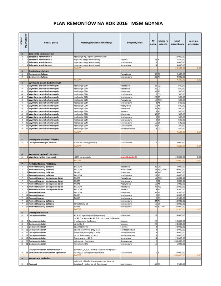 nr prac 2 2 2 2 2 2 3 3 3 3 4 4 4 4 4 4 4 4 4 4 4 4 4 4 4 4 4 nr porządkowy PLAN REMONTÓW NA ROK 2016 MSM GDYNIA Rodzaj pracy Zalecenia kominiarskie Zalecenia kominiarskie Zalecenia kominiarskie Zalecenia kominiarskie Zalecenia kominiarskie 2 Docieplenie lukarn 3 Docieplenie lukarn Docieplenie lukarn 1 2 3 4 5 6 7 8 9 10 11 12 13 20 21 22 realizacja wg. opinii komniarskich naprawa czapy kominowej naprawa czapy kominowej naprawa czapy kominowej RAZEM Sojowa Szafranowa Sezamowa Paprykowa Szafranowa 28 A 8 14 30 C8 20 A7 RAZEM Wymiana desek balkonowych Wymiana desek balkonowych Wymiana desek balkonowych Wymiana desek balkonowych Wymiana desek balkonowych Wymiana desek balkonowych Wymiana desek balkonowych Wymiana desek balkonowych Wymiana desek balkonowych Wymiana desek balkonowych Wymiana desek balkonowych Wymiana desek balkonowych Wymiana desek balkonowych Wymiana desek balkonowych Wymiana desek balkonowych Wymiana desek balkonowych realizacja GZM realizacja GZM realizacja GZM realizacja GZM realizacja GZM realizacja GZM realizacja GZM realizacja GZM realizacja GZM realizacja GZM realizacja GZM realizacja GZM realizacja GZM realizacja GZM realizacja GZM realizacja GZM Wymiana desek balkonowych RAZEM 16 000,00 1 500,00 3 000,00 5 000,00 25 500,00 0,00 2 400,00 4 800,00 7 200,00 0,00 Rdestowa Rdestowa Rdestowa Szafranowa Szafranowa Paprykowa Szafranowa Paprykowa Rdestowa Sojowa Rdestowa Szafranowa Szafranowa Szafranowa Szafranowa Serdecznikowa 29 25 35 8 27 15 8 15 35 8 35 8 8 16 24 3 D/7 C7 A5 D5 A5 A10 A8 A8 A/2 A3 B5 A7 D5 D5 A7 C22 500,00 500,00 500,00 300,00 500,00 500,00 500,00 500,00 500,00 500,00 500,00 500,00 500,00 500,00 300,00 500,00 7 600,00 0,00 Docieplenie stropu / dachu 5 Docieplenie stropu / dachu 6 6 1 Wymiana rynien i rur spust. 9 koszt po przetargu Wymiana desek balkonowych 1 Docieplenie stropu / dachu 8 8 9 Nr klatka nr koszt domu mieszk. szacunkowy Docieplenie lukarn 5 5 8 8 8 8 8 8 8 8 8 Budynek/ulica Zalecenia kominiarskie 1 2 3 4 4 6 7 7 7 7 7 7 7 7 7 7 7 7 7 7 7 7 7 8 8 Uszczegółowienie lokalizacja strop od strony piwnicy Szafranowa 4 D1 RAZEM 2 000,00 2 000,00 0,00 Wymiana rynien i rur spust. Wymiana rynien i rur spust. GZM wg potrzeb wszystk.budynki RAZEM 20 000,00 0,00 20 000,00 0,00 5 000,00 28 000,00 9 000,00 13 000,00 15 000,00 8 000,00 6 000,00 11 000,00 6 500,00 3 500,00 15 000,00 10 500,00 10 000,00 10 000,00 20 000,00 170 500,00 0,00 Remont tarasu / balkonu 1 2 3 4 5 6 7 8 9 10 11 12 19 19 19 Remont tarasu / balkonu Remont tarasu / balkonu Remont tarasu / balkonu Remont tarasu / balkonu Remont tarasu + docieplenie ścian Remont tarasu + docieplenie ścian Remont tarasu + docieplenie ścian Remont tarasu + docieplenie ścian Remont tarasu + docieplenie ścian Remont balkonu Remont tarasu Remont tarasu Remont tarasu / balkonu Remont tarasu / balkonu Remont tarasu / balkonu Remont tarasu / balkonu BALKON BALKON TARAS BALKON TARAS TARAS TARAS BALKON BALKON BALKON TARAS TARAS taras lokalu D5 balkon RAZEM Rdestowa Wrocławska Rdestowa Szafranowa Paprykowa Szafranowa Paprykowa Rdestowa Sojowa Rdestowa Szafranowa Szafranowa Szafranowa Szafranowa Lukrecjowa 25 71 35 27 15 8 15 35 8 35 8 8 24 16 45 C/7 A/2, 4 i 6 A/5 A5 A10 A8 A8 A/2 A3 B5 A7 D5 A7 D5 B7 i A8 Docieplenie ścian 4 Docieplenie ścian 7 8 9 11 12 13 17 20 21 Docieplenie ścian Docieplenie ścian Docieplenie ścian Docieplenie ścian Docieplenie ścian Docieplenie ścian Docieplenie ścian Docieplenie ścian Docieplenie ścian Docieplenie ścian balkonowych + 23 pomalowanie dwóch ścian sąsiednich Docieplenia ścian kl. A od ogrodu pokój wysunięty od kl. C w kierunku kl. B do szczytów balkonów i nad połacią dachową za klatką C ścian frontowa ściana szczytowa przy kl. A frontowa pomiędzy kl. B i C od ul. Rdestowej kl. A i D frontowa przy kl. D północna - frontowa mieszkanie D5 balkony 2,4,6,8,10 dwie ściany od odgrodu i ściany już docieplone sąsiednie RAZEM Rdestowa 25 4 000,00 Sojowa Sojowa Sojowa Serdecznikowa Serdecznikowa Serdecznikowa Sezamowa Gorczycowa Szafranowa 28 28 8 3 3 3 14 2 16 28 000,00 24 000,00 71 000,00 18 000,00 28 000,00 26 000,00 26 000,00 105 000,00 5 000,00 Szafranowa 10 B 27 000,00 362 000,00 Konserwacja dachu 2 Remont pokrycie z blachy trapezowej nad lukarną lokalu A7 - pokój od ul. Rdestowej Lukrecjowa 45 A7 2 500,00 0,00 Konserwacja dachu RAZEM 10 Wymiana okien Wymiany okien związane z remontem kl. schodowych patrz p. 26 10 11 11 wymiana okien RAZEM 1 Remont chodnika przy wiacie śmietnikowej Rdestowa 11 11 11 2 Remont chodnika 3 Remont chodnika 6 Remont chodnika wzdłuż budynku od strony ulicy Paprykowej przed budynkiem dojścia i wzdłuż ulicy równolegle do ulicy Paprykowa Serdecznikowa Szafranowa 11 Remont chodnika 12 12 12 13 13 13 13 13 13 13 13 13 14 14 14 15 Budowa śmietnika 9 15 15 15 16 16 16 17 17 17 17 17 18 18 18 19 19 19 20 20 20 24 24 24 26 2 500,00 0,00 0,00 0,00 Remont chodnika 1 Budowa śmietnika Budowa śmietnika 33/35 1 000,00 9 3 20 RAZEM 55 000,00 13 000,00 4 500,00 73 500,00 0,00 RAZEM 0,00 0,00 10 185,00 10 815,00 12 180,00 9 975,00 7 350,00 7 455,00 13 755,00 71 715,00 0,00 5 000,00 5 000,00 0,00 32 000,00 10 400,00 42 400,00 0,00 Wymiana wodomierzy 1 2 3 4 5 6 7 Wymiana wodomierzy Wymiana wodomierzy Wymiana wodomierzy Wymiana wodomierzy Wymiana wodomierzy Wymiana wodomierzy Wymiana wodomierzy Wymiana wodomierzy z odczyt.radio. 97 szt.x105 zł z odczyt.radio. 103 szt.x105 zł z odczyt.radio. 116 szt.x105 zł z odczyt.radio. 95 szt.x105 zł z odczyt.radio. 70 szt.x105 zł z odczyt.radio. 71 szt.x105 zł z odczyt.radio. 131 szt.x105 zł RAZEM Serdecznikowa Serdecznikowa Sojowa Szafranowa Szafranowa Szafranowa Rdestowa przegląd gazowy RAZEM wszystkie budynki 1 3 6 18 22 24 35 Przegląg gazowy 1 Przegląd gazowy Wymiana zaworów podpion. CO Wymiana zaworów podpion. CO lub grzejnikowych Danfoss Dynamic Valve RA1 DV 1 Remont węzłów Wymiana zaworów podpion. CO Szafranowa Dąbrówka B 6 RAZEM Wymiana zaworów podpion. C.W. 1 