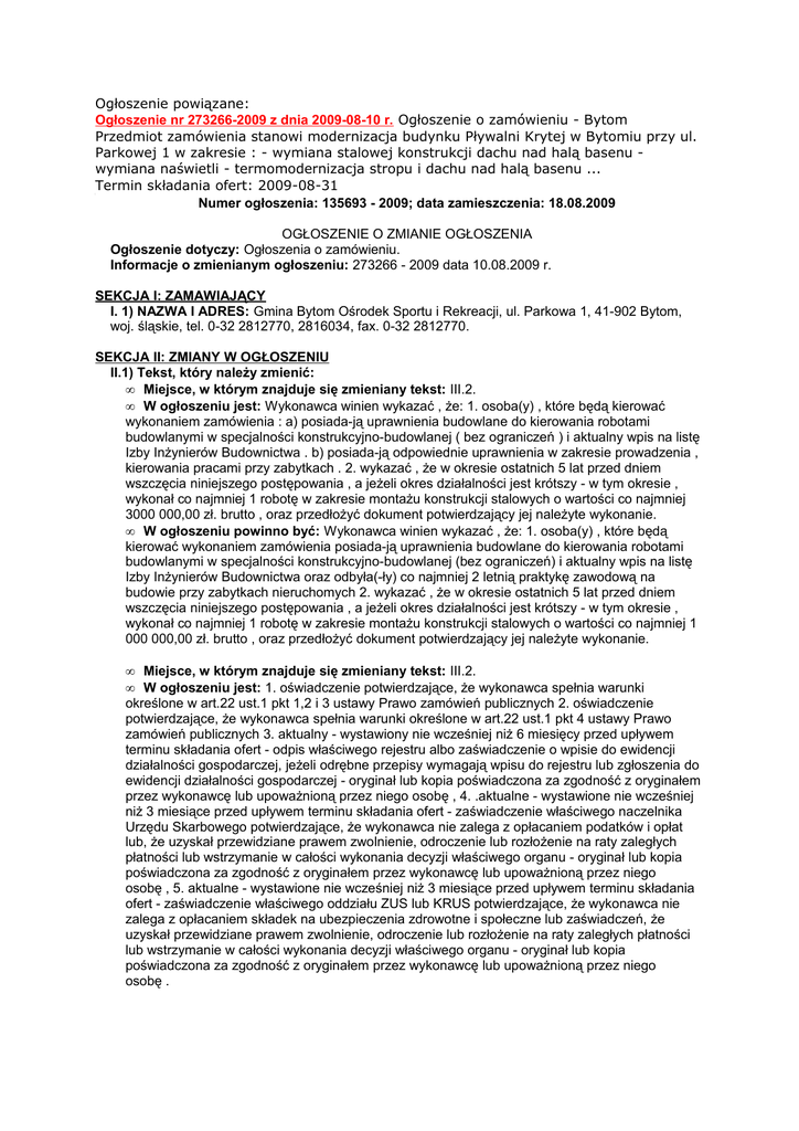 Ogłoszenie powiązane: Ogłoszenie nr 273266-2009 z dnia 2009-08-10 r. Ogłoszenie o zamówieniu - Bytom Przedmiot zamówienia stanowi modernizacja budynku Pływalni Krytej w Bytomiu przy ul. Parkowej 1 w zakresie : - wymiana stalowej konstrukcji dachu nad halą basenu wymiana naświetli - termomodernizacja stropu i dachu nad halą basenu ... Termin składania ofert: 2009-08-31 Numer ogłoszenia: 135693 - 2009; data zamieszczenia: 18.08.2009 OGŁOSZENIE O ZMIANIE OGŁOSZENIA Ogłoszenie dotyczy: Ogłoszenia o zamówieniu. Informacje o zmienianym ogłoszeniu: 273266 - 2009 data 10.08.2009 r. SEKCJA I: ZAMAWIAJĄCY I. 1) NAZWA I ADRES: Gmina Bytom Ośrodek Sportu i Rekreacji, ul. Parkowa 1, 41-902 Bytom, woj. śląskie, tel. 0-32 2812770, 2816034, fax. 0-32 2812770. SEKCJA II: ZMIANY W OGŁOSZENIU II.1) Tekst, który należy zmienić: • Miejsce, w którym znajduje się zmieniany tekst: III.2. • W ogłoszeniu jest: Wykonawca winien wykazać , że: 1. osoba(y) , które będą kierować wykonaniem zamówienia : a) posiada-ją uprawnienia budowlane do kierowania robotami budowlanymi w specjalności konstrukcyjno-budowlanej ( bez ograniczeń ) i aktualny wpis na listę Izby Inżynierów Budownictwa . b) posiada-ją odpowiednie uprawnienia w zakresie prowadzenia , kierowania pracami przy zabytkach . 2. wykazać , że w okresie ostatnich 5 lat przed dniem wszczęcia niniejszego postępowania , a jeżeli okres działalności jest krótszy - w tym okresie , wykonał co najmniej 1 robotę w zakresie montażu konstrukcji stalowych o wartości co najmniej 3000 000,00 zł. brutto , oraz przedłożyć dokument potwierdzający jej należyte wykonanie. • W ogłoszeniu powinno być: Wykonawca winien wykazać , że: 1. osoba(y) , które będą kierować wykonaniem zamówienia posiada-ją uprawnienia budowlane do kierowania robotami budowlanymi w specjalności konstrukcyjno-budowlanej (bez ograniczeń) i aktualny wpis na listę Izby Inżynierów Budownictwa oraz odbyła(-ły) co najmniej 2 letnią praktykę zawodową na budowie przy zabytkach nieruchomych 2. wykazać , że w okresie ostatnich 5 lat przed dniem wszczęcia niniejszego postępowania , a jeżeli okres działalności jest krótszy - w tym okresie , wykonał co najmniej 1 robotę w zakresie montażu konstrukcji stalowych o wartości co najmniej 1 000 000,00 zł. brutto , oraz przedłożyć dokument potwierdzający jej należyte wykonanie. • Miejsce, w którym znajduje się zmieniany tekst: III.2. • W ogłoszeniu jest: 1. oświadczenie potwierdzające, że wykonawca spełnia warunki określone w art.22 ust.1 pkt 1,2 i 3 ustawy Prawo zamówień publicznych 2. oświadczenie potwierdzające, że wykonawca spełnia warunki określone w art.22 ust.1 pkt 4 ustawy Prawo zamówień publicznych 3. aktualny - wystawiony nie wcześniej niż 6 miesięcy przed upływem terminu składania ofert - odpis właściwego rejestru albo zaświadczenie o wpisie do ewidencji działalności gospodarczej, jeżeli odrębne przepisy wymagają wpisu do rejestru lub zgłoszenia do ewidencji działalności gospodarczej - oryginał lub kopia poświadczona za zgodność z oryginałem przez wykonawcę lub upoważnioną przez niego osobę , 4. .aktualne - wystawione nie wcześniej niż 3 miesiące przed upływem terminu składania ofert - zaświadczenie właściwego naczelnika Urzędu Skarbowego potwierdzające, że wykonawca nie zalega z opłacaniem podatków i opłat lub, że uzyskał przewidziane prawem zwolnienie, odroczenie lub rozłożenie na raty zaległych płatności lub wstrzymanie w całości wykonania decyzji właściwego organu - oryginał lub kopia poświadczona za zgodność z oryginałem przez wykonawcę lub upoważnioną przez niego osobę , 5. aktualne - wystawione nie wcześniej niż 3 miesiące przed upływem terminu składania ofert - zaświadczenie właściwego oddziału ZUS lub KRUS potwierdzające, że wykonawca nie zalega z opłacaniem składek na ubezpieczenia zdrowotne i społeczne lub zaświadczeń, że uzyskał przewidziane prawem zwolnienie, odroczenie lub rozłożenie na raty zaległych płatności lub wstrzymanie w całości wykonania decyzji właściwego organu - oryginał lub kopia poświadczona za zgodność z oryginałem przez wykonawcę lub upoważnioną przez niego osobę . 6. dokumenty stwierdzające , że osoba-y , które będą uczestniczyć w wykonaniu zamówienia , posiadają wymagane uprawnienia , jeżeli ustawy nakładają obowiązek posiadania takich uprawnień oryginał lub kopia poświadczona za zgodność z oryginałem przez wykonawcę lub upoważnioną przez niego osobę, 7. wykaz wykonanych robót budowlanych w okresie ostatnich 5 lat przed dniem wszczęcia postępowania o udzielenie zamówienia , a jeżeli okres prowadzenia jest krótszy - w tym okresie , odpowiadających swoim rodzajem i wartością robotom budowlanym stanowiącym przedmiot zamówienia z podaniem ich wartości oraz daty i miejsca wykonywania oraz załączeniem dokumentów potwierdzających , że roboty te zostały wykonane należycie - oryginał lub kopia dokumentu potwierdzającego należyte wykonanie roboty poświadczona za zgodność z oryginałem przez wykonawcę lub upoważnioną przez niego osobę, oraz - jeżeli dotyczy ( tj. jeżeli Wykonawca przy realizacji zamówienia będzie wykorzystywał osoby zdolne do wykonania zamówienia i/lub potencjał techniczny innych podmiotów ) : 8. pisemne zobowiązanie innych podmiotów do udostępniania potencjału technicznego i osób zdolnych do wykonania zamówienia. • W ogłoszeniu powinno być: 1. oświadczenie potwierdzające, że wykonawca spełnia warunki określone w art.22 ust.1 pkt 1,2 i 3 ustawy Prawo zamówień publicznych 2. oświadczenie potwierdzające, że wykonawca spełnia warunki określone w art.22 ust.1 pkt 4 ustawy Prawo zamówień publicznych 3. aktualny - wystawiony nie wcześniej niż 6 miesięcy przed upływem terminu składania ofert - odpis właściwego rejestru albo zaświadczen