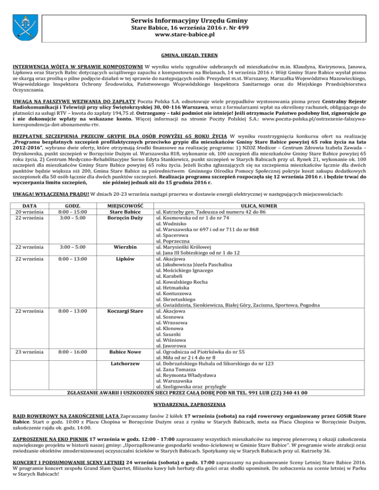 Serwis Informacyjny Urzędu Gminy Stare Babice, 16 września 2016 r. Nr 499 www.stare-babice.pl GMINA, URZĄD, TEREN INTERWENCJA WÓJTA W SPRAWIE KOMPOSTOWNI W wyniku wielu sygnałów odebranych od mieszkańców m.in. Klaudyna, Kwirynowa, Janowa, Lipkowa oraz Starych Babic dotyczących uciążliwego zapachu z kompostowni na Bielanach, 14 września 2016 r. Wójt Gminy Stare Babice wysłał pismo ze skargą oraz prośbą o pilne podjęcie działań w tej sprawie do następujących osób: Prezydent m.st. Warszawy, Marszałka Województwa Mazowieckiego, Wojewódzkiego Inspektora Ochrony Środowiska, Państwowego Wojewódzkiego Inspektora Sanitarnego oraz do Miejskiego Przedsiębiorstwa Oczyszczania. UWAGA NA FAŁSZYWE WEZWANIA DO ZAPŁATY Poczta Polska S.A. odnotowuje wiele przypadków wystosowania pisma przez Centralny Rejestr Radiokomunikacji i Telewizji przy ulicy Świętokrzyskiej 30, 00-116 Warszawa, wraz z formularzami wpłat na określony rachunek, obligującego do płatności za usługi RTV – kwota do zapłaty 194,75 zł. Ostrzegamy – taki podmiot nie istnieje! Jeśli otrzymacie Państwo podobny list, zignorujcie go i nie dokonujcie wpłaty na wskazane konto. Więcej informacji na stronie Poczty Polskiej S.A.: www.poczta-polska.pl/ostrzezenie-falszywakorespondencja-dot-abonamentu-rtv. BEZPŁATNE SZCZEPIENIA PRZECIW GRYPIE DLA OSÓB POWYŻEJ 65 ROKU ŻYCIA W wyniku rozstrzygnięcia konkursu ofert na realizację „Programu bezpłatnych szczepień profilaktycznych przeciwko grypie dla mieszkańców Gminy Stare Babice powyżej 65 roku życia na lata 2012-2016”, wybrano dwie oferty, które otrzymają środki finansowe na realizację programu: 1) NZOZ Medicor – Centrum Zdrowia Izabela Zawada – Drynkowska, punkt szczepień w Borzęcinie Dużym ul. Warszawska 818, wykonanie ok. 100 szczepień dla mieszkańców Gminy Stare Babice powyżej 65 roku życia, 2) Centrum Medyczno-Rehabilitacyjne Sorno Edyta Stankiewicz, punkt szczepień w Starych Babicach przy ul. Rynek 21, wykonanie ok. 100 szczepień dla mieszkańców Gminy Stare Babice powyżej 65 roku życia. Jeżeli liczba zgłaszających się na szczepienia mieszkańców łącznie dla dwóch punktów będzie większa niż 200, Gmina Stare Babice za pośrednictwem Gminnego Ośrodka Pomocy Społecznej pokryje koszt zakupu dodatkowych szczepionek dla 50 osób łącznie dla dwóch punktów szczepień. Realizacja programu szczepień rozpoczęła się 12 września 2016 r. i będzie trwać do wyczerpania limitu szczepień, nie później jednak niż do 15 grudnia 2016 r. UWAGA! WYŁĄCZENIA PRĄDU! W dniach 20-23 września nastąpi przerwa w dostawie energii elektrycznej w następujących miejscowościach: DATA 20 września 22 września 22 września 22 września 22 września 23 września GODZ. 8:00 – 15:00 3:00 – 5:00 MIEJSCOWOŚĆ Stare Babice Borzęcin Duży ULICA, NUMER ul. Kutrzeby gen. Tadeusza od numeru 42 do 86 ul. Kosmowska od nr 1 do nr 74 ul. Wodnisko ul. Warszawska nr 697 i od nr 711 do nr 868 ul. Spacerowa ul. Poprzeczna 3:00 – 5:00 Wierzbin ul. Marysieńki Królowej ul. Jana III Sobieskiego od nr 1 do 12 8:00 – 13:00 Lipków ul. Akacjowa ul. Jakubowicza Józefa Paschalisa ul. Mościckiego Ignacego ul. Karabeli ul. Kowalskiego Rocha ul. Hetmańska ul. Kontuszowa ul. Skrzetuskiego ul. Gwiaździsta, Sienkiewicza, Białej Góry, Zaciszna, Sportowa, Pogodna 8:00 – 13:00 Koczargi Stare ul. Akacjowa ul. Sosnowa ul. Wrzosowa ul. Klonowa ul. Sasanki ul. Wiśniowa ul. Jaworowa 8:00 – 16:00 Babice Nowe ul. Ogrodnicza od Piotrkówka do nr 55 ul. Miła od nr 2 i 4 do nr 8 Latchorzew ul. Dobrzańskiego Hubala od Sikorskiego do nr 123 ul. Zana Tomasza ul. Reymonta Władysława ul. Warszawska ul. Szeligowska oraz przyległe ZGŁASZANIE AWARII I USZKODZEŃ SIECI PRZEZ CAŁĄ DOBĘ POD NR TEL. 991 LUB (22) 340 41 00 WYDARZENIA, ZAPROSZENIA RAJD ROWEROWY NA ZAKOŃCZENIE LATA Zapraszamy fanów 2 kółek 17 września (sobota) na rajd rowerowy organizowany przez GOSiR Stare Babice. Start o godz. 10:00 z Placu Chopina w Borzęcinie Dużym oraz z rynku w Starych Babicach, meta na Placu Chopina w Borzęcinie Dużym, zakończenie rajdu ok. godz. 14:00. ZAPROSZENIE NA EKO PIKNIK 17 września w godz. 12:00 - 17:00 zapraszamy wszystkich mieszkańców na imprezę plenerową z okazji zakończenia największego projektu w historii naszej gminy: „Uporządkowanie gospodarki wodno-ściekowej w Gminie Stare Babice". W programie wiele atrakcji oraz zwiedzanie obiektów zmodernizowanej oczyszczalni ścieków w Starych Babicach. Spotykamy się w Starych Babicach przy ul. Kutrzeby 36. KONCERT I PODSUMOWANIE SCENY LETNIEJ 24 września (sobota) o godz. 17:00 zapraszamy na podsumowanie Sceny Letniej Stare Babice 2016. W programie koncert zespołu Grand Slam Quartet, filiżanka kawy lub herbaty dla gości oraz słodki upominek. Do zobaczenia na scenie letniej w Parku w Starych Babicach!