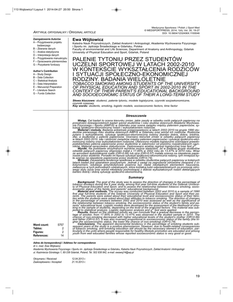 113 Wojtowicz1:Layout 1 2014-04-27 20:50 Strona 1 Medycyna Sportowa / Polish J Sport Med © MEDSPORTPRESS, 2014; 1(4); Vol. 30, 19-27 DOI: 10.5604/1232406X.1100046 ARTYKUŁ ORYGINALNY / ORIGINAL ARTICLE Zaangażowanie Autorów A – Przygotowanie projektu badawczego B – Zbieranie danych C – Analiza statystyczna D – Interpretacja danych E – Przygotowanie manuskryptu F – Opracowanie piśmiennictwa G – Pozyskanie funduszy Author’s Contribution A – Study Design B – Data Collection C – Statistical Analysis D – Data Interpretation E – Manuscript Preparation F – Literature Search G – Funds Collection Ewa Wójtowicz Katedra Nauk Przyrodniczych, Zakład Anatomii i Antropologii, Akademia Wychowania Fizycznego i Sportu im. Jędrzeja Śniadeckiego w Gdańsku, Polska Faculty of environmental and Life Sciences, Department of Anatomy and Anthropology, Gdańsk University of Physical Education and Sport, Gdańsk, Poland PALENIE TYTONIU PRZEZ STUDENTÓW UCZELNI SPORTOWEJ W LATACH 2002-2010 W KONTEKŚCIE WYKSZTAŁCENIA RODZICÓW I SYTUACJI SPOŁECZNO-EKONOMICZNEJ RODZINY. BADANIA WIELOLETNIE TOBACCO SMOKING AMONG STUDENTS OF THE UNIVERSITY OF PHYSICAL EDUCATION AND SPORT IN 2002-2010 IN THE CONTEXT OF THEIR PARENT’S EDUCATIONAL BACKGROUND AND SOCIOECONOMIC STATUS OF THEIR A LONG-TERM STUDY Słowa kluczowe: studenci, palenie tytoniu, modele logistyczne, czynniki socjoekonomiczne, czynnik czasowy Key words: students, smoking, logistic models, socioeconomic factors, time factor Streszczenie Wstęp. Cel badań to ocena kierunku zmian, jakie zaszły w odsetku osób palących papierosy na przestrzeni dziewięcioletnich badań wśród studentów I roku studiów dziennych Akademii Wychowania Fizycznego i Sportu (AWFiS) w Gdańsku oraz ocena związku między paleniem papierosów, sytuacją społeczno-ekonomiczną rodzin i wykształceniem rodziców. Materiał i metody. Badania ankietowe przeprowadzono w latach 2002-2010 na grupie 1990 studentów pierwszego roku studiów dziennych AWFiS w Gdańsku oraz wśród ich rodziców. Rodziców pytano o wykształcenie, sytuację społeczno-ekonomiczną rodziny (bardzo dobra, dobra, średnia, zła), a studentów o palenie papierosów. Oceniano kierunek zmian w odsetku palących papierosy w latach 2002-2010, siłę i istotność związków między paleniem papierosów i sytuacją społeczno-ekonomiczną rodziny oraz wykształceniem rodziców. Utworzono modele logistyczne oceniające prawdopodobieństwo palenia papierosów przez studentów w zależności od poziomu rozpatrywanych czynników. Materiał opracowano statystycznie. Zastosowano analizę regresji logistycznej oraz test χ2. Wyniki. Na podstawie otrzymanych wyników można stwierdzić, że w badanej grupie studentów odsetek palących papierosy stopniowo malał z 17,95% w 2002 roku do 13,47% w 2010 roku. Wraz ze wzrostem wykształcenia matki (OR=0,66) lub ojca (OR=0,57) malała szansa na niepalenie papierosów przez studenta. Ponadto im lepsza sytuacja społeczno-ekonomiczna rodziny, tym mniejsza była szansa na niepalenie papierosów przez studenta (OR=0,74). Wnioski. Zauważalna tendencja spadkowa w odsetku studentów palących papierosy w kolejnych latach badań jest zjawiskiem pozytywnym. Jednak z uwagi na zagrożenia zdrowotne związane z nikotynizmem, edukacja antynikotynowa powinna być nadal niezbędnym elementem nauczania, zwłaszcza w tych jednostkach oświatowych, które kształcą ludzi odpowiedzialnych za promocję zdrowego stylu życia oraz wśród młodzieży pochodzącej z dobrze wykształconych rodzin deklarujących bardzo dobrą i dobrą sytuację społeczno-ekonomiczną. Summary Word count: Tables: Figures: References: 5757 2 2 14 Background. The goal of the study was to assess the direction of changes in the percentage of tobacco smokers during the 9 year study, among first year full-time students of the Gdansk University of Physical Education and Sport, and to assess the relationship between tobacco smoking, socioeconomic status of the family and parents” educational background. Material and methods. The survey was conducted between 2002 and 2010 in a sample of 1990 first year full-time students of the Gdansk University of Physical Education and Sport and their parents. The parents were asked about their educational level and socioeconomic status of their families while the students were asked about their attitudes to tobacco smoking. The direction of changes in the percentage of smokers between 2002 and 2010 was assessed as well as the significance of the relationship between tobacco smoking, the socioeconomic status of the student’s family and parents” educational level. Logistic models were developed for the assessment of the likelihood of smoking in the sample of students, depending on the level of the analyzed factors. The material was subjected to statistical analysis. Logistic regression analysis and χ2 test were applied. Results. Based on the obtained results we can conclude that a gradual decrease in the percentage of smoker, from 17.95% in 2002 to 13.47% was observed in the studied sample in 2010. The chance of non-smoking decreased with higher educational levels of the student’s mother (OR=0.66) and father (OR=0.57). It was also inversely proportional to socioeconomic status of the family (the higher the socioeconomic status, the lower the chance of non-smoking) (OR=0,74). Conclusions. The apparent decremental tendency in the percentage of smoking students subsequent years of the study is a positive phenomenon. However, due to health-related consequences of tobacco smoking, anti-smoking education still should be the necessary element of education, particularly in the units where people responsible for healthy lifestyle promotion are educated and among youth from well educated families whose reported socioeconomic status is very good or good. Adres do korespondencji / Address for correspondence dr n. med. Ewa Wójtowicz Akademia Wychowania Fizycznego i