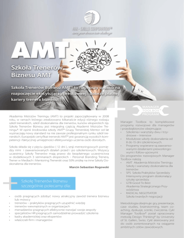 AMT Szkoła Trenerów Biznesu AMT Szkoła Trenerów Biznesu AMT® to najlepszy sposób na rozpoczęcie ekscytującej, prestiżowej i dobrze płatnej kariery trenera biznesu!!! Akademia Mistrzów Treningu (AMT) to projekt zapoczątkowany w 2008 roku, w ramach którego zrealizowano kilkanaście edycji różnego rodzaju szkół trenerskich, szkół doskonalenia dla trenerów, kursów eksperckich itp. Szkoła Trenerów Biznesu jest integralną częścią Akademii Mistrzów Treningu®. W opinii środowiska szkoły AMT® Grupy Trenerskiej Mentor od lat wyznaczają nowy standard na nie zawsze profesjonalnym rynku szkół trenerskich. Europejski certyfikat trenerski AMT® jest gwarancją wysokich kompetencji i faktycznej umiejętności efektywnego uczenia osób dorosłych. Szkoła składa się z pięciu zjazdów ( 12 dni ), sesji mentoringowych pomiędzy nimi i zaawansowanych działań przed i po szkoleniowych. Wszyscy uczestnicy Szkoły Trenerów mają prawo do bezpłatnego uczestnictwa w dodatkowych 3 seminariach eksperckich – Personal Branding Trenera, Trener w Mediach i Mentoring Trenerski oraz 50% zniżkę na inne Szkoły Doskonalenia dla trenerów. Marcin Sebastian Rogowski Szkołę Trenerów Biznesu szczególnie polecamy dla: • • • • • • • osób pragnących zdobyć nowy atrakcyjny zawód trenera biznesu lub mówcy trenerów – praktyków pragnących uzupełnić wiedzę trenerów wewnętrznych w organizacjach menadżerów pragnących efektywnie rozwijać swoje zespoły specjalistów HR pragnących samodzielnie prowadzić szkolenia kadry akademickiej oraz ekspertów właścicieli firm i managerów Manager Toolbox to kompleksowe programy rozwojowe dla managerów i przedsiębiorców obejmujące: • Szkolenia i warsztaty dwu i trzydniowe – Intensive • Modułowe szkoły doskonalenia od 8 do 15 dni szkoleniowych. • Programy wspierane są zaawansowanymi działaniami preworkingowymi i follow-upowymi Do programów rozwojowych Manager Toolbox należą: • AMT Akademia Mistrzów Treningu Szkoły i warsztaty doskonalenia dla trenerów • SPS Szkoła Praktyków Sprzedaży Intensywny program doskonalący sztukę sprzedaży. • GTB Good To Best Akademia Strategicznego Przywództwa • RADICAL NEGOTIATOR Szkoła twardych negocjacji Metodologia obejmuje: gry, prezentacje, case studies, brainstorming, team coaching, dyskusje, scenki, ćwiczenia. Cykl Manager Toolbox® został opracowany metodą Design Thinking® by University of St. Gallen, Swiss. Cykl skierowany jest do osób zorientowanych na osiąganie ambitnych celów zawodowych. Rekomendacje: „Akademia Mistrzów Treningu pozwoliła mi całościowo spojrzeć na proces szkoleniowy - od projektowania szkolenia po zbadanie jego efektywności. Przekazana wiedza i zdobyte umiejętności trenerskie zostały spięte pewną klamrą – myśleniem o rozwoju siebie jako człowieka i jako trenera. Wiem, że mój rozwój zawodzie trenera to dopiero początek drogi, wiem, że pewnych rzeczy nie wiem, ale również wiem, że mam solidną podstawę, na której mogę rozwinąć swój indywidualny styl trenerski.” Katarzyna Baczyńska-Koc – Wiceprezes Zarządu Podlaskiej Fundacji RR „AMT to korzyści z różnorodności(INSIGHTS), wzmocnienie „ja wewnętrznego” w trudnych sytuacjach szkoleniowych, inspirowanie do ustawicznego kształcenia się i uczenia się od każdego, wielkie serce Niny, Krzysztofa!!! Dziękuję ślicznie za WSZYSTKO” Jakub Lewandowski- właściciel, PASJA Grupa Dobrych Trenerów Korzyści dla uczestnika „…Program okazał się Gwiazdką Z Nieba, nieocenionym wsparciem podczas pełnego dla mnie wyzwań okresu budowania własnej firmy szkoleniowej. Ten intensywny dla mnie czas przetrwałam pozytywnie między innymi dzięki temu, co uzyskałam w AMT :-) (…) Program dał mi większy wgląd w siebie samą i mój styl trenerski, refleksje nad własnym działaniem i sobą samą w roli trenera. Monika Chutnik • Nabędziesz sprawdzoną, popartą 8 edycjami AMT wiedzę, niezbędną do samodzielnego przygotowania, prowadzenia i ewaluacji szkoleń. • Uzyskasz możliwość praktycznego, warsztatowego przećwiczenia zdobytych umiejętności w trakcie 5-ciu, dwu i trzydniowych zjazdów. Otrzymasz mentoring uznanych i utytułowanych trenerów, właścicieli firm szkoleniowych, pracujących z największymi korporacjami w Polsce. • • Uzyskasz gotowy plan rozwoju własnej kariery w zawodzie trenera biznesu. • Otrzymasz Europejski certyfikat trenerski, zgodny z Europejską Normą Kwalifikacji na poziomie 5, • Uzyskasz możliwość odpłatnej praktyki, poprzez przygotowywanie i współprowadzenie szkoleń organizowanych przez GT Mentor i ARK – Skills Corporation™. • Przeprowadzisz dogłębną analizę własnego profilu osobowościowego, zasobów i deficytów dzięki profesjonalnemu narzędziu Insights Discovery™ • Nawiążesz ciekawe kontakty i uzyskasz polecenia w środowisku trenerskim. „Mój udział w Akademii od początku traktowałam jako szczególne wyróżnienie. (…) Bardzo chciałam wejść do tego elitarnego grona Mistrzów Treningu i nie zawiodłam się. Od pierwszego warsztatu wiedziałam, że mój czas zostanie właściwie zainwestowany. (…) Ponadto poznałam Wielkie Osobowości Trenerskie, od których nadal mogę się uczyć. Udział w AMT dał mi większe poczucie własnej wartości, nowe kontakty, inspiracje oraz odkrył nowe możliwości, które już wykorzystuję w pracy i życiu.” Beata Kozak „Cieszę się bardzo, że miałem zaszczyt i przyjemność poznać wspaniałych ludzi z Grupy Trenerskiej MENTOR uczestnicząc w projekcie AMT. Nina, Krzysztof, Michał, i Marta dostarczyli dodatkowych inspiracji aby działać nie dla czegoś tylko pomimo wszystko. Rozwijaj się i poznawaj nowych LUDZI, dziel się z nimi optymizmem, radością ...... PODAJ DALEJ” Krzysztof Polniaszek „Udział w Akademii Mistrzów Treningu” był dla mnie okazją do poznania wielu wspaniałych osób. 