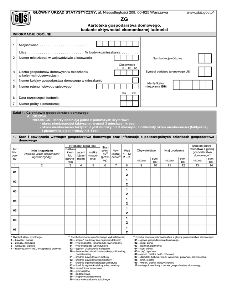 GŁÓWNY URZĄD STATYSTYCZNY, al. Niepodległości 208, 00-925 Warszawa www.stat.gov.pl ZG Kartoteka gospodarstwa domowego, badanie aktywności ekonomicznej ludności INFORMACJE OGÓLNE 1 Miejscowość . . . . . . . . . . . . . . . . . . . . . . . Ulica . . . . . . . . . . . . . . . . . . . . . . . . . 2 Nr budynku/mieszkania . . . . . . . . Numer mieszkania w województwie z losowania Symbol województwa I 3 Liczba gospodarstw domowych w mieszkaniu w kolejnych obserwacjach 4 Numer kolejny gospodarstwa domowego w mieszkaniu 5 Numer rejonu i obwodu spisowego 6 Data rozpoczęcia badania 7 Numer próby elementarnej Obserwacje II III IV Symbol oddziału terenowego US Identyfikator mieszkania IDM rok kw. Dział 1. Członkowie gospodarstwa domowego A. OBECNI NIEOBECNI, którzy spełniają jedno z poniższych kryteriów: - okres nieobecności faktycznej wynosi 3 miesiące i krócej, - okres nieobecności faktycznie jest dłuższy niż 3 miesiące, a całkowity okres nieobecności (faktycznej i planowanej) jest krótszy niż 1 rok. 1. Stan i powiązania wewnątrz gospodarstwa domowego oraz informacje o poszczególnych członkach gospodarstwa domowego Nr kol. osoby Imię i nazwisko (wpisać, jeżeli respondent wyraził zgodę) 1 2 a) Nr osoby, która jest Stan małżoncywil- WyPłeć kiem ojcem matką nya) kształ- 1 – M lub (ojczy- (maco(praw- cenieb) 2 – K partne- mem) chą) ny) rem 3 4 5 6 7 8 01 1 2 02 1 2 03 1 2 04 1 2 05 1 2 06 1 2 07 1 2 Symbol stanu cywilnego: 1 – kawaler, panna 2 – żonaty, zamężna 3 – wdowiec, wdowa 4 – rozwiedziony(-na), w separacji prawnej b) Symbol poziomu ukończonego wykształcenia: 00 – stopień naukowy (co najmniej doktora) 10 – tytuł magistra, lekarza lub równorzędny 11 – tytuł licencjata lub inżyniera 12 – dyplom ukończenia kolegium 20 – świadectwo ukończenia szkoły policealnej, pomaturalnej 31 – średnie zawodowe z maturą 32 – średnie zawodowe bez matury 41 – średnie ogólnokształcące z maturą 42 – średnie ogólnokształcące bez matury 50 – zasadnicze zawodowe 60 – gimnazjalne 70 – podstawowe 80 – niepełne podstawowe 90 – bez wykształcenia szkolnego Obywatelstwo nazwa 9 c) symbol 10 Kraj urodzenia nazwa 11 symbol 12 Stopień pokrewieństwa z głową gospodarstwa domowegoc) symnazwa bol 13 14 Symbol stopnia pokrewieństwa z głową gospodarstwa domowego: 01 – głowa gospodarstwa domowego 02 – mąż, żona 03 – partner, partnerka 04 – syn, córka 05 – zięć, synowa 06 – ojciec, matka, teść, teściowa 07 – dziadek, babcia, wnuk, wnuczka, prawnuk, prawnuczka 08 – brat, siostra 09 – wujek, ciotka, dalszy krewny 10 – niespokrewniony członek gospodarstwa domowego 2. Dodatkowe informacje o poszczególnych członkach gospodarstwa domowego rok dzień miesiąc Data Czy urodzenia w bieżącym roku miał(a) Pan/ Pani już Nr uroNr obdziny? oso- ser1 – tak by wa2 – nie cji Okres przebywania w Polsce StoGdzie Pan/Pani mieszpieńd) planokał(a) rok temu? nief) wany pełno(łącznie 1 - w tej samej gminie sprawz fakty- 2 - w innej gminie, ale w ności tym samym cznym) (wpiwojewództwie [wypełsać, faktynić tylko 3 - w innym jeżeli cznye) województwie dla osób (wypełnić respon(nazwa/symbol) tylko w przebyprzypadku dent wających 4 - w innym kraju wyraził braku (nazwa/symbol) w Polsce informacji zgodę) krócej niż dot. miesiąca 1 rok] Okres nieobecności w gospodarstwie domowym faktyczny (w miesiącach) planowanyg) (łącznie z faktycznym) 9 10 Miejsce pobytu osoby nieobecnej Przyczyna nieobecnościh) (przebywającej w Polsce - nazwa Uczestwojewództwa Nr nictwo i miejscowości ankiety w baoraz symbol ZD daniui) terytorialny miejscowości; przebywającej za granicą - nazwa i symbol kraju) urodzenia) 1 2 3 4 5 6 7 8 11 12 13 14 I II 01 III IV I II 02 III IV I II 03 III IV I II 04 III IV I II 05 III IV I II 06 III IV I II 07 III IV d) Symbol stopnia niepełnosprawności: 1 – orzeczenie o znacznym stopniu niepełnosprawności lub równoważne, 2 – orzeczenie o umiarkowanym stopniu niepełnosprawności lub równoważne, 3 – orzeczenie o lekkim stopniu niepełnosprawności lub równoważne, 9 – brak aktualnego orzeczenia o stopniu niepełnosprawności lub równoważnego; dziecko poniżej 16 lat. e) Symbol faktycznego okresu przebywania w Polsce: 3 miesiące lub krócej – symb. 98; dłużej niż 3 miesiące, ale krócej niż 1 rok – symb. 97; 1 rok lub dłużej – dokładna liczba lat (z zakresu 01 – 96); od urodzenia – symb. 00. f) Symbol planowanego okresu przebywania w Polsce: krócej niż 12 miesięcy – dokładna liczba miesięcy; 1 rok lub dłużej – symb. 12. g) Symbol planowanego okresu nieobecności: krócej niż 12 miesięcy – dokładna liczba miesięcy; 1 rok lub dłużej – symb. 12. Uwaga: Symb. 12 może wystąpić tylko w przypadku, kiedy okres nieobecności faktycznej nie przekracza 3 miesięcy. W przypadku gdy okres nieobecności faktycznej jest dłuższy niż 3 miesiące i osoba planuje przebywać poza gospodarstwem domowym (nieobecność faktyczna i planowana) 1 rok lub dłużej, ankieter powinien spisać tę osobę w części B lub C Kartoteki ZG. h) Symbol przyczyny nieobecności: na terenie Polski w gospodarstwach zbiorowych w związku z: 1 – wykonywaniem pracy przebywa w hotelu robotniczym; 2 – nauką przebywa w internacie, bursie, domu studenckim; 3 – innymi przyczynami (przebywa w domu pomocy społecznej, domu rencistów, domu dziecka, zakładzie wychowawczym, zakładzie dla przewlekle chorych itp.); na terenie Polski poza gospodarstwami zbiorowymi w związku z: 4 – wykonywaniem pracy; 5 – innymi przyczynami (np. pobyt w szpitalu); za granicą w związku z: 6 – wykonywaniem pracy; 7 – poszukiwaniem pracy; 8 – nauką; 9 – innymi przyczynami. i) Symbol uczestnictwa w badaniu: 1 – jest ankieta ZD; 2 – nieobecny(-na), brak ankiety ZD; 3 – odmówił(a) wywiadu, brak ankiety ZD; 4 – przybył(a), jest ankieta ZD; 5 – p