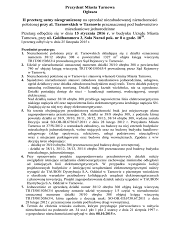 Prezydent Miasta Tarnowa Ogłasza II przetarg ustny nieograniczony na sprzedaż niezabudowanej nieruchomości położonej przy al. Tarnowskich w Tarnowie przeznaczonej pod budownictwo mieszkaniowe jednorodzinne Przetarg odbędzie się w dniu 15 stycznia 2016 r. w budynku Urzędu Miasta Tarnowa, przy ul. Goldhammera 3, Sala Narad pok. nr 8 o godz. 1020. I przetarg odbył się w dniu 25 listopada 2015 r. Przedmiot przetargu: 1. Nieruchomość położona przy al. Tarnowskich składająca się z działki oznaczonej numerem 38/12 obrębu 308 o powierzchni 1327 m2 objęta księgą wieczystą TR1T/00150363/4 prowadzoną przez Sąd Rejonowy w Tarnowie. 2. Udział w nieruchomości oznaczonej numerem działki 38/10 obrębu 308 o powierzchni 740 m2 objętej księgą wieczystą TR1T/00150363/4 prowadzoną przez Sąd Rejonowy w Tarnowie. 3. Nieruchomości położone są w Tarnowie i stanowią własność Gminy Miasta Tarnowa. 4. Sąsiedztwo nieruchomości stanowi zabudowa mieszkaniowa jednorodzinna, usługowa, ogród działkowy oraz działka zabudowana budynkiem stacji trafo. Teren działek pokryty naturalną roślinnością trawiastą. Działki mają kształt wieloboku, nie sa ogrodzone. Działki posiadają dostęp do sieci – kanalizacji sanitarnej, wodociągowej, energii elektrycznej. Nad działką numer 38/10 obrębu 308 przebiega napowietrzna linia elektroenergetyczna niskiego napięcia nN oraz napowietrzna linia elektroenergetyczna średniego napięcia SN. Znajdują się na niej trzy słupy elektroenergetyczne. 5. Na terenie obejmującym przedmiotową nieruchomość brak jest miejscowego planu zagospodarowania przestrzennego. Dla działki nr 38/8 obrębu 308, z podziału której powstały działki nr 38/9, 38/10, 38/11, 38/12, 38/13, 38/14 obrębu 308, wydana została Decyzja znak SO-OB-III.6730.67.2011 z dnia 28 lutego 2012 r. Prezydenta Miasta Tarnowa nr 37/W/2012 o warunkach zabudowy, na budowę na niej czterech budynków mieszkalnych jednorodzinnych, wolno stojących oraz na budowę budynku handlowousługowego (sklep spożywczy, odzieżowy, usługi podstawowe nieuciążliwe) wraz z miejscami parkingowymi oraz budowa dróg wewnętrznych. Zgodnie z w/w decyzją teren obejmujący: - działkę nr 38/10 obrębu 308 przeznaczono pod budowę drogi wewnętrznej, - działki nr 38/11, 38/12, 38/13, 38/14 obrębu 308 przeznaczono pod budowę budynku mieszkalnego, jednorodzinnego. 6. Przy opracowaniu projektu zagospodarowania przedmiotowych działek należy uwzględnić istniejące urządzenia elektroenergetyczne zachowując minimalne odległości od istniejących linii elektroenergetycznych. W przypadku wystąpienia kolizji projektowanych budynków z istniejącymi urządzeniami elektroenergetycznymi należy wystąpić do TAURON Dystrybucja S.A. Oddział w Tarnowie z pisemnym wnioskiem o określenie warunków przebudowy kolidujących urządzeń elektroenergetycznych z planowaną inwestycją. Projekt zagospodarowania działek należy uzgodnić w TAURON Dystrybucja S.A. Oddział w Tarnowie. 7. Jednocześnie ze sprzedażą działki numer 38/12 obrębu 308 objętą księgą wieczystą TR1T/00150363/4 sprzedany zostanie udział wynoszący 1/5 części w nieruchomości oznaczonej numerem działki 38/10 obrębu 308 objętej księgą wieczystą TR1T/00150363/4, która zgodnie z decyzją znak: SO-OB.-III.6730.67.2011 z dnia 28 lutego 2012 r. przeznaczona została pod budowę drogi wewnętrznej. 8. Termin do złożenia wniosku osobom, którym przysługuje pierwszeństwo w nabyciu nieruchomości na podstawie art. 34 ust.1 pkt 1 pkt 2 ustawy z dnia 21 sierpnia 1997 r. o gospodarce nieruchomościami upłynął w dniu 08.10.2015 r. 9. Nieruchomość podlega przepisom ustawy z dnia 03 lutego 1995 roku o ochronie gruntów rolnych i leśnych (Dz. U. z 2013 r. poz. 1205 z późn. zm.). Warunki przetargu: Cena wywoławcza dla nieruchomości wynosi: 170 000 zł brutto, w tym podatek od towarów i usług według stawki 23% (słownie: sto siedemdziesiąt tysięcy złotych). W przetargu mogą brać udział osoby, które wpłacą wadium w pieniądzu w wysokości 25 500 zł (słownie: dwadzieścia pięć tysięcy pięćset złotych) na konto Urzędu Miasta Tarnowa Bank Handlowy w Warszawie Oddział w Rzeszowie Nr 76 1030 1250 0000 0000 8800 0099 w taki sposób, aby najpóźniej w dniu 8 stycznia 2016 roku wadium znajdowało się na rachunku bankowym organizującego przetarg ustny nieograniczony. Za dokonanie wpłaty uważa się dzień wpływu środków pieniężnych na rachunek bankowy tut. Urzędu. Nabywca nieruchomości, ustalony w drodze przetargu ustnego nieograniczonego, zobowiązany będzie do uiszczenia na rzecz Gminy Miasta Tarnowa jednorazowej opłaty w wysokości 10 600 zł brutto, w tym podatek od towarów i usług według stawki 23% (słownie: dziesięć tysięcy sześćset złotych) z tytułu sprzedaży udziału wynoszącego 1/5 części w nieruchomości oznaczonej numerem działki 38/10 obrębu 308, którą zgodnie z decyzją znak: SO-OB.-III.6730.67.2011 z dnia 28 lutego 2012 r. przeznaczono pod budowę drogi wewnętrznej. Opłatę należy uiścić najpóźniej na dzień przed podpisaniem umowy notarialnej dot. sprzedaży przedmiotowej nieruchomości i ustanowienia służebności na rachunku bankowym tut. Urzędu. Wadium wpłacone przez uczestników przetargu po zakończeniu przetargu zostanie niezwłocznie zwrócone na konto oferenta. 2. Wadium wpłacone przez uczestnika, który przetarg wygrał, zalicza się na poczet ceny nabycia nieruchomości w dniu zapłaty pełnej ceny należności. 3. Wadium wpłacone przez uczestnika, który przetarg wygrał ulega przepadkowi w razie uchylenia się uczestnika od zawarcia umowy. 4. Minimalne postąpienie wynosi 1 % ceny wywoławczej z zaokrągleniem wzwyż do pełnych dziesiątek złotych tj. kwotę 1 700,- zł. 5. Przetarg będzie ważny bez względu na liczbę uczestników przetargu, a rozstrzygnięcie jego pozytywne, jeżeli przynajmniej jeden uczestnik zaoferuje co 