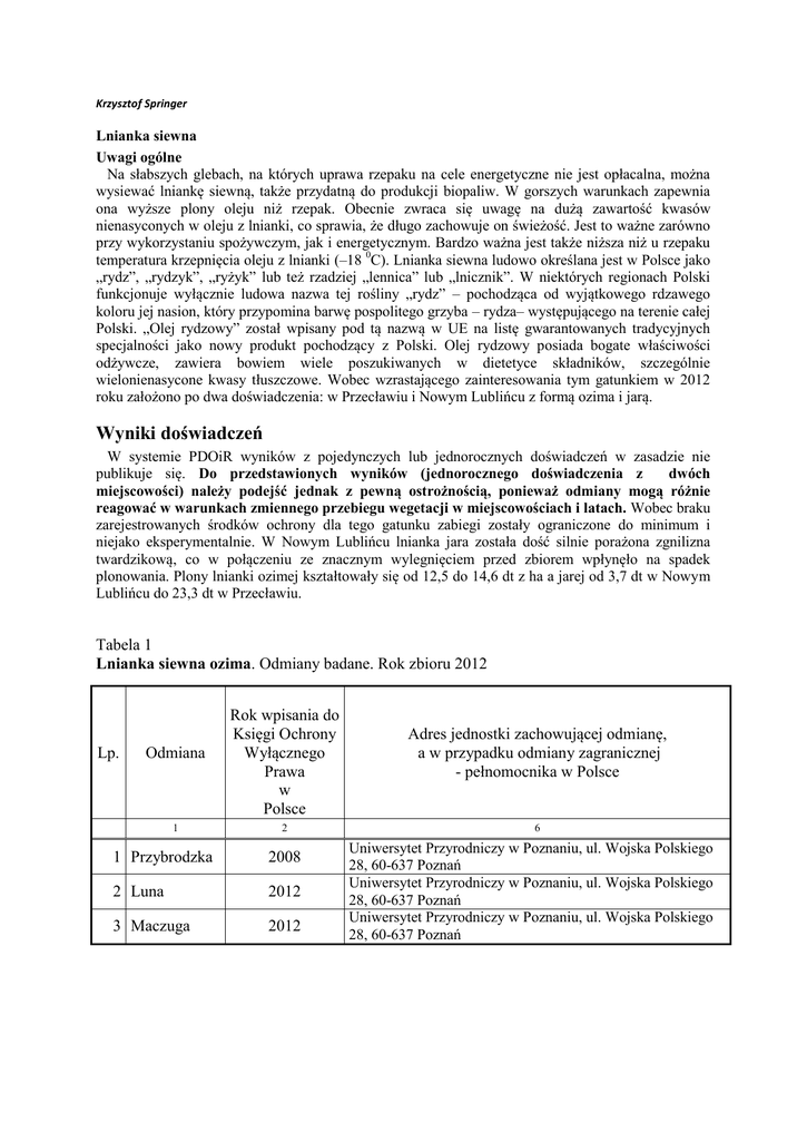 Krzysztof Springer Lnianka siewna Uwagi ogólne Na słabszych glebach, na których uprawa rzepaku na cele energetyczne nie jest opłacalna, można wysiewać lniankę siewną, także przydatną do produkcji biopaliw. W gorszych warunkach zapewnia ona wyższe plony oleju niż rzepak. Obecnie zwraca się uwagę na dużą zawartość kwasów nienasyconych w oleju z lnianki, co sprawia, że długo zachowuje on świeżość. Jest to ważne zarówno przy wykorzystaniu spożywczym, jak i energetycznym. Bardzo ważna jest także niższa niż u rzepaku temperatura krzepnięcia oleju z lnianki (–18 0C). Lnianka siewna ludowo określana jest w Polsce jako „rydz”, „rydzyk”, „ryżyk” lub też rzadziej „lennica” lub „lnicznik”. W niektórych regionach Polski funkcjonuje wyłącznie ludowa nazwa tej rośliny „rydz” – pochodząca od wyjątkowego rdzawego koloru jej nasion, który przypomina barwę pospolitego grzyba – rydza– występującego na terenie całej Polski. „Olej rydzowy” został wpisany pod tą nazwą w UE na listę gwarantowanych tradycyjnych specjalności jako nowy produkt pochodzący z Polski. Olej rydzowy posiada bogate właściwości odżywcze, zawiera bowiem wiele poszukiwanych w dietetyce składników, szczególnie wielonienasycone kwasy tłuszczowe. Wobec wzrastającego zainteresowania tym gatunkiem w 2012 roku założono po dwa doświadczenia: w Przecławiu i Nowym Lublińcu z formą ozima i jarą. Wyniki doświadczeń W systemie PDOiR wyników z pojedynczych lub jednorocznych doświadczeń w zasadzie nie publikuje się. Do przedstawionych wyników (jednorocznego doświadczenia z dwóch miejscowości) należy podejść jednak z pewną ostrożnością, ponieważ odmiany mogą różnie reagować w warunkach zmiennego przebiegu wegetacji w miejscowościach i latach. Wobec braku zarejestrowanych środków ochrony dla tego gatunku zabiegi zostały ograniczone do minimum i niejako eksperymentalnie. W Nowym Lublińcu lnianka jara została dość silnie porażona zgnilizna twardzikową, co w połączeniu ze znacznym wylegnięciem przed zbiorem wpłynęło na spadek plonowania. Plony lnianki ozimej kształtowały się od 12,5 do 14,6 dt z ha a jarej od 3,7 dt w Nowym Lublińcu do 23,3 dt w Przecławiu. Tabela 1 Lnianka siewna ozima. Odmiany badane. Rok zbioru 2012 Lp. Odmiana 1 Rok wpisania do Księgi Ochrony Wyłącznego Prawa w Polsce 2 1 Przybrodzka 2008 2 Luna 2012 3 Maczuga 2012 Adres jednostki zachowującej odmianę, a w przypadku odmiany zagranicznej - pełnomocnika w Polsce 6 Uniwersytet Przyrodniczy w Poznaniu, ul. Wojska Polskiego 28, 60-637 Poznań Uniwersytet Przyrodniczy w Poznaniu, ul. Wojska Polskiego 28, 60-637 Poznań Uniwersytet Przyrodniczy w Poznaniu, ul. Wojska Polskiego 28, 60-637 Poznań Tabela 2 Lnianka siewna ozima. Warunki polowe doświadczeń. Rok zbioru 2012 Miejscowość SDOO Przecław ZDOO Nowy Lubliniec Powiat Mielec Lubaczów Kompleks rolniczej przydatności gleby Klasa bonitacyjna gleby pH gleby w KCl Przedplon Data siewu (dzień, Obsadamiesiąc, nasion rok) (szt/m²) Data zbioru (dzień, miesiąc, rok) N P2O5 K2O S Nawożenie dolistne preparatami wieloskładnikowymi - zabieg nie wykonany - (kg/ha) (kg/ha) (kg/ha) (kg/ha) (l/ha) 4 IIIa 7,0 Pszenica ozima 23 IX 2011 300 1 VII 2012 Nawożenie mineralne 121 70 105 25 5 IVb 6,5 Jęczmień jary 22 IX 2011 300 3 VII 2012 130 52 75 52 Plonvit R – 1,0 - Tabela 3 Lnianka siewna ozima. Wyniki ogólne doświadczeń. Rok zbioru: 2012 Lp. Cecha SDOO Przecław (skala 9º) 1 Ocena wyrzędowania 5,4 (cm) (cm) 2 Wysokość roślin przed zimą 6 (skala 9º) 3 Stan po zimie 7,7 (%) 4 Martwe rośliny 1 (%) 5 Przezimowanie 85 (dzień, m-c) 6 Termin kwitnienia - początek 4 V 2012 (dzień, m-c) 7 Termin dojrzałości technicznej 16 VI 2012 (cm) 8 Wysokość roślin 117 (skala 9º) 9 Wyleganie roślin po zakończeniu kwitnienia 5,9 (skala 9º) 10 Wyleganie roślin przed zbiorem 4,8 (%) 9 Porażenie chorobami: zgnilizną twardzikową 0,0 (skala 9º) 10 -czernią krzyżowych 9,0 (%) 11 -suchą zgnilizną kapustnych 0,0 (g) 12 Masa 1000nasion 1,6 (%) 13 Wilgotność nasion podczas zbioru 9,6 (dt z ha) 14 Plon nasion 14,6 Wyniki średnie z wszystkich badanych odmian. Skala 9º : 9 – oznacza stan najkorzystniejszy, 1 – oznacza stan najmniej korzystny. ZDOO Nowy Lubliniec 9,0 5 9,0 0 100 2 V 2012 26 VI 2012 112 7,7 6,6 14,0 9,0 0,0 1,5 8,9 12,5 Tabela 4 Lnianka siewna ozima. Plon nasion odmian w miejscowościach (% wzorca). Rok zbioru 2012 Lp. Odmiana Wzorzec, dt z ha 1 Przybrodzka 2 Luna 3 Maczuga Przecław Nowy Lubliniec Średnia 14,6 111 80 109 12,5 118 107 74 13,6 115 93 93 wzorzec: średnia z wszystkich badanych odmian Tabela 5 Lnianka siewna ozima. Porażenie odmian przez ważniejsze choroby (odchylenie od wzorca). Rok zbioru: 2012 Zgnilizna Sucha zgnilizna Czerń krzyżowych twardzikowa kapustnych Lp. Odmiana (skala 9º) % roślin porażonych Wzorzec (skala 9º, %) 9,0 14,0 0,0 1 Przybrodzka 0,0 -12, 0 0,0 2 Luna 0,0 8,5 0,0 3 Maczuga 0,0 3,5 0,0 Liczba doświadczeń 0 1 0 Wyniki pochodzą tylko z tych doświadczeń, w których dana choroba wystąpiła; wyższa wartość oznacza ocenę korzystniejszą. Wzorzec: w roku 2012 średnia z wszystkich badanych odmian, Tabela 6 Lnianka siewna ozima. Ważniejsze właściwości rolniczo-użytkowe odmian (odchylenia od wzorca). Rok zbioru: 2012 Wyleganie (skala 9º) Wysokość Masa 1000 roślin nasion po zakończeniu przed zbiorem (cm) (g) kwitnienia Wzorzec 6,8 5,7 115 1,5 1 Przybrodzka 0,9 0,8 -2 0,1 2 Luna -1,5 -1,4 5 -0,1 3 Maczuga 0,6 0,6 -4 0,0 Liczba doświadczeń 2 2 2 2 Wyleganie: wyniki pochodzą tylko z tych doświadczeń w których miało ono miejsce: wyższa wartość oznacza ocenę korzystniejszą. Wzorzec: w roku 2012 średnia z wszystkich badanych odmian. Lp. Odmiana Tabela 7 Lnianka siewna jara. Odmiany badane. Rok zbioru 2012 Lp. Odmiana 1 2 1 Śmiłowska 2 Omega 3 Borowska Rok wpisania do Księgi Ochrony Wyłącznego Prawa w Polsce Ad