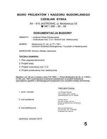 BIURO PROJEKTÓW I NADZORU BUDOWLANEGO CZESŁAW SYSKA 64 – 915 JASTROWIE, ul. Mickiewicza 33 067 / 266 – 29 – 58 DOKUMENTACJA BUDOWY OBIEKTY: - budowa Wiaty Edukacyjnej - rozbudowa inst. C.O i remont inst. elektrycznej ADRES: Nadarzyce 31, dz. nr 77 i 76/1 Centrum Edukacji Ekologicznej i Turystyki w Nadarzycach INWESTOR: Gmina i Miasto Jastrowie TECZKA ZAWIERA 1. Plan zagospodarowania 2. Projekt wiaty 3. Projekt rozbudowy inst. C.O 4. Projekt przebudowy inst. elektrycznej Zgodnie z art. 20 ust. 4 ustawy z dnia 7.07 1994 r. – Prawo Budowlane (tj. Dz. U. z 2010 r. nr 243, poz. 1623 z późniejszymi zmianami) oświadczam, Ŝe projekt budowlany sporządzono zgodnie z obowiązującymi przepisami oraz zasadami wiedzy technicznej. PROJEKTOWAŁ 1. arch. i konstr. inŜ. Wiesław Myczek Upr. w spec. arch. i konstr budowlanej KN 127/74 i 358/80 3. inst sanitarne Czesław Syska upr. bud. w spec. inst. inŜ. do proj. w zakresie inst. sanitarnych. nr 171/77 4. inst elektryczne Mariusz StraŜnikiewicz upr. bud inst . inŜ . nr1843/94 w zakresie inst.i sieci el. Jastrowie, sierpień 2013 5 BIURO PROJEKTÓW I NADZORU BUDOWLANEGO CZESŁAW SYSKA 64 – 915 JASTROWIE, UL. Mickiewicza 33 067 / 266 – 29 – 58 PROJEKT BUDOWLANY BRANśA: Architektoniczno – budowlana OBIEKT: Wiata Edukacyjna ADRES: Nadarzyce 31, dz. nr 77 i 76/1 Centrum Edukacji Ekologicznej i Turystyki w Nadarzycach INWESTOR: Gmina i Miasto Jastrowie DANE OBIEKTU PROJEKTOWANEGO powierzchnia zabudowy 101,68 m² powierzchnia uŜytkowa 97,00 m² Kubatura 396,40 m³ TECZKA ZAWIERA: 1. Oświadczenie projektantów 2. Opis do projektu zagospodarowania 3. Plrojekt zagospodarowania 4. Opis techniczny 5. Informację bezpieczeństwa i ochrony zdrowia 6. Rysunki Zgodnie z art. 20 ust. 4 ustawy z dnia 7.07 1994 r. – Prawo Budowlane (tj. Dz. U. z 2003 r. nr 207, poz. 2016 z późniejszymi zmianami) oświadczam, Ŝe projekt budowlany sporządzono zgodnie z obowiązującymi przepisami oraz zasadami wiedzy technicznej. OPRACOWAŁ PROJEKTOWAŁ Czesław Syska upr. proj. Nr. 359/80 w spec. kontr. bud. w zakresie ogr. do rozwiązań arch. inŜ. Wiesław Myczek upr. w spec. arch. i kontr. Budowlanej KN 12774 i358/80 Jastrowie, sierpień 2013 r. 5 CZĘŚĆ OPISOWA DO PROJEKTU ZAGOSPODAROWANIA 1. PRZEDMIOT INWESTYCJI Przedmiotem inwestycji jest budowa wiaty z dachem o konstrukcji drewnianej krytym gontem papowym. 2. ISTNIEJĄCY STAN ZAGOSPODAROWANIA DZIAŁKI Działka budowlana na której sytuuje się przedmiotowy obiekt składa się dwóch działek gruntu oznaczonych nr ew. nr 77 i 76/1 znajduje się w m. Nadarzyce Gmina Jastrowie. Działka jest zabudowana, budynkiem Centrum Edukacji Ekologicznej i Turystyki w Nadarzycach. W miejscowym planie zagospodarowania przestrzennego wsi Nadarzyce miejsce to oznaczone jest literami „UO” – obejmujące tereny szkoły podstawowej. Szkoła podstawowa została zlikwidowana, inwestor podjął decyzje o utworzeniu Centrum Edukacji Ekologicznej i Turystyki. Obiekt projektuje się uwzględniając zapisy w/w planu. Istniejąca zabudowa to: - budynek szkoły - budynek gospodarczy - przyłącza wody z sieci wiejskiej - szambo i przyłącze kanalizacji sanitarnej - przyłącze energetyczne - wjazd na działkę Teren działki jest stosunkowo płaski, spadki nie przekraczają 5%. Warunki gruntowo-wodne – dobre. Na podstawie dokonanych odkrywek stwierdzono, Ŝe na poziomie posadowienia fundamentów projektowanego budynku zalegają piaski i Ŝwiry. Przyjęto nośność gruntu K = 1,5 kg / cm². Wody gruntowej nie stwierdzono. 3. ROZBIÓRKI – nie występują 4. ADAPTACJA – nie występuje 5. PROJEKTOWANE ZAGOSPODAROWANIE DZIAŁKI Na działce projektuje się budowę wiaty edukacyjnej z przeznaczeniem na prowadzenie zielonej szkoły. Nie przewiduje się budowy chodników i wjazdów, będzie wykorzystana istniejąca infrastruktura. Odprowadzenie wód opadowych na grunt własnej działki /powierzchniowo,ze względu na brak kanalizacji deszczowej. Plac pod wiatą projektuje się utwardzić kostką brukową. Projektuje się wiatę w formie prostąkąta, słupy drewniane,mocowane w stopach fundamentowych za pomocą stalowych butów przyspawanych do marek osadzonych w stopach, co pokazano w części rysunkowej. Na słupach płatew drewniana , dodatkowo podparta mieczami. Dach czterospadowy krokwiowy drewniany, pokryty gontem papowym. 6. Śmieci - składowane sbędą w istniejącym śmietniku. 7. PRZECIWPOśAROWE ZABEZPIECZENIE W WODĘ. Z hydrantów znajdujących się w pasie drogowym. 8. ZESTAWIENIE POWIERZCHNI DZIAŁKI a) b) c) d) 9. Powierzchnia działki Powierzchnia zabudowy Place i chodniki - istniejace Zieleń i tereny nieutwardzone 17200,00 m² 101,60 m² 110,00 m² 16988,40 m² 100,00 % 0,59 % 0,64 % 98,77 % INFORMACJE DODATKOWE A) działka wraz z obiektami nie są wpisana do rejestru zabytków B) powyŜsza inwestycja nie stanowi zagroŜenia dla środowiska i otoczenia OPRACOWAŁ PROJEKTOWAŁ Czesław Syska upr. proj. Nr. 359/80 w spec. kontr. bud. w zakresie ogr. do rozwiązań arch. inŜ. Wiesław Myczek upr. w spec. arch. i kontr. Budowlanej KN 12774 i358/80 Jastrowie, sierpień 2013 r. OPIS TECHNICZNY DO PROJEKTU ARCH. – BUDOWLANEGO ADRES: Nadarzyce 31, dz. nr 77 i 76/1 Centrum Edukacji Ekologicznej i Turystyki w Nadarzycach INWESTOR: Gmina i Miasto Jastrowie 1.0. Dane wyjściowe 1.1 OBIEKT: 1.2 ADRES: 1.3 Wiata Edukacyjna Nadarzyce 31, dz. nr 77 i 76/1 Centrum Edukacji Ekologicznej i Turystyki INWESTOR: Gmina i Miasto Jastrowie 2.0. Dane liczbowe projektowanego budynku 2.1. powierzchnia zabudowy – 101,68 m² 2.2. powierzchnia uŜytkowa – 97,00 m² 2.3. kubatura – 396,40 m³ 3.0. Dane technologiczne – technologia tradycyjna 4.0. Dane normatywne 4.1. obciąŜenie śniegiem wg II strefy klimatycznej 4.2. obciąŜenie wiatrem wg II strefy klimatycznej 4.3. posadowienie wg II strefy klimatycznej 5.0. Korzystanie z obiektu przez osoby niepełnosprawne 5.1. Posadzka obiektu jast wyniesiona 5 cm ponad grunt okalaj