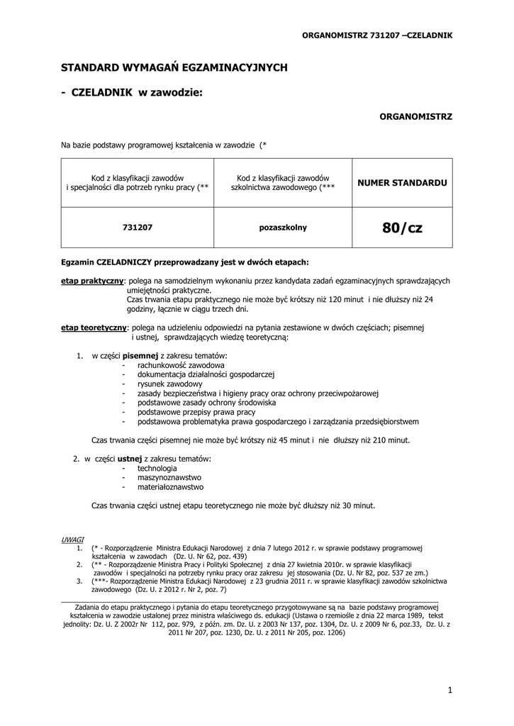 ORGANOMISTRZ 731207 –CZELADNIK STANDARD WYMAGAŃ EGZAMINACYJNYCH - CZELADNIK w zawodzie: ORGANOMISTRZ Na bazie podstawy programowej kształcenia w zawodzie (* Kod z klasyfikacji zawodów i specjalności dla potrzeb rynku pracy (** Kod z klasyfikacji zawodów szkolnictwa zawodowego (*** NUMER STANDARDU 731207 pozaszkolny 80/cz Egzamin CZELADNICZY przeprowadzany jest w dwóch etapach: etap praktyczny: polega na samodzielnym wykonaniu przez kandydata zadań egzaminacyjnych sprawdzających umiejętności praktyczne. Czas trwania etapu praktycznego nie może być krótszy niż 120 minut i nie dłuższy niż 24 godziny, łącznie w ciągu trzech dni. etap teoretyczny: polega na udzieleniu odpowiedzi na pytania zestawione w dwóch częściach; pisemnej i ustnej, sprawdzających wiedzę teoretyczną: 1. w części pisemnej z zakresu tematów: rachunkowość zawodowa dokumentacja działalności gospodarczej rysunek zawodowy zasady bezpieczeństwa i higieny pracy oraz ochrony przeciwpożarowej podstawowe zasady ochrony środowiska podstawowe przepisy prawa pracy podstawowa problematyka prawa gospodarczego i zarządzania przedsiębiorstwem Czas trwania części pisemnej nie może być krótszy niż 45 minut i nie dłuższy niż 210 minut. 2. w części ustnej z zakresu tematów: technologia maszynoznawstwo materiałoznawstwo Czas trwania części ustnej etapu teoretycznego nie może być dłuższy niż 30 minut. UWAGI 1. 2. 3. (* - Rozporządzenie Ministra Edukacji Narodowej z dnia 7 lutego 2012 r. w sprawie podstawy programowej kształcenia w zawodach (Dz. U. Nr 62, poz. 439) (** - Rozporządzenie Ministra Pracy i Polityki Społecznej z dnia 27 kwietnia 2010r. w sprawie klasyfikacji zawodów i specjalności na potrzeby rynku pracy oraz zakresu jej stosowania (Dz. U. Nr 82, poz. 537 ze zm.) (***- Rozporządzenie Ministra Edukacji Narodowej z 23 grudnia 2011 r. w sprawie klasyfikacji zawodów szkolnictwa zawodowego (Dz. U. z 2012 r. Nr 2, poz. 7) _________________________________________________________________________________________ Zadania do etapu praktycznego i pytania do etapu teoretycznego przygotowywane są na bazie podstawy programowej kształcenia w zawodzie ustalonej przez ministra właściwego ds. edukacji (Ustawa o rzemiośle z dnia 22 marca 1989, tekst jednolity: Dz. U. Z 2002r Nr 112, poz. 979, z późn. zm. Dz. U. z 2003 Nr 137, poz. 1304, Dz. U. z 2009 Nr 6, poz.33, Dz. U. z 2011 Nr 207, poz. 1230, Dz. U. z 2011 Nr 205, poz. 1206) 1 ORGANOMISTRZ 731207 –CZELADNIK W efekcie pozytywnie zdanego egzaminu CZELADNICZEGO izba rzemieślnicza wystawia ŚWIADECTWO CZELADNICZE, które jest formalnym potwierdzeniem kwalifikacji zawodowych, uzyskanych w różnych ścieżkach edukacji oraz w procesie pracy. 1. PROFIL UMIEJĘTNOŚCI CZELADNIKA ZWIĄZANY Z ZAWODEM Czeladnik (posiadacz świadectwa czeladniczego) w zawodzie organomistrz potrafi: – posługiwać się dokumentacją techniczną, normami i instrukcjami w zakresie wykonywanych zadań zawodowych, rozróżniać systemy organów budowanych w różnych okresach na podstawie mechanizmów gry (klawiaturowych i rejestrowych), dyspozycji głosów, skali klawiatur manułowych i pedału oraz stylu prospektu, dobierać technologie odpowiadające potrzebom wykonania części organów, napraw i konserwacji organów, dobierać metody i urządzenia pomiarowe do pomiaru parametrów, materiałów używanych do wykonania części organów oraz gotowych elementów, użytkować i konserwować maszyny, urządzenia i narzędzia służące do budowy, naprawy i konserwacji organów, identyfikować uszkodzenia mechanizmów różnych elementów organów, dobierać materiały do budowy i naprawy organów, wykonywać prace z zakresu ręcznej i mechanicznej obróbki materiałów stosowanych do budowy, naprawy i konserwacji organów, rozpoznawać części drewniane zainfekowane przez szkodniki drewna, dokonywać napraw, regulacji i konserwacji organów, – oceniać jakość wykonywanych prac, – sporządzać kalkulacje wykonania usługi, przestrzegać przepisów bezpieczeństwa i higieny pracy, ochrony przeciwpożarowej oraz ochrony środowiska podczas wykonywania zadań zawodowych, udzielać pierwszej pomocy poszkodowanym w wypadkach przy pracy. Czeladnik w zawodzie organomistrz jest przygotowany do wykonywania następujących zadań zawodowych: 1) wytwarzania i montowania elementów i podzespołów organów; 2) naprawiania i konserwacji organów; 3) strojenia organów. 2.WIEDZA I UMIEJĘTNOŚCI ZWIĄZANE Z WYKONYWANIEM WYŻEJ WYMIENIONYCH ZADAŃ ZAWODOWYCH Z ZAKRESU: 2.1. Bezpieczeństwo i higiena pracy Czeladnik: 1) rozróżnia pojęcia związane z bezpieczeństwem i higieną pracy, ochroną przeciwpożarową, ochroną środowiska i ergonomią; 2) rozróżnia zadania i uprawnienia instytucji oraz służb działających w zakresie ochrony pracy i ochrony środowiska w Polsce; 3) określa prawa i obowiązki pracownika oraz pracodawcy w zakresie bezpieczeństwa i higieny pracy; 4) przewiduje zagrożenia dla zdrowia i życia człowieka oraz mienia i środowiska związane z wykonywaniem zadań zawodowych; 5) określa zagrożenia związane z występowaniem szkodliwych czynników w środowisku pracy; 6) określa skutki oddziaływania czynników szkodliwych na organizm człowieka; 7) organizuje stanowisko pracy zgodnie z obowiązującymi wymaganiami ergonomii, przepisami bezpieczeństwa i higieny pracy, ochrony przeciwpożarowej i ochrony środowiska; 8) stosuje środki ochrony indywidualnej i zbiorowej podczas wykonywania zadań zawodowych; 9) przestrzega zasad bezpieczeństwa i higieny pracy oraz stosuje przepisy prawa dotyczące ochrony przeciwpożarowej i ochrony środowiska; 10) udziela pierwszej pomocy poszkodowanym w wypadkach przy pracy oraz w stanach zagrożenia zdrowia i życia. 2.2.Podejmowanie i prowadzenie działalności gospodarczej Czeladnik: 1) stosuje pojęcia z obszaru funkcjonowania gospodarki rynkowej; 2 ORGANOMISTRZ 731207 –CZELADNIK 2) stosuj