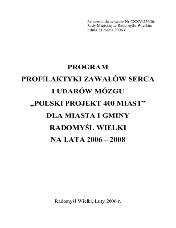 Załącznik do uchwały Nr XXXV/256/06 Rady Miejskiej w Radomyślu Wielkim z dnia 21 marca 2006 r. PROGRAM PROFILAKTYKI ZAWAŁÓW SERCA I UDARÓW MÓZGU „POLSKI PROJEKT 400 MIAST” DLA MIASTA I GMINY RADOMYŚL WIELKI NA LATA 2006 – 2008 Radomyśl Wielki, Luty 2006 r. WSTĘP Gmina Radomyśl Wielki we wrześniu 2005 roku zdeklarowała przystąpienie do ogólnopolskiego programu zdrowotnego pod nazwą Polski Projekt 400 Miast, będącego integralnym elementem Narodowego Programu Leczenia chorób sercowo – naczyniowych, którego koordynatorem z ramienia Ministra Zdrowia jest Akademia Medyczna w Gdańsku. Choroby układu krąŜenia są głównym problemem zdrowotnym w Polsce. Badania epidemiologiczne wykazują, Ŝe z powodu zawałów, chorób wieńcowych i udarów mózgu umiera około 3 krotnie Polaków więcej niŜ w krajach Unii Europejskiej. Dzieje się tak mimo sukcesów w zakresie poprawy standardów leczenia i profilaktyki a takŜe kultury zdrowotnej społeczeństwa. Poprawiają się wskaźniki zdrowotne, ale poprawa dotyczy przede wszystkim społeczności duŜych aglomeracji, o lepszej sytuacji ekonomicznej, lepszej świadomości w zakresie profilaktyki, zwalczania i zapobiegania tym chorobom. Szczegółowe badania wykazują, Ŝe najgorsza sytuacja epidemiologiczna dotyczy: - mieszkańców małych miast i wsi, - osób o niŜszym niŜ średni statusie ekonomicznym i społecznym, - męŜczyzn w średnim wieku. ZAŁOśENIA: Współczesne badania z zakresu zdrowia wskazują nie tylko na związek procesu rozwoju chorób cywilizacyjnych z występującymi czynnikami ryzyka takimi jak palenie tytoniu, współwystępujące choroby (cukrzyca, zaburzenia lipidowe), alkohol, stres czy rodzaj wykonywanej pracy. Wskazują one takŜe na źródła efektywności realizowanych programów profilaktyki chorób i promocji zdrowia. Z licznych badań wynika, Ŝe podstawowym warunkiem sukcesu realizowanego programu zdrowotnego, jest udział w nim społeczności do której jest on skierowany. Efektem interwencji społecznej ma być podniesienie świadomości znaczenia czynników ryzyka i zmniejszenie częstości ich występowania. Niniejszy program jest adresowany zarówno do osób zdrowych jak i do cierpiących na choroby układu krąŜenia i ma na celu propagowanie zdrowego stylu Ŝycia. Jego celem jest przede wszystkim zachęcanie do rzucenia palenia tytoniu, podejmowania aktywności i zdrowego odŜywiania. Niektóre działania są juŜ realizowane i przynoszą poŜądane efekty. Organizowane są kursy gotowania propagujące zdrowe Ŝywienie, które cieszą się duŜym zainteresowaniem kobiet. 2 W szkołach organizowane są Targi Zdrowej śywności, Szkoła Podstawowa w Rudzie i Gimnazjum Publiczne w Radomyślu Wielkim otrzymały certyfikat przyjęcia do Mieleckiej Powiatowej Sieci Szkół i Placówek Promujących Zdrowie. Gimnazjum w Radomyślu Wielkim uczestniczyło ponadto w pilotaŜowym programie dla dzieci i młodzieŜy organizowanym przez Instytut śywności i śywienia oraz Instytut Kardiologii pod tytułem „Szansa dla Młodego serca”. Przykładów jest duŜo więcej a uchwalony program pozwoli na usystematyzowanie działań wszystkich podmiotów na terenie gminy skupionych wokół głównego problemu zdrowotnego jakim są zawały serca i udary mózgu. I. OGÓLNA CHARAKTERYSTYKA MIASTA I GMINY RADOMYŚL WIELKI. 1. Charakterystyka demograficzna: /dane na 31.12.2005r./ 1) Liczba mieszkańców Gminy – 13 845 w tym miasta –2930 2) Sytuacja demograficzna: Kobiety: MęŜczyźni: - liczba kobiet i męŜczyzn 6950 6895 - liczba dzieci i młodzieŜy do lat 19 2132 2148 - liczba osób w wieku 20 – 64 lat 3741 4121 240 100 - liczba osób w wieku 80 lat i więcej 3) Liczba urodzonych: Liczba zgonów: - 2001r. 175 123 - 2002r. 173 132 - 2003r. 165 112 - 2004r. 165 110 - 2005r. 161 125 4) Liczba rodzin niepełnych – 72, posiadających 3 i więcej dzieci – 703. 5) Liczba mieszkańców z wykształceniem*: a/ niepełnym podstawowym – 469 b/ ukończonym podstawowym – 3652 c/ zasadniczym zawodowym – 3505 d/ średnim – 1849 e/ policealnym – 133 f/ wyŜszym – 409 * - statystyka nie obejmuje dzieci i młodzieŜ do 16 roku Ŝycia – 3828 osób. 3 2. Charakterystyka epidemiologiczna. W 2005 roku na terenie miasta i gminy zmarło 125 osób z tego w mieście 18 a na wsiach 107 osób. Przedział wiekowy osób zmarłych przedstawia się następująco: 18 – 40 lat- 3 osoby, 41 – 65 lat 18 osób, powyŜej 65 lat 104 osoby. Przyczyny zgonu: 46 %- choroby układu krąŜenia, 54 %- pozostałe. Główne przyczyny hospitalizacji na podstawie skierowań wydanych przez tutejsze Niepubliczne Zakłady Opieki Zdrowotnej to: - choroby układu krąŜenia- 41 %, - pozostałe, w tym urazy, złamania -59 %. 3. Sytuacja bytowa mieszkańców w 2005 roku: 1) Liczba mieszkańców otrzymujących stały zasiłek z pomocy społecznej – 24, 2) Liczba osób otrzymujących zasiłek okresowy z pomocy społecznej – 294, 3) Liczba osób korzystających z zasiłków celowych i w naturze – 397, 4) Liczba osób korzystających z renty socjalnej – 114, 5) Liczba osób bezrobotnych – 961 w tym z prawem do zasiłku 83, 6) Liczba rodzin pobierających świadczenia rodzinne- 1414, 7) Liczba dzieci korzystających z doŜywiania dofinansowywanego przez GOPS – 1267. II. ZASOBY MIASTA I GMINY DLA WDRAśANIA PROGRAMU „PP 400M”. 1.Instytucje wdraŜające załoŜenia PP 400 M: 1) Rada Miejska i Urząd Miejski, 2) Gminny Zespół Ekonomiczno -Administracyjny Szkół, 3) Gminny Ośrodek Pomocy Społecznej, 4) Samorządowe Centrum Kultury i Bibliotek, 5) Bank Spółdzielczy, 6) placówki oświatowe: - 10 szkół podstawowych z terenu gminy, - Gimnazjum Publiczne, - Zespół Szkół w Radomyślu Wielkim, 7) 2 Niepubliczne Zakłady Opieki Zdrowotnej, 8) Organizacje Pozarządowe: - Stowarzyszenie „Nasza Gmina”, 4 - Stowarzyszenie Ochotniczych StraŜy PoŜarnych, - Stowarzyszenie Ludowych Klubów Sportowych, - Towarzystwo