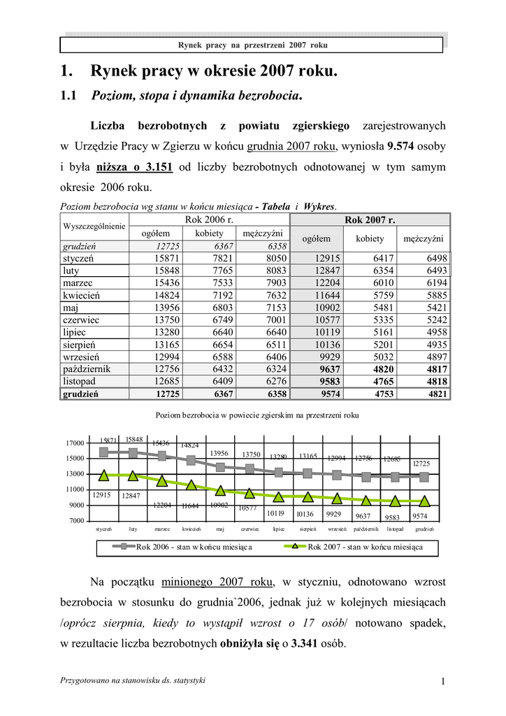 Rynek pracy na przestrzeni 2007 roku 1. Rynek pracy w okresie 2007 roku. 1.1 Poziom, stopa i dynamika bezrobocia. Liczba bezrobotnych z powiatu zarejestrowanych zgierskiego w Urzędzie Pracy w Zgierzu w końcu grudnia 2007 roku, wyniosła 9.574 osoby i była niŜsza o 3.151 od liczby bezrobotnych odnotowanej w tym samym okresie 2006 roku. Poziom bezrobocia wg stanu w końcu miesiąca - Tabela i Wykres. Rok 2006 r. Rok 2007 r. Wyszczególnienie ogółem 12725 kobiety 6367 męŜczyźni 6358 styczeń luty marzec kwiecień maj czerwiec lipiec sierpień wrzesień październik listopad 15871 15848 15436 14824 13956 13750 13280 13165 12994 12756 12685 7821 7765 7533 7192 6803 6749 6640 6654 6588 6432 6409 8050 8083 7903 7632 7153 7001 6640 6511 6406 6324 6276 12915 12847 12204 11644 10902 10577 10119 10136 9929 9637 9583 6417 6354 6010 5759 5481 5335 5161 5201 5032 4820 4765 6498 6493 6194 5885 5421 5242 4958 4935 4897 4817 4818 grudzień 12725 6367 6358 9574 4753 4821 grudzień ogółem kobiety męŜczyźni Poziom bezrobocia w powiecie zgierskim na przestrzeni roku 17000 15871 15848 15436 14824 13956 15000 13750 13280 13165 12994 12756 12685 9929 9637 9583 12725 13000 11000 12915 12847 9000 12204 11644 10902 10577 10119 7000 styczeń luty marzec kwiecień maj czerwiec Rok 2006 - stan w końcu miesiąc a lipiec 10136 sierpień wrzesień październik lis topad 9574 grudzień Rok 2007 - stan w końcu miesiąca Na początku minionego 2007 roku, w styczniu, odnotowano wzrost bezrobocia w stosunku do grudnia`2006, jednak juŜ w kolejnych miesiącach /oprócz sierpnia, kiedy to wystąpił wzrost o 17 osób/ notowano spadek, w rezultacie liczba bezrobotnych obniŜyła się o 3.341 osób. Przygotowano na stanowisku ds. statystyki 1 Rynek pracy na przestrzeni 2007 roku Tabela przedstawia dynamikę bezrobocia. Dynamika bezrobocia w okresie 2007 roku wzrost/spadek do poprzedniego okresu Podstawą - stan bezrobocia z okresu poprzedniego w liczbach bezrobotnych miesiąc grudzień`2006 styczeń`2007 luty`2007 marzec`2007 kwiecień`2007 maj`2007 czerwiec`2007 lipiec`2007 sierpień`2007 wrzesień`2007 paźdrzienik`2007 listopad`2007 12725 12915 12847 12204 11644 10902 10577 10119 10136 9929 9637 9583 miesiąc w liczbach bezrobotnych w liczbach w % 12915 12847 12204 11644 10902 10577 10119 10136 9929 9637 9583 9574 +190 -68 -643 -560 -742 -325 -458 +17 -207 -292 -54 -9 +1,5 -0,5 -5,3 -4,6 -6,4 -3,0 -4,3 +0,2 -2,0 -2,9 -0,6 -0,1 styczeń`2007 luty`2007 marzec`2007 kwiecień`2007 maj`2007 czerwiec`2007 lipiec`2007 sierpień`2007 wrzesień`2007 październik`2007 listopad`2007 grudzień`2007 Stopa bezrobocia dla całego powiatu zgierskiego – wg danych GUS – w końcu listopada ub. r. kształtowała się na poziomie 15,9%, w odniesieniu do danych z grudnia 2006 roku /było 20,5%/ wysokość wskaźnika zmalała o 4,6 punktu. Na koniec grudnia`2007 bezrobotni z terenu miast i gmin: Aleksandrów, Głowno, Ozorków, Parzęczew i Stryków stanowili 61,7% ogółu bezrobotnych pozostających w ewidencji Powiatowego Urzędu Pracy, a pozostałe 38,3% to bezrobotni z terenu miasta i gminy Zgierz. Liczba zarejestrowanych bezrobotnych wg stanu na koniec 2007 roku 15,4% 38,3% 16,0% 7,1% 3,4% Aleksandrów Głowno Przygotowano na stanowisku ds. statystyki 19,8% Stryków Ozorków Parzęczew Zgierz 2 Rynek pracy na przestrzeni 2007 roku Powiatowy Urząd Pracy w Zgierzu obsługuje bezrobotnych z terenów miejsko-wiejskich podlegających pod odpowiednie jednostki samorządu terytorialnego. Cztery kolejne Tabele przedstawiają dane liczbowe dotyczące bezrobocia z podziałem terytorialnym. Tabela pierwsza przedstawia dynamikę bezrobocia w poszczególnych gminach, druga dotyczy płynności bezrobocia, trzecia zawiera dane dotyczące bezrobotnych z prawem do zasiłku, czwarta – pozyskane oferty pracy. Wszystkie dane z minionego 2007 roku zestawione zostały z danymi z analogicznego okresu roku 2006. Dynamika bezrobocia – Tabela 1. Stan na koniec miesiąca Wyszczególnienie 31.12.2006 31.12.2007 Dynamika bezrobocia grudzień`2007 – grudzień`2006 w liczbach w% Zgierz – miasto 4310 3128 -1182 -27,4 Zgierz – gmina wiejska 738 538 -200 -27,1 2004 1473 -531 -26,5 1620 1262 -358 -22,1 Głowno – gmina wiejska 310 272 -38 -12,3 Ozorków – miasto 1957 1492 -465 -23,8 Ozorków – gmina wiejska 513 405 -108 -21,1 Parzęczew – gmina wiejska 409 322 -87 -21,3 Stryków – gmina miejsko-wiejska 864 682 -182 -21,1 Ogółem: 12725 9574 -3151 -24,8 Aleksandrów – gmina miejsko-wiejska Głowno – miasto Jak wynika z przedstawionych danych, w odniesieniu do stanu z roku 2006, w minionym roku spadek liczby bezrobotnych odnotowano we wszystkich gminach. Przy czym największy spadek wystąpił wśród zarejestrowanych bezrobotnych z miasta Zgierza – o 1.182 osoby, a takŜe wśród bezrobotnych z gminy Aleksandrów – o 531 osób oraz bezrobotnych mieszkańców miasta Ozorków – o 465 osób. Przygotowano na stanowisku ds. statystyki 3 Rynek pracy na przestrzeni 2007 roku Liczby dotyczące ruchu bezrobotnych na rynku pracy – Tabela 2. Rok 2006 Wyszczególnienie Zgierz – gmina miejska Zgierz – gmina wiejska Aleksandrów – gmina miejsko-wiejska Głowno gmina miejska Głowno gmina wiejska Ozorków – gmina miejska Ozorków – gmina wiejska Parzęczew – gmina wiejska Stryków – gmina miejsko-wiejska Razem Rok 2007 „napływ” „odpływ” podjęcia pracy „napływ” „odpływ” podjęcia pracy 4495 5405 2933 4124 5306 2623 665 837 438 733 933 439 1792 2381 1193 1830 2361 1075 1315 1641 895 1357 1715 891 235 325 169 274 312 149 1836 2245 1473 1776 2241 1289 400 480 298 402 510 272 376 451 218 411 498 226 834 946 545 833 1015 578 11948 14711 8162 11740 14891 7542 Od początku minionego roku zarejestrowano 11.740 osób bezrobotnych, w tym 3.005 osób z prawem do zasiłku, najczęściej byli to mieszkańcy miasta Zgierza. Wśród osób wyrejestrowanych i wśród podejmujących pracę mieszkańcy Zgierza stanowili odpowi