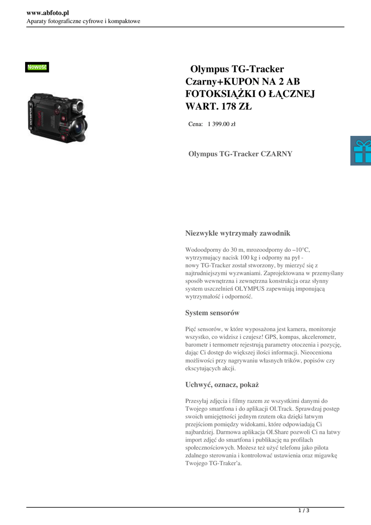 www.abfoto.pl Aparaty fotograficzne cyfrowe i kompaktowe Olympus TG-Tracker Czarny+KUPON NA 2 AB FOTOKSIĄŻKI O ŁĄCZNEJ WART. 178 ZŁ Cena: 1 399.00 zł Olympus TG-Tracker CZARNY Niezwykle wytrzymały zawodnik Wodoodporny do 30 m, mrozoodporny do –10°C, wytrzymujący nacisk 100 kg i odporny na pył nowy TG-Tracker został stworzony, by mierzyć się z najtrudniejszymi wyzwaniami. Zaprojektowana w przemyślany sposób wewnętrzna i zewnętrzna konstrukcja oraz słynny system uszczelnień OLYMPUS zapewniają imponującą wytrzymałość i odporność. System sensorów Pięć sensorów, w które wyposażona jest kamera, monitoruje wszystko, co widzisz i czujesz! GPS, kompas, akcelerometr, barometr i termometr rejestrują parametry otoczenia i pozycję, dając Ci dostęp do większej ilości informacji. Nieoceniona możliwości przy nagrywaniu własnych trików, popisów czy ekscytujących akcji. Uchwyć, oznacz, pokaż Przesyłaj zdjęcia i filmy razem ze wszystkimi danymi do Twojego smartfona i do aplikacji OI.Track. Sprawdzaj postęp swoich umiejętności jednym rzutem oka dzięki łatwym przejściom pomiędzy widokami, które odpowiadają Ci najbardziej. Darmowa aplikacja OI.Share pozwoli Ci na łatwy import zdjęć do smartfona i publikację na profilach społecznościowych. Możesz też użyć telefonu jako pilota zdalnego sterowania i kontrolować ustawienia oraz migawkę Twojego TG-Traker’a. 1/3 www.abfoto.pl Aparaty fotograficzne cyfrowe i kompaktowe 4k & ultraszeroki obiektyw Możliwości nagrywania filmów 4K i ultraszeroki obiektyw sprawiają, że uchwycisz całą akcję w superjakości. Ultraszeroki obiektyw z kątem widzenia 204° pozwoli Ci przeżyć wszystko jeszcze raz. 5-osiowa IS TG-Tracker wyposażony jest w imponującą 5-osiową stabilizację obrazu, która kompensuje każdy ruch mogący powodować rozmycie. Nagrywaj idealnie płynne filmy, niezależnie do tego jak wyboista jest trasa, po której jedziesz. Odchylany ekran LCD 1,4” Kolorowy LCD o przekątnej 1,5” i rozdzielczości 115 200 punktów daje Ci idealny przegląd sytuacji kiedy filmujesz i kiedy oglądasz nagrany materiał. Ekran można odchylić, co jeszcze bardziej ułatwia podążanie za akcją! Filmy 4K Nagrywaj filmy w 4K TG-Tracker wyposażony jest w legendarną technologię przetwarzania obrazu OLYMPUS, zapewniającą żywe obrazy i filmy pełne detali z minimalną ilością szumów. Mocna Lampa Wbudowana mocna lampa, do wykorzystania w trudniejszych warunkach oświetleniowych. Rozjaśnij ciemność mocą 60 lumenów na odległość do 3,5 m maksymalnie na minutę. Błyskawiczna obsługa pozwoli Ci szybko oświetlić filmowany obiekt, nadając Twoim filmom realizmu. Filmy Time-Lapse Dzięki trybowi Time Lapse możesz uchwycić wschód słońca, zmiany pogody i inne ciekawe sekwencje w formie filmu poklatkowego. Efekt, który idealne nadaje się do publikowania w sieci. Nagrywanie w pętli Nagrywanie w pętli pozwala na filmowanie przez cały czas, do momentu, aż skończy się miejsce na karcie lub wyczerpie się bateria. Każdy film trwa dokładnie 29 minut, co ułatwia zarządzanie plikami i ich edycję. Czujnik podwodny TG-Tracker automatycznie rozpoznaje, kiedy jesteś pod wodą. 2/3 www.abfoto.pl Aparaty fotograficzne cyfrowe i kompaktowe Na głębokości poniżej 50 cm od powierzchni wody, kamera przełącza się w tryb przeznaczony do zdjęć podwodnych, a Ty możesz w pełni poddać się emocjom związanym z nurkowaniem. Pojemna bateria Pojemna, zapewniająca długi czas pracy, litowo-jonowa bateria, pozwala na imponująco długi czas nagrywania. Uchwyt & adapter Stabilny uchwyt pozwoli Ci filmować pod dowolnym kątem, nawet w pełnych akcji sytuacjach. Głowica adaptera pozwala na zamocowanie akcesoriów innych firm, co daje nieskończenie wiele możliwości. 3/3 Powered by TCPDF (www.tcpdf.org)