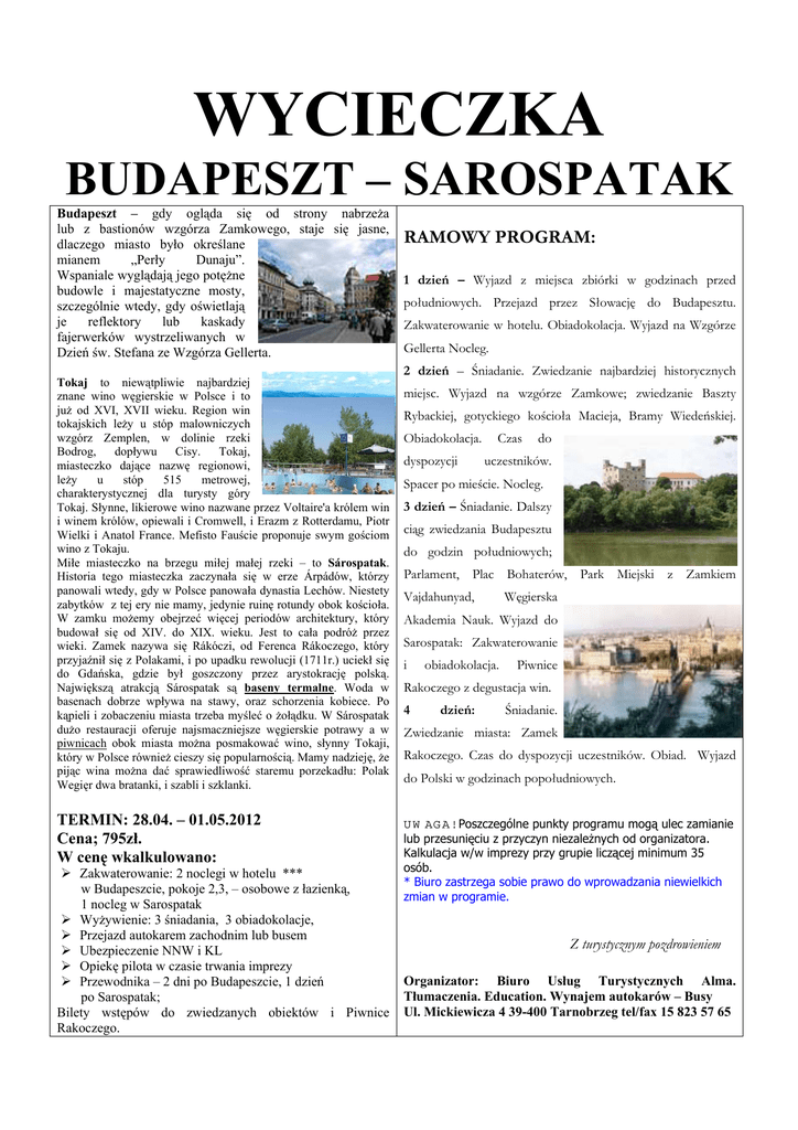 WYCIECZKA BUDAPESZT – SAROSPATAK Budapeszt – gdy ogląda siĊ od strony nabrzeĪa lub z bastionów wzgórza Zamkowego, staje siĊ jasne, dlaczego miasto byáo okreĞlane mianem „Peráy Dunaju”. Wspaniale wyglądają jego potĊĪne budowle i majestatyczne mosty, szczególnie wtedy, gdy oĞwietlają je reflektory lub kaskady fajerwerków wystrzeliwanych w DzieĔ Ğw. Stefana ze Wzgórza Gellerta. Tokaj to niewątpliwie najbardziej znane wino wĊgierskie w Polsce i to juĪ od XVI, XVII wieku. Region win tokajskich leĪy u stóp malowniczych wzgórz Zemplen, w dolinie rzeki Bodrog, dopáywu Cisy. Tokaj, miasteczko dające nazwĊ regionowi, leĪy u stóp 515 metrowej, charakterystycznej dla turysty góry Tokaj. Sáynne, likierowe wino nazwane przez Voltaire'a królem win i winem królów, opiewali i Cromwell, i Erazm z Rotterdamu, Piotr Wielki i Anatol France. Mefisto FauĞcie proponuje swym goĞciom wino z Tokaju. Miáe miasteczko na brzegu miáej maáej rzeki – to Sárospatak. Historia tego miasteczka zaczynaáa siĊ w erze Árpádów, którzy panowali wtedy, gdy w Polsce panowaáa dynastia Lechów. Niestety zabytków z tej ery nie mamy, jedynie ruinĊ rotundy obok koĞcioáa. W zamku moĪemy obejrzeü wiĊcej periodów architektury, który budowaá siĊ od XIV. do XIX. wieku. Jest to caáa podróĪ przez wieki. Zamek nazywa siĊ Rákóczi, od Ferenca Rákoczego, który przyjaĨniá siĊ z Polakami, i po upadku rewolucji (1711r.) ucieká siĊ do GdaĔska, gdzie byá goszczony przez arystokracjĊ polską. NajwiĊkszą atrakcją Sárospatak są baseny termalne. Woda w basenach dobrze wpáywa na stawy, oraz schorzenia kobiece. Po kąpieli i zobaczeniu miasta trzeba myĞleü o Īoáądku. W Sárospatak duĪo restauracji oferuje najsmaczniejsze wĊgierskie potrawy a w piwnicach obok miasta moĪna posmakowaü wino, sáynny Tokaji, który w Polsce równieĪ cieszy siĊ popularnoĞcią. Mamy nadziejĊ, Īe pijąc wina moĪna daü sprawiedliwoĞü staremu porzekadáu: Polak WegiĊr dwa bratanki, i szabli i szklanki. TERMIN: 28.04. – 01.05.2012 Cena; 795zá. W cenĊ wkalkulowano: ¾ Zakwaterowanie: 2 noclegi w hotelu *** w Budapeszcie, pokoje 2,3, – osobowe z áazienką, 1 nocleg w Sarospatak ¾ WyĪywienie: 3 Ğniadania, 3 obiadokolacje, ¾ Przejazd autokarem zachodnim lub busem ¾ Ubezpieczenie NNW i KL ¾ OpiekĊ pilota w czasie trwania imprezy ¾ Przewodnika – 2 dni po Budapeszcie, 1 dzieĔ po Sarospatak; Bilety wstĊpów do zwiedzanych obiektów i Piwnice Rakoczego. RAMOWY PROGRAM: 1 dzieľ – Wyjazd z miejsca zbiórki w godzinach przed poâudniowych. Przejazd przez Sâowację do Budapesztu. Zakwaterowanie w hotelu. Obiadokolacja. Wyjazd na Wzgórze Gellerta Nocleg. 2 dzieľ – Œniadanie. Zwiedzanie najbardziej historycznych miejsc. Wyjazd na wzgórze Zamkowe; zwiedzanie Baszty Rybackiej, gotyckiego koœcioâa Macieja, Bramy Wiedeľskiej. Obiadokolacja. dyspozycji Czas do uczestników. Spacer po mieœcie. Nocleg. 3 dzieľ – Œniadanie. Dalszy ciĊg zwiedzania Budapesztu do godzin poâudniowych; Parlament, Plac Bohaterów, Park Miejski z Zamkiem Vajdahunyad, Węgierska Akademia Nauk. Wyjazd do Sarospatak: Zakwaterowanie i obiadokolacja. Piwnice Rakoczego z degustacja win. 4 dzieľ: Œniadanie. Zwiedzanie miasta: Zamek Rakoczego. Czas do dyspozycji uczestników. Obiad. Wyjazd do Polski w godzinach popoâudniowych. U W AG A! Poszczególne punkty programu mogą ulec zamianie lub przesuniĊciu z przyczyn niezaleĪnych od organizatora. Kalkulacja w/w imprezy przy grupie liczącej minimum 35 osób. * Biuro zastrzega sobie prawo do wprowadzania niewielkich zmian w programie. Z turystycznym pozdrowieniem Organizator: Biuro Usáug Turystycznych Alma. Táumaczenia. Education. Wynajem autokarów – Busy Ul. Mickiewicza 4 39-400 Tarnobrzeg tel/fax 15 823 57 65