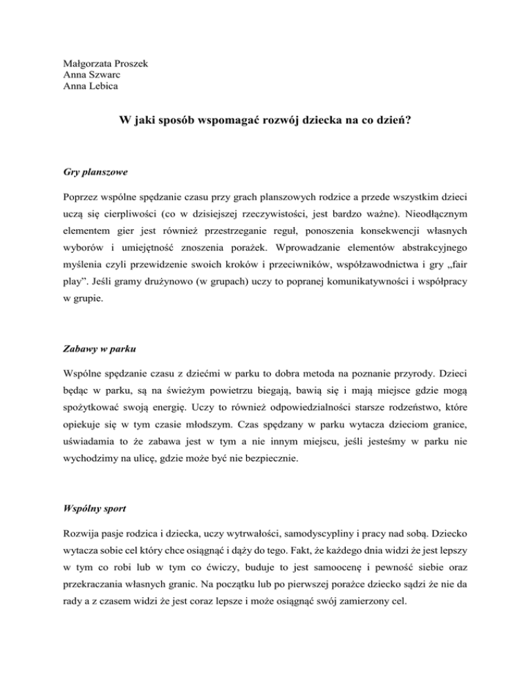 Małgorzata Proszek Anna Szwarc Anna Lebica W jaki sposób wspomagać rozwój dziecka na co dzień? Gry planszowe Poprzez wspólne spędzanie czasu przy grach planszowych rodzice a przede wszystkim dzieci uczą się cierpliwości (co w dzisiejszej rzeczywistości, jest bardzo ważne). Nieodłącznym elementem gier jest również przestrzeganie reguł, ponoszenia konsekwencji własnych wyborów i umiejętność znoszenia porażek. Wprowadzanie elementów abstrakcyjnego myślenia czyli przewidzenie swoich kroków i przeciwników, współzawodnictwa i gry „fair play”. Jeśli gramy drużynowo (w grupach) uczy to popranej komunikatywności i współpracy w grupie. Zabawy w parku Wspólne spędzanie czasu z dziećmi w parku to dobra metoda na poznanie przyrody. Dzieci będąc w parku, są na świeżym powietrzu biegają, bawią się i mają miejsce gdzie mogą spożytkować swoją energię. Uczy to również odpowiedzialności starsze rodzeństwo, które opiekuje się w tym czasie młodszym. Czas spędzany w parku wytacza dzieciom granice, uświadamia to że zabawa jest w tym a nie innym miejscu, jeśli jesteśmy w parku nie wychodzimy na ulicę, gdzie może być nie bezpiecznie. Wspólny sport Rozwija pasje rodzica i dziecka, uczy wytrwałości, samodyscypliny i pracy nad sobą. Dziecko wytacza sobie cel który chce osiągnąć i dąży do tego. Fakt, że każdego dnia widzi że jest lepszy w tym co robi lub w tym co ćwiczy, buduje to jest samoocenę i pewność siebie oraz przekraczania własnych granic. Na początku lub po pierwszej porażce dziecko sądzi że nie da rady a z czasem widzi że jest coraz lepsze i może osiągnąć swój zamierzony cel. Rodzinne wycieczki Uświadamianie sobie życia w przestrzeni, wspólne wytyczanie tras i miejsc które chce się zwiedzić bądź odwiedzić. Przed wycieczką każdy członek rodziny wyobraża sobie co będzie robił, co może ciekawego zobaczyć, jakie pamiątki może zabrać z tego miejsca. Rodzice uczą też dzieci odpowiedzialności za to co zrobią w czasie wycieczki lub jeśli coś nieprzewidywalnego z jego winy się stanie. Wycieczki uwrażliwiają dzieci na sztukę, przyrodę na odkrywanie nowych miejsc i rozwijanie umiejętności krytycznego myślenia na podstawie swoich dotychczas zdobytych doświadczeń i konfrontację ich z nowo poznanymi. Wspólne przygotowywanie posiłków To może wydać się zaskakujące, ale wspólne gotowanie z dzieckiem to też doskonała okazja, żeby wspomóc jego rozwój. Przygotowywanie posiłków, obieranie lub krojenie warzyw pod czujnym okiem dorosłego, nie tylko uczy dziecko samodzielności i zaradności, ale także rozwija jego sprawność motoryczną – głównie dłoni i palców, oraz koordynację dłoń-oko. Jest to też okazja do rozmów, co poszerzy ogólny zakres wiedzy dziecka, oraz do próbowania różnych składników, co może zachęcić dziecko do zjedzenia dań, za którymi może wcześniej nie przepadało. Wspólne sprzątane Jest to kolejna czynność, która w asyście małego pomocnika może trwać nieco dłużej niż zazwyczaj, ale także biorąc pod uwagę korzyści, które przyjdą z czasem – jest to poświęcenie warte swojej ceny. Dziecko staje się nie tylko bardziej samodzielne, lecz także sprawniejsze. Wszak porządki domowe wymagają dość precyzyjnych ruchów rąk i dobrej formy fizycznej. Wspólne śpiewanie Domowe karaoke lub podśpiewywanie sobie piosenek w czasie chociażby niedzielnego spaceru nie tylko ćwiczy pamięć, ale także zwiększa pojemność płuc i wydłuża oddech. Ponadto, wspólne śpiewanie może okazać się dobrym sposobem na walkę z nieśmiałością.