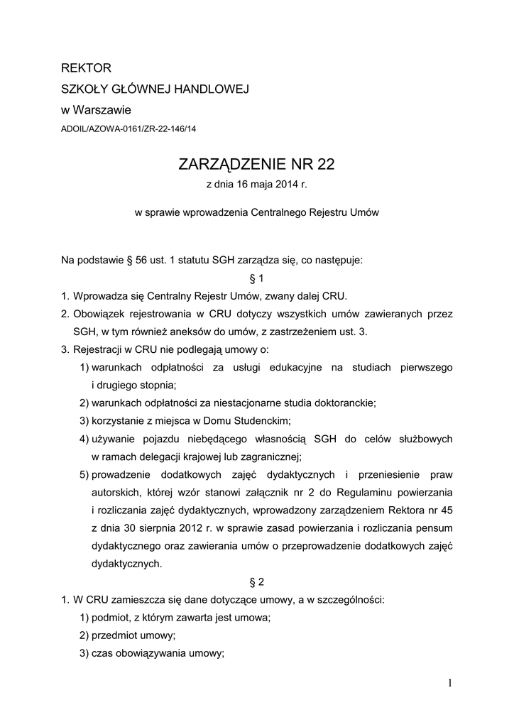 REKTOR SZKOŁY GŁÓWNEJ HANDLOWEJ w Warszawie ADOIL/AZOWA-0161/ZR-22-146/14 ZARZĄDZENIE NR 22 z dnia 16 maja 2014 r. w sprawie wprowadzenia Centralnego Rejestru Umów Na podstawie § 56 ust. 1 statutu SGH zarządza się, co następuje: §1 1. Wprowadza się Centralny Rejestr Umów, zwany dalej CRU. 2. Obowiązek rejestrowania w CRU dotyczy wszystkich umów zawieranych przez SGH, w tym równieŜ aneksów do umów, z zastrzeŜeniem ust. 3. 3. Rejestracji w CRU nie podlegają umowy o: 1) warunkach odpłatności za usługi edukacyjne na studiach pierwszego i drugiego stopnia; 2) warunkach odpłatności za niestacjonarne studia doktoranckie; 3) korzystanie z miejsca w Domu Studenckim; 4) uŜywanie pojazdu niebędącego własnością SGH do celów słuŜbowych w ramach delegacji krajowej lub zagranicznej; 5) prowadzenie dodatkowych zajęć dydaktycznych i przeniesienie praw autorskich, której wzór stanowi załącznik nr 2 do Regulaminu powierzania i rozliczania zajęć dydaktycznych, wprowadzony zarządzeniem Rektora nr 45 z dnia 30 sierpnia 2012 r. w sprawie zasad powierzania i rozliczania pensum dydaktycznego oraz zawierania umów o przeprowadzenie dodatkowych zajęć dydaktycznych. §2 1. W CRU zamieszcza się dane dotyczące umowy, a w szczególności: 1) podmiot, z którym zawarta jest umowa; 2) przedmiot umowy; 3) czas obowiązywania umowy; 1 4) wartość zobowiązania wynikającego z umowy, a jeŜeli zawarto ją na czas nieokreślony – wartość za okres 12 miesięcy; oraz, z chwilą rejestracji umowy, zamieszcza się jej skan (jeŜeli rejestracja nastąpiła po podpisaniu umowy przez jedną stronę, naleŜy zamieścić jej skan równieŜ po podpisaniu przez wszystkie strony), a takŜe ewentualne aneksy do umowy. 2. W przypadku umów o prowadzenie zajęć dydaktycznych nie jest konieczne dołączanie skanu umowy, z wyjątkiem umów dotyczących projektów dofinansowanych ze źródeł zewnętrznych. §3 1. Rejestracji umów w CRU dokonują: 1) pracownicy Działu Organizacji i Legislacji: a) zajmujący się obsługą Rektora – w przypadku umów podpisywanych przez Rektora i prorektorów, z zastrzeŜeniem umów, o których mowa w pkt 2 i 4, b) zajmujący się obsługą kanclerza – w przypadku umów podpisywanych przez kanclerza, zastępcę kanclerza lub kierowników jednostek organizacyjnych administracji, z zastrzeŜeniem umów, o których mowa w pkt 2 i 4; 2) pracownicy Działu Obsługi Projektów – w zakresie umów dotyczących projektów realizowanych w SGH, zgodnie z zakresem zadań jednostki określonym w Regulaminie organizacyjnym SGH, z zastrzeŜeniem umów, o których mowa w pkt 3; 3) pracownicy biur kolegiów – w zakresie umów podpisanych przez dziekanów kolegiów oraz umów o prowadzenie zajęć dydaktycznych zawieranych na studiach doktoranckich i podyplomowych prowadzonych w ramach kolegiów; 4) pracownicy Działu Organizacji i Rozliczania Dydaktyki – w zakresie umów o prowadzenie zajęć dydaktycznych na studiach pierwszego i drugiego stopnia oraz na stacjonarnych studiach doktoranckich zawieranych z osobami niebędącymi pracownikami SGH. 2. Rejestracja umowy w CRU następuje niezwłocznie po jej podpisaniu przynajmniej przez jedną ze stron. 3. JeŜeli rejestracja nastąpiła po podpisaniu umowy tylko przez jedną stronę, jednostka organizacyjna lub osoba odpowiedzialna za dostarczenie umowy do 2 rejestracji powinna ją przekazać ponownie, w celu zamieszczenia skanu umowy w CRU, w terminie 14 dni od podpisania jej przez wszystkie strony. 4. JeŜeli umowa, która została zarejestrowana po podpisaniu przez jedną ze stron, nie została ostatecznie zawarta albo jeŜeli umowa stała się bezprzedmiotowa naleŜy zamieścić w CRU odpowiednią informację dotyczącą tego faktu. 5. Rejestracja umowy powinna nastąpić przed przekazaniem umowy jednostce prowadzącej sprawę, chyba Ŝe rejestracji dokonuje pracownik jednostki organizacyjnej prowadzącej sprawę. 6. Egzemplarz umowy, którego skan zamieszcza się w CRU, oprócz podpisów osób zawierających umowę powinien być opatrzony parafą radcy prawnego SGH oraz kwestora lub upowaŜnionej przez niego osoby (z wyjątkiem umów, których wzory są zawarte w wewnętrznych aktach prawnych Uczelni). 7. Oryginał umowy przechowuje jednostka organizacyjna prowadząca sprawę, której umowa dotyczy lub Kwestura. §4 Kierownicy jednostek organizacyjnych, o których mowa w § 3 ust. 1, wyznaczą pracowników, którzy będą posiadali uprawnienie do rejestrowania umów w CRU. §5 Numery umów wpisywanych do CRU są nadawane automatycznie przez system informatyczny. §6 W zakresie uregulowanym niniejszym zarządzeniem tracą moc postanowienia dotyczące rejestrowania umów zawarte w: 1) zarządzeniu Rektora nr 24 z dnia 12 kwietnia 2007 r. w sprawie zawierania umów, których przedmiotem są dostawy, usługi i roboty budowlane, z późn. zm.; 2) zarządzeniu Rektora nr 38 z dnia 9 sierpnia 2010 r. w sprawie zawierania umów cywilnoprawnych na prace o charakterze pozaakademickim, z późn. zm.; 3) zarządzeniu Rektora nr 39 z dnia 9 sierpnia 2010 r. w sprawie zawierania umów w zakresie działalności twórczej, z późn. zm.; 4) zarządzeniu Rektora nr 55 z dnia 13 grudnia 2010 r. w sprawie rejestracji i archiwizacji umów zawieranych w projektach realizowanych w SGH w ramach programów operacyjnych Unii Europejskiej; 5) zarządzeniu Rektora nr 20 z dnia 23 marca 2011 r. w sprawie zawierania umów związanych z prowadzeniem naukowych prac badawczych; 3 6) zarządzeniu Rektora nr 9 z dnia 6 lutego 2012 r. w sprawie zawierania umów o prowadzenie zajęć dydaktycznych; 7) zarządzeniu Rektora nr 47 z dnia 8 sierpnia 2013 r. w sprawie zasad sporządzania umów o refundację kosztów związanych z czynnościami przeprowadzanymi w przewodzie doktorskim, w postępowaniu habilitacyjnym, a takŜe w postępowaniu o nadanie tytułu profesora dla osób niebędących uczestnikami studiów doktoranckich w SGH. §7 Zarządzenie 