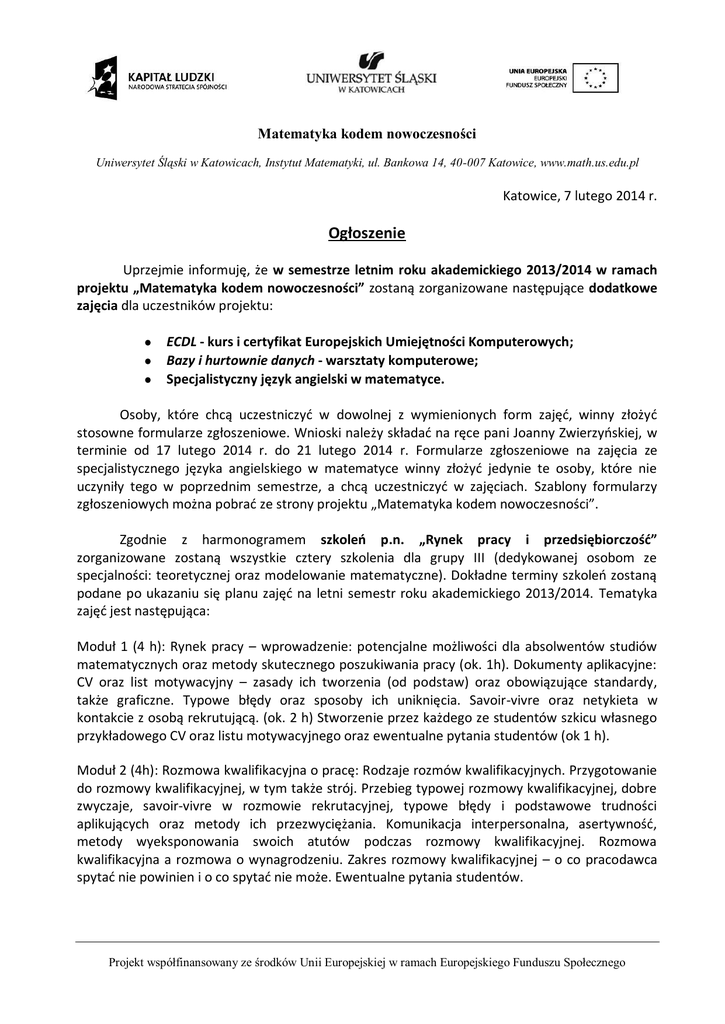Matematyka kodem nowoczesności Uniwersytet Śląski w Katowicach, Instytut Matematyki, ul. Bankowa 14, 40-007 Katowice, www.math.us.edu.pl Katowice, 7 lutego 2014 r. Ogłoszenie Uprzejmie informuję, że w semestrze letnim roku akademickiego 2013/2014 w ramach projektu „Matematyka kodem nowoczesności” zostaną zorganizowane następujące dodatkowe zajęcia dla uczestników projektu: ECDL - kurs i certyfikat Europejskich Umiejętności Komputerowych; Bazy i hurtownie danych - warsztaty komputerowe; Specjalistyczny język angielski w matematyce. Osoby, które chcą uczestniczyd w dowolnej z wymienionych form zajęd, winny złożyd stosowne formularze zgłoszeniowe. Wnioski należy składad na ręce pani Joanny Zwierzyoskiej, w terminie od 17 lutego 2014 r. do 21 lutego 2014 r. Formularze zgłoszeniowe na zajęcia ze specjalistycznego języka angielskiego w matematyce winny złożyd jedynie te osoby, które nie uczyniły tego w poprzednim semestrze, a chcą uczestniczyd w zajęciach. Szablony formularzy zgłoszeniowych można pobrad ze strony projektu „Matematyka kodem nowoczesności”. Zgodnie z harmonogramem szkoleo p.n. „Rynek pracy i przedsiębiorczośd” zorganizowane zostaną wszystkie cztery szkolenia dla grupy III (dedykowanej osobom ze specjalności: teoretycznej oraz modelowanie matematyczne). Dokładne terminy szkoleo zostaną podane po ukazaniu się planu zajęd na letni semestr roku akademickiego 2013/2014. Tematyka zajęd jest następująca: Moduł 1 (4 h): Rynek pracy – wprowadzenie: potencjalne możliwości dla absolwentów studiów matematycznych oraz metody skutecznego poszukiwania pracy (ok. 1h). Dokumenty aplikacyjne: CV oraz list motywacyjny – zasady ich tworzenia (od podstaw) oraz obowiązujące standardy, także graficzne. Typowe błędy oraz sposoby ich uniknięcia. Savoir-vivre oraz netykieta w kontakcie z osobą rekrutującą. (ok. 2 h) Stworzenie przez każdego ze studentów szkicu własnego przykładowego CV oraz listu motywacyjnego oraz ewentualne pytania studentów (ok 1 h). Moduł 2 (4h): Rozmowa kwalifikacyjna o pracę: Rodzaje rozmów kwalifikacyjnych. Przygotowanie do rozmowy kwalifikacyjnej, w tym także strój. Przebieg typowej rozmowy kwalifikacyjnej, dobre zwyczaje, savoir-vivre w rozmowie rekrutacyjnej, typowe błędy i podstawowe trudności aplikujących oraz metody ich przezwyciężania. Komunikacja interpersonalna, asertywnośd, metody wyeksponowania swoich atutów podczas rozmowy kwalifikacyjnej. Rozmowa kwalifikacyjna a rozmowa o wynagrodzeniu. Zakres rozmowy kwalifikacyjnej – o co pracodawca spytad nie powinien i o co spytad nie może. Ewentualne pytania studentów. Projekt współfinansowany ze środków Unii Europejskiej w ramach Europejskiego Funduszu Społecznego Matematyka kodem nowoczesności Uniwersytet Śląski w Katowicach, Instytut Matematyki, ul. Bankowa 14, 40-007 Katowice, www.math.us.edu.pl Moduł 3 (4h): Własna działalnośd gospodarcza: Jak założyd własną firmę? Podstawy prawne. Możliwości zdobywania dofinansowao oraz ich potencjalne źródła. Typowe błędy oraz metody zapobieżenia im. Dokumenty niezbędne do otwarcia własnej działalności gospodarczej. Ewentualne pytania studentów. Moduł 4 (4h): Podstawowe przepisy prawne związane z zatrudnieniem. Zawieranie umów: umowa o pracę, umowa zlecenie, umowa o dzieło. Dokumenty związane z zatrudnieniem. Ewentualne pytania studentów. Celem szkoleo jest wyposażenie studentów w doświadczenia i kwalifikacje potrzebne na rynku pracy oraz tym samym zwiększenie atrakcyjności kształcenia w ramach KZ poprzez wdrożenie dodatkowych zajęd merytorycznych. W spotkaniach tych mogą oczywiście uczestniczyd osoby z innych grup zajęciowych, które z losowych przyczyn (np. choroby) nie uczestniczyły w spotkaniu dedykowanym własnej grupie. Ponadto w ramach zadania „Przedsiębiorczośd i staże” zorganizowane zostaną staże zagraniczne w instytucjach naukowych dla kolejnych 20 studentów-uczestników projektu „Matematyka kodem nowoczesności”. W ramach tego zadania planowane są również trzymiesięczne staże krajowe dla aż 70 uczestników projektu. Więcej informacji na temat staży ukaże się wkrótce na stronie internetowej projektu (www.mkn.math.us.edu.pl). Kontynuowane będzie przeprowadzenie e-konsultacji. W nadchodzącym semestrze przewidziano e-konsultacje ze Wstępu do rachunku prawdopodobieństwa oraz kontynuację ekonsultacji ogólnomatematycznych dedykowanych szczególnie osobom niepełnosprawnym. Ekonsultacje odbywad się będą tradycyjnie na specjalnej platformie Moodle. Terminy e-konsultacji zostaną dostosowane do planu zajęd studentów i opublikowane po ogłoszeniu tegoż na stronie projektu. Last but not least – w ramach zwiększania atrakcyjności kształcenia na KZ Matematyka planowane jest zorganizowanie Wyjazdowych Warsztatów Naukowych. Podczas tego tygodniowego wyjazdu studenci wezmą udział w wykładach i warsztatach prowadzonych przez wybitnych specjalistów z zakresu matematyki finansowej. W Wyjazdowych Warsztatach Naukowych weźmie udział 60 studentów-uczestników projektu. Zorganizowane zostaną wówczas cztery cykle wykładowe: Cykl I (12 godzin): Tematyka ma obejmowad następujące zagadnienia: modele stopy procentowej, zabezpieczenie kwantylowe, stochastyczne równania z szumem Levy'ego. Cykl II (12 godzin): Tematyka ma obejmowad następujące zagadnienia: teoria ergodyczna procesów Markowa, analiza portfelowa, optymalne zatrzymywanie i sterowanie impulsowe, stabilnośd stochastycznych układów dynamicznych, interakcje rynków finansowych. Projekt współfinansowany ze środków Unii Europejskiej w ramach Europejskiego Funduszu Społecznego Matematyka kodem nowoczesności Uniwersytet Śląski w Katowicach, Instytut Matematyki, ul. Bankowa 14, 40-007 Katowice, www.math.us.edu.pl Cykl III(12 godzin): Tematyka ma obejmowad następujące zagadnienia: sterowanie stochastyczne, problemy ergodyczne, zagadnienia 