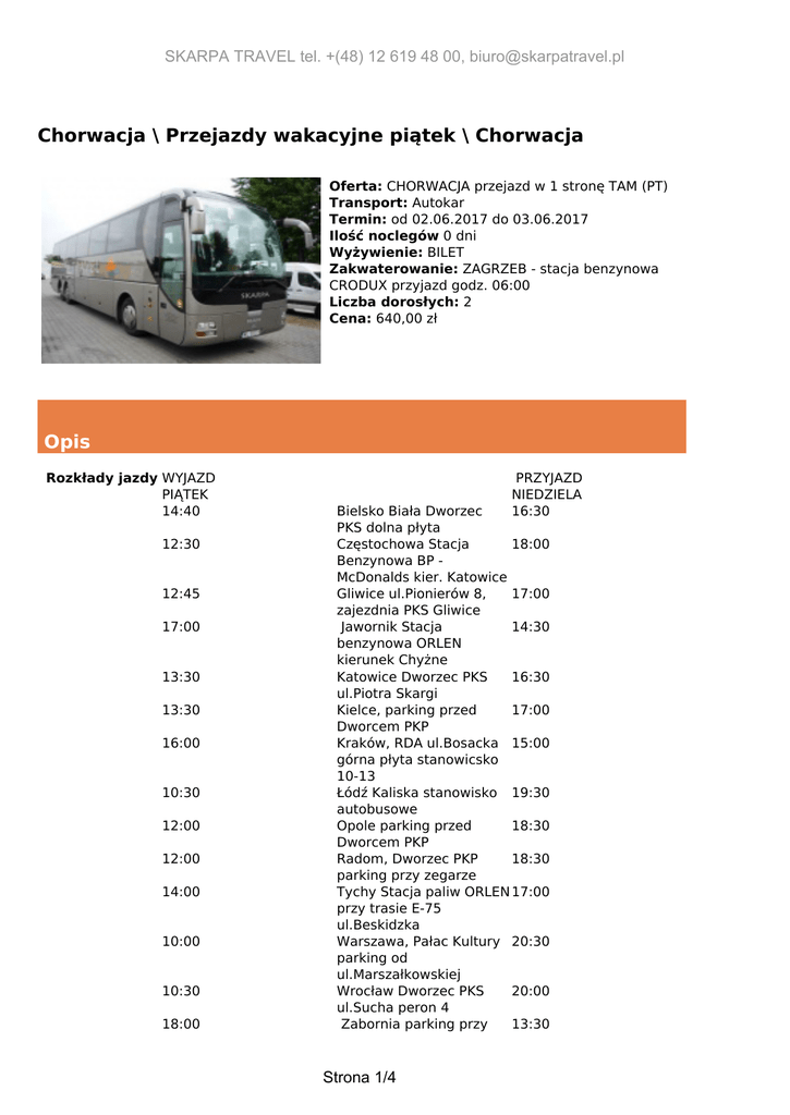 SKARPA TRAVEL tel. +(48) 12 619 48 00, [email protected] Chorwacja \ Przejazdy wakacyjne piątek \ Chorwacja Oferta: CHORWACJA przejazd w 1 stronę TAM (PT) Transport: Autokar Termin: od 02.06.2017 do 03.06.2017 Ilość noclegów 0 dni Wyżywienie: BILET Zakwaterowanie: ZAGRZEB - stacja benzynowa CRODUX przyjazd godz. 06:00 Liczba dorosłych: 2 Cena: 640,00 zł Opis Rozkłady jazdy WYJAZD PIĄTEK 14:40 12:30 12:45 17:00 13:30 13:30 16:00 10:30 12:00 12:00 14:00 10:00 10:30 18:00 PRZYJAZD NIEDZIELA 16:30 Bielsko Biała Dworzec PKS dolna płyta Częstochowa Stacja 18:00 Benzynowa BP McDonalds kier. Katowice Gliwice ul.Pionierów 8, 17:00 zajezdnia PKS Gliwice Jawornik Stacja 14:30 benzynowa ORLEN kierunek Chyżne Katowice Dworzec PKS 16:30 ul.Piotra Skargi Kielce, parking przed 17:00 Dworcem PKP Kraków, RDA ul.Bosacka 15:00 górna płyta stanowicsko 10-13 Łódź Kaliska stanowisko 19:30 autobusowe Opole parking przed 18:30 Dworcem PKP Radom, Dworzec PKP 18:30 parking przy zegarze Tychy Stacja paliw ORLEN 17:00 przy trasie E-75 ul.Beskidzka Warszawa, Pałac Kultury 20:30 parking od ul.Marszałkowskiej Wrocław Dworzec PKS 20:00 ul.Sucha peron 4 Zabornia parking przy 13:30 Strona 1/4 SKARPA TRAVEL tel. +(48) 12 619 48 00, [email protected] 18:30 restauracji Zabornianka 13:00 Jabłonka parking przy Motelu Zabornia PRZYJAZD SOBOTA 06:00 06:30 09:00 10:30 11:00 11:30 11:45 12:15 12:45 13:30 14:15 14:50 15:40 Zagrzeb stacja benzynowa OMV/CRODUX Sesveta (sobota/niedziela) Karlovac Dworzec Autobusowy Pag biuro turystyczne Meridijan 15 Tisno hotel Borownik Murter przystanek autobusowy naprzeciw stacji INA Vodice stacja benzynowa INA Sibenik stacja benzynowa INA, przy magistrali koło McDonalda Primosten Biuro Dalturs, Dalmatyński Put 7 powrót fontanna w centrum Trogir stacja benzynowa PERIĆ przy magistrali Split przystań promowa, przystanekza dworcem autobusowym Duce k.Omis biuro turystyczne Plavi Horizont, Poljicka cesta 31 Baśka Woda zatoczka przy piekarni PALMA Podgora biuro Punta Tours Branimirova Obala 83 15:10 WYJAZD SOBOTA 01:40 00:50 21:50 20:00 19:50 19:20 19:00 18:20 20:40 20:00 19:20 18:50 18:20 18:40 Makarska stacja INA 1. Na wyjazd potrzebny ważny paszport lub dowód osobisty. Cena w PLN zawiera Przejazd autokarem, ubezpieczenie komunikacyjne, opłatę na Turystyczny Fundusz Gwarancyjny. Uwagi przewoźnika 1.Transport na trasach antenowych w Polsce możliwy jest mikrobusem, autokarem klasy turystycznej, samochodem osobowym lub innym przewoźnikiem np. Polskim Busem, Luxbusem, PKP, PKS itp. Ewentualną zmianę godzin odjazdów podamy najpóźniej na 24 godziny przed odjazdem. Trasa połączeń na terenie kraju zależy od zgłoszeń z poszczególnych miast, co może spowodować, ze przejazd nie będzie realizowany najkrótszą z możliwych tras. 2. Na trasach poza granicami Polski transport odbywa się autokarami wyposażonymi w siedzenia uchylne, klimatyzację, toalety, video i nagłośnienie. Przy małej ilości osób, możliwość przewozu uczestników małym autobusem bez WC i mini baru, wtedy toalety na postojach płatne przez przewoźnika. 3. Podane godziny wyjazdów i przyjazdów mogą ulec zmianie z różnych przyczyn np. złe warunki drogowe, atmosferyczne, zwiększanie ruchu na drogach szczególnie w szczycie Strona 2/4 SKARPA TRAVEL tel. +(48) 12 619 48 00, [email protected] sezonu letniego i inne. 4. Prosimy o przybycie na miejsce zbiórki najpóźniej 15 minut przed planowaną godziną odjazdu. Miejsca w autokarze są przydzielane w kolejności podpisania umowy, a klienci o miejscach informowani są przez obsługę na miejscu zbiórki. W autokarze obowiązuje całkowity zakaz palenia papierosów oraz spożywania alkoholu. Osoby korzystające z samego przejazdu, powinny obowiązkowo ubezpieczyć się na czas pobytu. Przewoźnik gwarantuje tylko ubezpieczenie na czas przejazdu. Uwagi organizatora 1. Do poruszania się po krajach należących do strefy Schengen potrzebny jest dokument podróży: dowód osobisty lub paszport. Prosimy pamiętać o dokumencie dla dzieci. 2. Warunki uczestnictwa w imprezach organizowanych przez SKARPA TRAVEL Sp. z o.o. stanowią integralną część oferty, dostępne są w biurach sprzedających ofertę oraz na stronie: www.skarpatravel.pl. 3. W dniu wykupienia imprezy/ wpłaty zaliczki klient ma możliwość wykupienia dodatkowego ubezpieczenia od kosztów rezygnacji z imprezy zgodnie z Ogólnymi Warunkmi Ubezpieczenia KOSZTÓW IMPREZY TURYSTYCZNEJ w wysokości 4,41% jednak nie później niż 5 dni od dnia podpisania umowy. Praktyczne informacje Najblizsza placówka dyplomatyczna:Ambasada RP, Krlezin Gvozd 3, 10000 Zagreb tel. (+385) 14834575, 4834579 fax. (+385)14834577 Wydzial Konsularnytel/fax ( +385) 14899444 Obowiązująca waluta: 1 kuna (HRK) = 100 lip 1 EUR = ok. 7,2 kun Rozkład jazdy Miasto wyjazdu Miejsce wyjazdu Godzina wyjazdu Bielsko Biała Dworzec PKS dolna płyta (antenka) 14:40 20 zł Częstochowa stacja BP McDonald's kierunek Katowice (antenka) ul.Pionierów 8, zajezdnia PKS (antenka) parking przy Policji 12:30 60 zł 12:45 20 zł 18:30 - Gliwice Jabłonka Strona 3/4 Dopłata SKARPA TRAVEL tel. +(48) 12 619 48 00, [email protected] Jawornik stacja benzynowa BP (dawny Orlen) kierunek na Chyżne Dworzec PKS ul.P.Skargi (antenka) 17:00 - 13:30 20 zł Dworzec PKS , stanowiska G 9-11 ul.Bosacka parking przed Dworcem PKP (antenka) 16:00 - 12:00 80 zł Radom Dworzec PKP parking przy zegarze (antenka) 12:00 80 zł Tychy stacja ORLEN przy trasie E-75 ul.Beskidzka (antenka) PKiN parking od ul.Marszałkowskiej (antenka) tymczasowy dworzec POLBUS-PKS (antenka) 14:00 20 zł 10:00 100 zł 10:30 80 zł Zabornia parking przy Motelu Zabornia 18:00 - Łódż Kaliska stanowiska autobusowe (antenka) 10:30 100 zł Katowice Kraków Opole Warszawa Wrocław Strona 4/4 Powered by TCPDF (www.tcpdf.org)