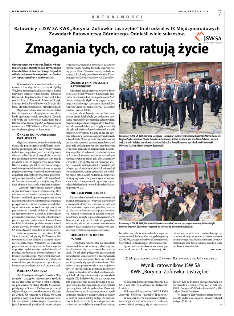 W W W.NOW YGORNIK.PL 7 16 –3 0 W R Z E Ś N I A 2 014 A K T U A L N O Ś C I Ratownicy z JSW SA KWK „Borynia–Zofiówka–Jastrzębie” brali udział w IX Międzynarodowych Zawodach Ratownictwa Górniczego. Odnieśli wiele sukcesów. Zmagania tych, co ratują życie Ósmego września w Operze Śląskiej w Bytomiu oficjalnie otwarto IX Międzynarodowe Zawody Ratownictwa Górniczego. Tego dnia odbyło się losowanie kolejności startów drużyn w poszczególnych konkurencjach. W zawodach wzięło udział 21 drużyn ratowniczych z całego świata. Jastrzębską Spółkę Węglową reprezentowali ratownicy z Ruchu Borynia w składzie: Adam Szkołda, Sebastian Krawczyk, Bogdan Sojka, Franciszek Chorowski, Marcin Kaczorek, Mirosław Ślazyk, Mariusz Sojka, Paweł Panowicz, Marcin Holeksa, Mirosław Studniczek i Mirosław Dłucik. Międzynarodowe Zawody Ratownictwa Górniczego trwały do piątku, 12 września, kiedy ogłoszono wyniki rywalizacji. Zawody odbywały się na terenach Centralnej Stacji Ratownictwa Górniczego SA w Bytomiu oraz na terenach EXPO Silesia – Centrum Targowo-Konferencyjnego w Sosnowcu. O kazja do podniesienia kwalifikacj Międzynarodowe zawody były doskonałą okazją do podnoszenia kwalifikacji ratowników górniczych, jak i do wymiany wiedzy technicznej i organizacyjnej. Uczestnicy zawodów poznali także struktury służb ratownictwa górniczego innych krajów, w tym zasady działania oraz ich wyposażenie ratownicze. Bardzo ważna była także możliwość bezpośredniej wymiany doświadczeń oraz integracja międzynarodowego środowiska ratowniczego, co nabiera szczególnego znaczenia przy przewidywanym i możliwym do realizacji udziale służb ratownictwa różnych krajów przy likwidacji skutków katastrofy w jednym miejscu. – Zastępy ratowników wzięły udział w pięciu konkurencjach: symulowanej akcji ratowniczej, teście wiedzy ratowniczej, w konkurencji mechanik aparatowy, podczas której należało prawidłowo zidentyfikować wcześniej przygotowane usterki w aparacie oddechowym ratownika, w konkurencji mechanik pomiarowiec należało dokonać identyfikacji przygotowanych usterek w podręcznym przyrządzie pomiarowym oraz w konkurencji pierwsza pomoc podczas symulowanych warunków środowiska podziemnego – mówił Adam Nowak, dyrektor techniczny CSRG SA i koordynator zawodów ze strony stacji. Podczas zawodów (11 września, CSRG SA w Bytomiu) odbyły się III Warsztaty Ratownicze dla specjalistów z zakresu ratownictwa górniczego. Warsztaty, jak wykazały poprzednie edycje, są właściwą formą wymiany praktycznych i teoretycznych doświadczeń pomiędzy fachowcami z branży górniczej i ratownictwa górniczego. Motywami przewodnimi tegorocznych warsztatów były struktura ratownictwa górniczego w różnych krajach i metody prowadzenia działań ratowniczych. A merykańska idea Idea Międzynarodowych Zawodów Górniczych – zastępów ratowniczych zrodziła się na przełomie 1997/1998 roku z inicjatywy podsekretarza stanu Davitta Mc’Ateera, pełniącego w Stanach Zjednoczonych urząd odpowiadający stanowisku prezesa Wyższego Urzędu Górniczego w Polsce. Mc’Ateer podczas pobytu w Europie zaprosił swoich partnerów z kilku krajów reprezentujących przemysł górniczy do uczestnictwa w międzynarodowych zawodach zastępów ratowniczych, według formuły wypracowanej przez USA. Pierwsze zawody odbyły się w 1999 roku, kiedy powołano Komitet Koordynujący dla Międzynarodowych Zawodów. D obre wyniki polskich ratowników Uroczyste zakończenie zawodów odbyło się w Galerii Szyb Wilson w Katowicach. Sukcesów zwycięskim drużynom gratulowali Piotr Litwa, wojewoda śląski oraz organizatorzy międzynarodowego spotkania ratowników: Andrzej Chłopek, prezes CSRG, i Mirosław Koziura, prezes WUG. – Zawody odbywają się co dwa lata, po raz drugi Polska była gospodarzem spotkania ratowników górniczych z całego świata. Na pewno tegoroczne zmagania były trudniejsze od poprzednich edycji. Nigdy wcześniej nie było tak dużo zadań odzwierciedlających rzeczywiste sytuacje, z jakimi mogą się spotkać ratownicy podczas akcji prowadzonych w kopalniach. Nowa formuła zawodów została pozytywnie oceniona przez uczestników, choć dużo było dyskusji ratowników przed startem w poszczególnych konkurencjach. Staraliśmy się połączyć szkolenie ze sprawdzianem praktycznych umiejętności oraz wirtualnym rozwiązywaniem zadań tak, aby uczestnicy wynieśli z tego spotkania jak najwięcej wiedzy i nowych umiejętności. Oczywiście, jak to bywa przy każdej rywalizacji, ktoś uzyskał więcej punktów, a inny uplasował się w dolnej części tabeli. Mam nadzieję, że wszystkie zastępy wywożą z tegorocznych zawodów wiele dobrych wspomnień i sympatycznych, koleżeńskich relacji –mówił Mirosław Koziura, prezes WUG. Ratownicy z JSW SA KWK „Borynia–Zofiówka–Jastrzębie”. Od lewej: Bronisław Budziński, Marcin Kaczorek, Bogdan Sojka, Mirosław Dłucik, Franciszek Chorowski, Antoni Jakubów nad nim Adam Szkołda, Mariusz Sojka, Marcin Holeksa nad nim dyr. Czesław Kubaczka, Paweł Panowicz nad nim Paweł Pawłowski, Mirosław Ślazyk nad nim Mirosław Studniczek. N ie było publiczności Uczestnikom zawodów nie towarzyszył doping publiczności. Wszyscy zawodnicy wykonywali identyczne zadania bez udziału obserwatorów zagrzewających do rywalizacji. Liczyła się koncentracja, praca zespołowa i wiedza wyniesiona ze szkoleń oraz doświadczenie zdobyte w prowadzonych akcjach. Tempo realizacji zadań miało drugorzędne znaczenie, ale w ostatecznym sumowaniu punktów rozstrzygnęło o zwycięstwie w konkurencji symulowanej akcji ratowniczej. D ebiutanci w dobrej formie – Debiutanci radzili sobie na zawodach tak samo dobrze jak zastępy najbardziej doświadczone w międzynarodowych rywalizacjach. To był efekt połączenia praktycznych umiejętności wyniesionych z rzeczywistych akcji z formułą zawodów. Podcz