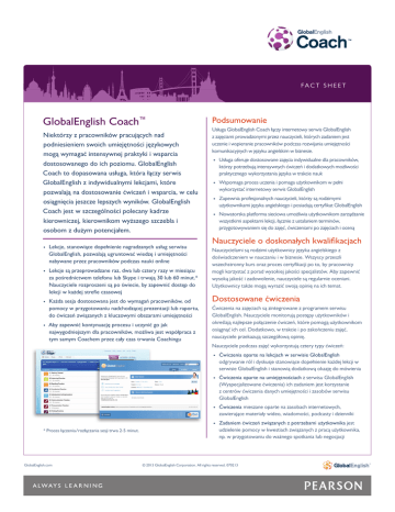 FACT SHEET GlobalEnglish Coach™ Niektórzy z pracowników pracujących nad podniesieniem swoich umiejętności językowych mogą wymagać intensywnej praktyki i wsparcia dostosowanego do ich poziomu. GlobalEnglish Coach to dopasowana usługa, która łączy serwis GlobalEnglish z indywidualnymi lekcjami, które pozwalają na dostosowanie ćwiczeń i wsparcia, w celu osiągnięcia jeszcze lepszych wyników. GlobalEnglish Coach jest w szczególności polecany kadrze kierowniczej, kierownikom wyższego szczebla i osobom z dużym potencjałem. •• Lekcje, stanowiące dopełnienie nagradzanych usług serwisu GlobalEnglish, pozwalają ugruntować wiedzę i umiejętności nabywane przez pracowników podczas nauki online •• Lekcje są przeprowadzane raz, dwa lub cztery razy w miesiącu za pośrednictwem telefonu lub Skype i trwają 30 lub 60 minut.* Nauczyciele rozproszeni są po świecie, by zapewnić dostęp do lekcji w każdej strefie czasowej •• Każda sesja dostosowana jest do wymagań pracowników, od pomocy w przygotowaniu nadchodzącej prezentacji lub raportu, do ćwiczeń związanych z kluczowymi obszarami umiejętności •• Aby zapewnić kontynuację procesu i uczynić go jak najwygodniejszym dla pracowników, możliwa jest współpraca z tym samym Coachem przez cały czas trwania Coachingu Podsumowanie Usługa GlobalEnglish Coach łączy internetowy serwis GlobalEnglish z zajęciami prowadzonymi przez nauczycieli, których zadaniem jest uczenie i wspieranie pracowników podczas rozwijania umiejętności komunikacyjnych w języku angielskim w biznesie. •• Usługa oferuje dostosowane zajęcia indywidualne dla pracowników, którzy potrzebują intensywnych ćwiczeń i dodatkowych możliwości praktycznego wykorzystania języka w trakcie nauk •• Wspomaga proces uczenia i pomaga użytkownikom w pełni wykorzystać internetowy serwis GlobalEnglish •• Zapewnia profesjonalnych nauczycieli, którzy są rodzimymi użytkownikami języka angielskiego i posiadają certyfikat GlobalEnglish •• Nowatorska platforma sieciowa umożliwia użytkownikom zarządzanie wszystkimi aspektami lekcji, łącznie z ustalaniem terminów, przygotowywaniem się do zajęć, ćwiczeniami po zajęciach i oceną Nauczyciele o doskonałych kwalifikacjach Nauczycielami są rodzimi użytkownicy języka angielskiego z doświadczeniem w nauczaniu i w biznesie. Wszyscy przeszli wszechstronny kurs oraz proces certyfikacji po to, by pracownicy mogli korzystać z porad wysokiej jakości specjalistów. Aby zapewnić wysoką jakość i zadowolenie, nauczyciele są regularnie oceniani. Użytkownicy także mogą wyrazić swoją opinię na ich temat. Dostosowane ćwiczenia Ćwiczenia na zajęciach są zintegrowane z programem serwisu GlobalEnglish. Nauczyciele monitorują postępy użytkowników i określają najlepsze połączenie ćwiczeń, które pomogą użytkownikom osiągnąć ich cel. Dodatkowo, w trakcie i po zakończeniu zajęć, nauczyciele przekazują szczegółową opinię. Nauczyciele podczas zajęć wykorzystują cztery typy ćwiczeń: * Proces łączenia/rozłączania sesji trwa 2-5 minut. GlobalEnglish.com •• Ćwiczenia oparte na lekcjach w serwisie GlobalEnglish odgrywanie ról i dyskusje stanowiące dopełnienie każdej lekcji w serwisie GlobalEnglish i stanowią dodatkową okazję do mówienia •• Ćwiczenia oparte na umiejętnościach z serwisu GlobalEnglish (Wyspecjalizowane ćwiczenia) ich zadaniem jest korzystanie z centrów ćwiczenia danych umiejętności i zasobów serwisu GlobalEnglish •• Ćwiczenia mieszane oparte na zasobach internetowych, zawierające materiały wideo, wiadomości, podcasty i dzienniki •• Zadaniem ćwiczeń związanych z potrzebami użytkownika jest udzielenie pomocy w kwestiach związanych z pracą użytkownika, np. w przygotowaniu do ważnego spotkania lub negocjacji © 2013 GlobalEnglish Corporation. All rights reserved. 070213