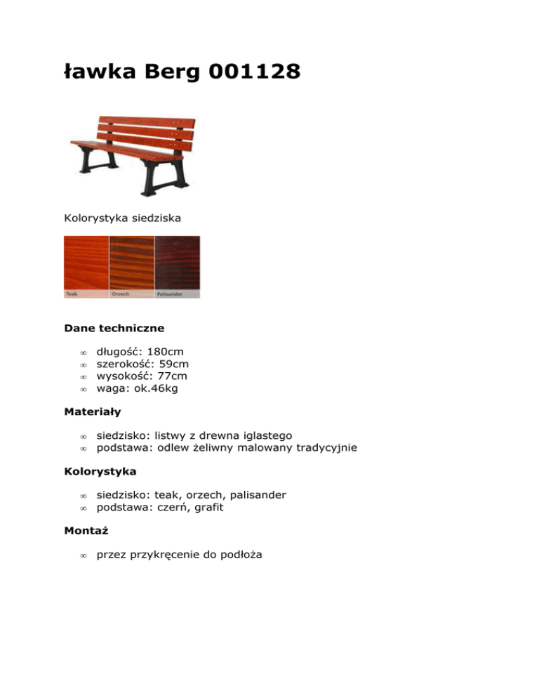 ławka Berg 001128 Kolorystyka siedziska Dane techniczne • • • • długość: 180cm szerokość: 59cm wysokość: 77cm waga: ok.46kg Materiały • • siedzisko: listwy z drewna iglastego podstawa: odlew Ŝeliwny malowany tradycyjnie Kolorystyka • • siedzisko: teak, orzech, palisander podstawa: czerń, grafit MontaŜ • przez przykręcenie do podłoŜa