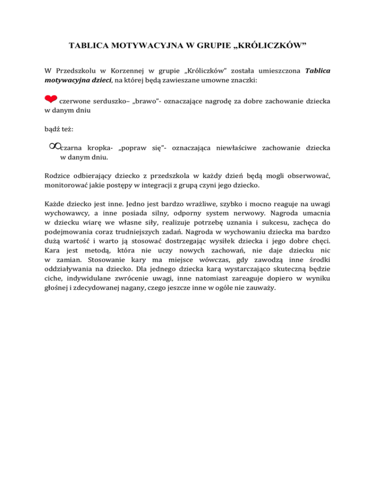 TABLICA MOTYWACYJNA W GRUPIE „KRÓLICZKÓW” W Przedszkolu w Korzennej w grupie „Króliczków” została umieszczona Tablica motywacyjna dzieci, na której będą zawieszane umowne znaczki: czerwone serduszko– „brawo”- oznaczające nagrodę za dobre zachowanie dziecka w danym dniu bądź też: • czarna kropka- „popraw się”- oznaczająca niewłaściwe zachowanie dziecka w danym dniu. Rodzice odbierający dziecko z przedszkola w każdy dzień będą mogli obserwować, monitorować jakie postępy w integracji z grupą czyni jego dziecko. Każde dziecko jest inne. Jedno jest bardzo wrażliwe, szybko i mocno reaguje na uwagi wychowawcy, a inne posiada silny, odporny system nerwowy. Nagroda umacnia w dziecku wiarę we własne siły, realizuje potrzebę uznania i sukcesu, zachęca do podejmowania coraz trudniejszych zadań. Nagroda w wychowaniu dziecka ma bardzo dużą wartość i warto ją stosować dostrzegając wysiłek dziecka i jego dobre chęci. Kara jest metodą, która nie uczy nowych zachowań, nie daje dziecku nic w zamian. Stosowanie kary ma miejsce wówczas, gdy zawodzą inne środki oddziaływania na dziecko. Dla jednego dziecka karą wystarczająco skuteczną będzie ciche, indywidulane zwrócenie uwagi, inne natomiast zareaguje dopiero w wyniku głośnej i zdecydowanej nagany, czego jeszcze inne w ogóle nie zauważy.