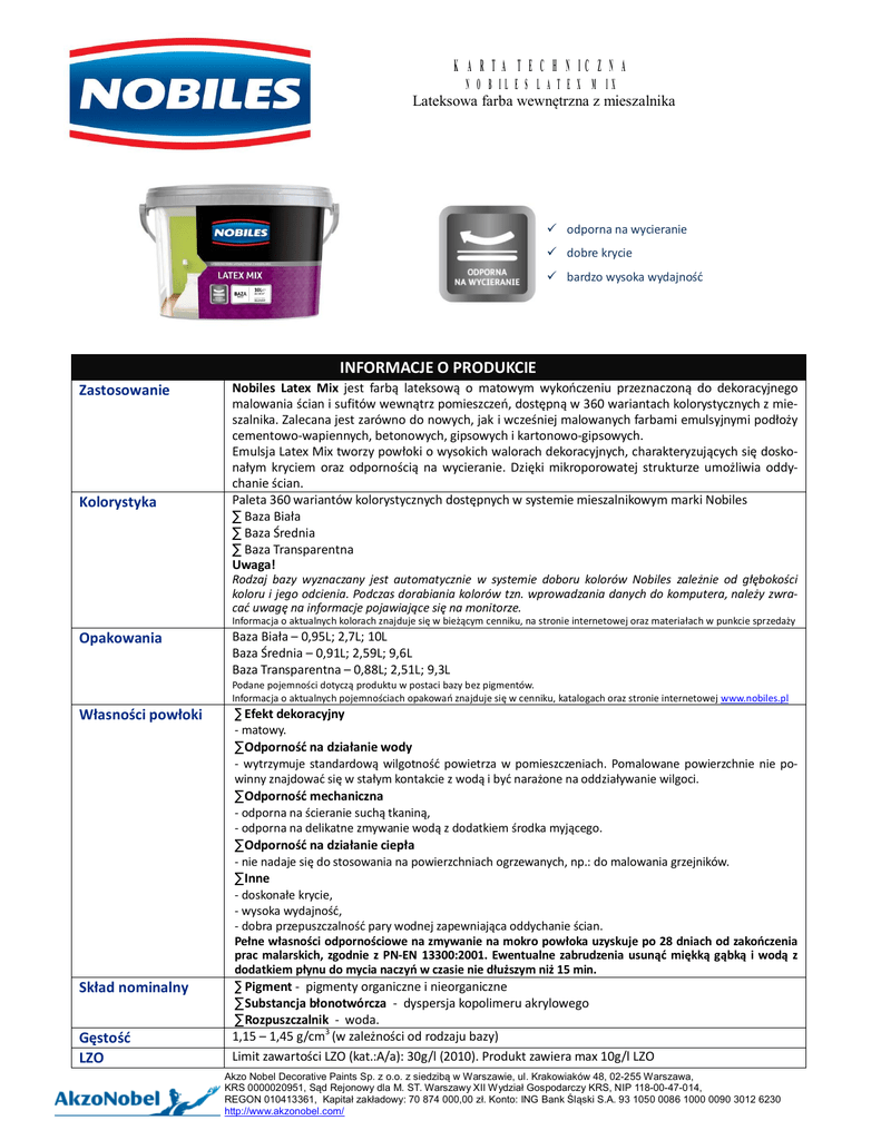 KARTA TECHNICZNA NOBILES LATEX MIX Lateksowa farba wewnętrzna z mieszalnika ü odporna na wycieranie ü dobre krycie ü bardzo wysoka wydajność INFORMACJE O PRODUKCIE Zastosowanie Kolorystyka Nobiles Latex Mix jest farbą lateksową o matowym wykończeniu przeznaczoną do dekoracyjnego malowania ścian i sufitów wewnątrz pomieszczeń, dostępną w 360 wariantach kolorystycznych z mieszalnika. Zalecana jest zarówno do nowych, jak i wcześniej malowanych farbami emulsyjnymi podłoży cementowo-wapiennych, betonowych, gipsowych i kartonowo-gipsowych. Emulsja Latex Mix tworzy powłoki o wysokich walorach dekoracyjnych, charakteryzujących się doskonałym kryciem oraz odpornością na wycieranie. Dzięki mikroporowatej strukturze umożliwia oddychanie ścian. Paleta 360 wariantów kolorystycznych dostępnych w systemie mieszalnikowym marki Nobiles · Baza Biała · Baza Średnia · Baza Transparentna Uwaga! Rodzaj bazy wyznaczany jest automatycznie w systemie doboru kolorów Nobiles zależnie od głębokości koloru i jego odcienia. Podczas dorabiania kolorów tzn. wprowadzania danych do komputera, należy zwracać uwagę na informacje pojawiające się na monitorze. Informacja o aktualnych kolorach znajduje się w bieżącym cenniku, na stronie internetowej oraz materiałach w punkcie sprzedaży Opakowania Baza Biała – 0,95L; 2,7L; 10L Baza Średnia – 0,91L; 2,59L; 9,6L Baza Transparentna – 0,88L; 2,51L; 9,3L Podane pojemności dotyczą produktu w postaci bazy bez pigmentów. Informacja o aktualnych pojemnościach opakowań znajduje się w cenniku, katalogach oraz stronie internetowej www.nobiles.pl Własności powłoki · Efekt dekoracyjny - matowy. · Odporność na działanie wody - wytrzymuje standardową wilgotność powietrza w pomieszczeniach. Pomalowane powierzchnie nie powinny znajdować się w stałym kontakcie z wodą i być narażone na oddziaływanie wilgoci. · Odporność mechaniczna - odporna na ścieranie suchą tkaniną, - odporna na delikatne zmywanie wodą z dodatkiem środka myjącego. · Odporność na działanie ciepła - nie nadaje się do stosowania na powierzchniach ogrzewanych, np.: do malowania grzejników. · Inne Skład nominalny Gęstość LZO - doskonałe krycie, - wysoka wydajność, - dobra przepuszczalność pary wodnej zapewniająca oddychanie ścian. Pełne własności odpornościowe na zmywanie na mokro powłoka uzyskuje po 28 dniach od zakończenia prac malarskich, zgodnie z PN-EN 13300:2001. Ewentualne zabrudzenia usunąć miękką gąbką i wodą z dodatkiem płynu do mycia naczyń w czasie nie dłuższym niż 15 min. · Pigment - pigmenty organiczne i nieorganiczne · Substancja błonotwórcza - dyspersja kopolimeru akrylowego · Rozpuszczalnik - woda. 1,15 – 1,45 g/cm3 (w zależności od rodzaju bazy) Limit zawartości LZO (kat.:A/a): 30g/l (2010). Produkt zawiera max 10g/l LZO Akzo Nobel Decorative Paints Sp. z o.o. z siedzibą w Warszawie, ul. Krakowiaków 48, 02-255 Warszawa, KRS 0000020951, Sąd Rejonowy dla M. ST. Warszawy XII Wydział Gospodarczy KRS, NIP 118-00-47-014, REGON 010413361, Kapitał zakładowy: 70 874 000,00 zł. Konto: ING Bank Śląski S.A. 93 1050 0086 1000 0090 3012 6230 http://www.akzonobel.com/ KARTA TECHNICZNA NOBILES LATEX MIX Lateksowa farba wewnętrzna z mieszalnika Schnięcie Dla pojedynczej warstwy, w temperaturze ok.+230C i wilgotności względnej ok. 50%, przy dobrej wentylacji: - do schnięcia powierzchniowego – 2 godziny - do nakładania następnej warstwy – 2-4 godziny Obniżenie temperatury i/lub wzrost wilgotności może wydłużyć czas schnięcia. Ilość warstw Wydajność Rozcieńczalnik Okres ważności 2 warstwy Do 18 m2/l przy jednokrotnym malowaniu na gładkiej, równej i odpowiednio przygotowanej powierzchni podłoża. Woda pitna Okres przydatności: 2 lata od daty produkcji. Przygotowanie wyrobu W razie potrzeby, dla uzyskania lepszych parametrów aplikacyjnych, dopuszcza się rozcieńczenie wyrobu max. do 10% obj. wodą. Nie dodawać obcych składników. Przed użyciem farbę dokładnie wymieszaj. Powierzchnie powinny być zwarte, jednolite, czyste i suche (np. tynki malować po 4 tygodniach sezonowania lub po czasie wskazanym przez producenta danego tynku, gładzi, szpachli). W przypadku podłoży poddanych renowacji należy ocenić stan podłoża. Jeżeli jest stare i zwietrzałe, kruszące się i pylące powinno być poddane ekspertyzie budowlanej. 1. Powłoki farb wapiennych, klejowych oraz słabo przyczepnych należy całkowicie usunąć z podłoża, a następnie powierzchnie przemyj wodą w celu usunięcia pylistych pozostałości i kurzu. Pozostaw do wyschnięcia. 2. Z powierzchni należy usunąć zanieczyszczenia ograniczające przyczepność farby (tłuste plamy, pleśń). Zanieczyszczenia zmyj wodą ze środkiem myjącym. Pozostaw do wyschnięcia. 3. Powierzchnie zagrzybione oczyść za pomocą szpachelki, a następnie zastosuj odpowiedni środek grzybobójczy. 4. Nierówności i uszkodzenia powierzchni wypełnij odpowiednią masą szpachlową, a następnie wyrównaj i wygładź. 5. Zagruntuj malowane powierzchnie: · Podłoża pyliste i silnie nasiąkliwe np. podłoża gipsowe, zagruntuj wstępnie podkładem Nobiles Nobigrunt. · Na podłoża wcześniej niemalowane lub niejednolite nałóż warstwę podkładową z farby Nobiles Latex Mix rozcieńczoną 10% dodatkiem wody pitnej. · Podłoża wcześniej malowane farbami emulsyjnymi, których powierzchnia jest jednolita, dobrze przyczepna, nie jest pyląca lub uszkodzona malować bez gruntowania. Dane identyfikujące wyrób oraz termin upływu ważności wyrobu podawany jest na opakowaniu jednostkowym. STOSOWANIE PRODUKTU Przygotowanie podłoża Malowanie Uwaga! Na podłożach uprzednio malowanych wykonaj na małej powierzchni wymalowanie próbne. Jeżeli po wyschnięciu farby powstanie niepożądany efekt, poprzednie powłoki należy całkowicie usunąć i na nowo przygotować je do malowania. · Warunki malowania 0 0 - t