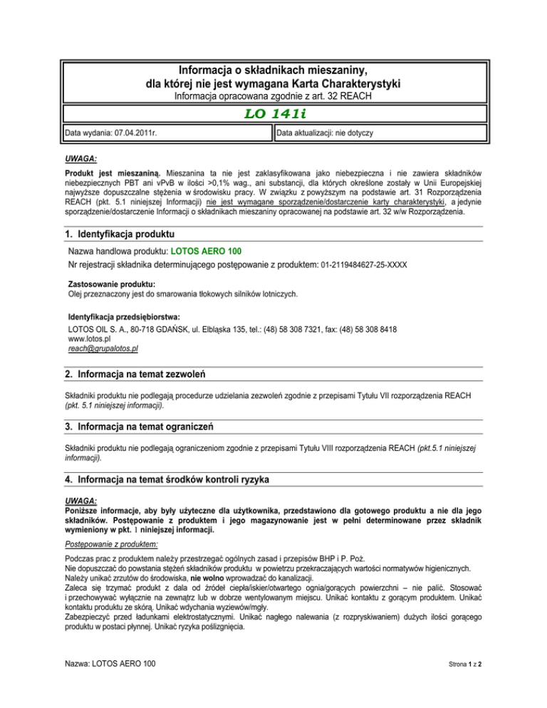 Informacja o składnikach mieszaniny, dla której nie jest wymagana Karta Charakterystyki Informacja opracowana zgodnie z art. 32 REACH LO 141i Data wydania: 07.04.2011r. Data aktualizacji: nie dotyczy UWAGA: Produkt jest mieszaniną. Mieszanina ta nie jest zaklasyfikowana jako niebezpieczna i nie zawiera składników niebezpiecznych PBT ani vPvB w ilości >0,1% wag., ani substancji, dla których określone zostały w Unii Europejskiej najwyższe dopuszczalne stężenia w środowisku pracy. W związku z powyższym na podstawie art. 31 Rozporządzenia REACH (pkt. 5.1 niniejszej Informacji) nie jest wymagane sporządzenie/dostarczenie karty charakterystyki, a jedynie sporządzenie/dostarczenie Informacji o składnikach mieszaniny opracowanej na podstawie art. 32 w/w Rozporządzenia. 1. Identyfikacja produktu Nazwa handlowa produktu: LOTOS AERO 100 Nr rejestracji składnika determinującego postępowanie z produktem: 01-2119484627-25-XXXX Zastosowanie produktu: Olej przeznaczony jest do smarowania tłokowych silników lotniczych. Identyfikacja przedsiębiorstwa: LOTOS OIL S. A., 80-718 GDAŃSK, ul. Elbląska 135, tel.: (48) 58 308 7321, fax: (48) 58 308 8418 www.lotos.pl [email protected] 2. Informacja na temat zezwoleń Składniki produktu nie podlegają procedurze udzielania zezwoleń zgodnie z przepisami Tytułu VII rozporządzenia REACH (pkt. 5.1 niniejszej informacji). 3. Informacja na temat ograniczeń Składniki produktu nie podlegają ograniczeniom zgodnie z przepisami Tytułu VIII rozporządzenia REACH (pkt.5.1 niniejszej informacji). 4. Informacja na temat środków kontroli ryzyka UWAGA: Poniższe informacje, aby były użyteczne dla użytkownika, przedstawiono dla gotowego produktu a nie dla jego składników. Postępowanie z produktem i jego magazynowanie jest w pełni determinowane przez składnik wymieniony w pkt. 1 niniejszej informacji. Postępowanie z produktem: Podczas prac z produktem należy przestrzegać ogólnych zasad i przepisów BHP i P. Poż. Nie dopuszczać do powstania stężeń składników produktu w powietrzu przekraczających wartości normatywów higienicznych. Należy unikać zrzutów do środowiska, nie wolno wprowadzać do kanalizacji. Zaleca się trzymać produkt z dala od źródeł ciepła/iskier/otwartego ognia/gorących powierzchni – nie palić. Stosować i przechowywać wyłącznie na zewnątrz lub w dobrze wentylowanym miejscu. Unikać kontaktu z gorącym produktem. Unikać kontaktu produktu ze skórą. Unikać wdychania wyziewów/mgły. Zabezpieczyć przed ładunkami elektrostatycznymi. Unikać nagłego nalewania (z rozpryskiwaniem) dużych ilości gorącego produktu w postaci płynnej. Unikać ryzyka poślizgnięcia. Nazwa: LOTOS AERO 100 Strona 1 z 2 Wartości graniczne narażenia NDS substancji (pkt. 5.6 niniejszej Informacji): Nazwa substancji Oleje mineralne - faza ciekła aerozolu* NDS (mg/m3) 5 NDSCh (mg/m3) 10 NDSP - * W warunkach, gdy nie powstają mgły i opary - nie dotyczy Magazynowanie produktu: Olej należy przechowywać w opakowaniach zamkniętych, chroniących przed dostępem powietrza, wilgoci oraz zanieczyszczeń mechanicznych z zachowaniem ogólnych przepisów BHP i przeciwpożarowych. Zalecane środki ochrony indywidualnej: Ochrona dróg oddechowych: Nie wymaga się specjalnego zabezpieczenia, nie należy jednak wdychać par produktu. W przypadku rozlania produktu i w zależności od ilości rozlanego produktu oraz szacowanego zakresu narażenia można zastosować półmaskę lub pełną maskę oddechową z połączonymi filtrami przeciwpyłowymi/filtrami oparów substancji organicznych albo autonomiczny aparat oddechowy. Jeśli nie można w pełni ocenić sytuacji lub jeśli istnieje zagrożenie niedoborem tlenu, należy stosować wyłącznie autonomiczny aparat oddechowy. Ochrona rąk i skóry: Nie wymaga się specjalnego zabezpieczenia, chociaż w celu zminimalizowania ewentualnego ryzyka zaleca się stosowanie odzieży ochronnej oraz rękawic zapewniających skuteczne zabezpieczenie przed czynnikami chemicznymi, szczególnie węglowodorami aromatycznymi. Rękawice powinny być termoodporne i izolowane termicznie, jeśli możliwy lub spodziewany jest kontakt z gorącym produktem. Rękawice wykonane z polioctanu winylu (PVA) nie są wodoszczelne, dlatego nie nadają się do zastosowania w nagłych wypadkach. Ochrona oczu i twarzy: Nie wymaga się specjalnej ochrony, chociaż dobrym zwyczajem jest stosowanie okularów ochronnych a w przypadku zagrożenia rozpryskiwaniem - pełnej osłony głowy, twarzy i szyi. Informacje o transporcie: Produkt nie podlega przepisom ADR/RID (pkt. 5.8 - 5.10 niniejszej Informacji) 5. Informacja prawne 5.1. Rozporządzenie (WE) NR 1907/2006 Parlamentu Europejskiego i Rady z dnia 18 grudnia 2006r. w sprawie rejestracji, oceny, udzielania zezwoleń i stosowanych ograniczeń w zakresie chemikaliów (REACH) i utworzenia Europejskiej Agencji Chemikaliów (Dz. Urz. UE seria L nr 396 z 30 grudnia 2006r. oraz sprostowanie Dz. Urz. UE seria L nr 136 z 29 maja 2007r.) 5.2. Ustawa z dnia 25 lutego 2011r. o substancjach chemicznych i ich mieszaninach (Dz. U. 11.63.322) 5.3. Rozporządzenie Ministra Zdrowia z dnia 2 września 2003r. w sprawie kryteriów i sposobu klasyfikacji substancji i preparatów chemicznych (Dz. U. 03.171.1666 z późn. zm.) 5.4. Rozporządzenie Parlamentu Europejskiego i Rady (WE) NR 1272/2008 z dnia 16 grudnia 2008 r. w sprawie klasyfikacji, oznakowania i pakowania substancji i mieszanin, zmieniające i uchylające dyrektywy 67/548/EWG i 1999/45/WE oraz zmieniające rozporządzenie (WE) nr 1907/2006 (Dz. Urz. UE seria L nr 353 z 31 grudnia 2008r. z późn. zm.) 5.5. Rozporządzenie Ministra Zdrowia z dnia 5 marca 2009r. w sprawie oznakowania opakowań substancji niebezpiecznych i preparatów niebezpiecznych oraz niektórych preparatów chemicznych (Dz. U. 09.53.439) 5.6. Rozporządzenie Ministra Pracy i Polityki Społecznej z dnia 29 listopada 2002r. w sprawie najwyższych dopuszczal