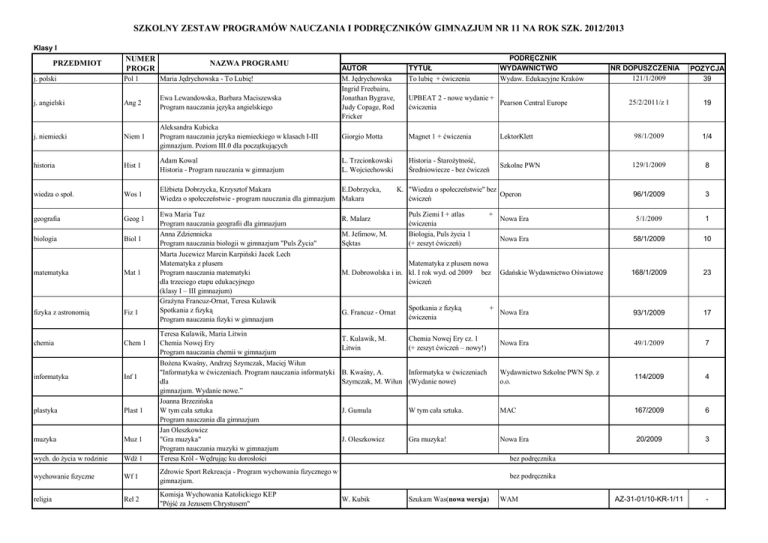SZKOLNY ZESTAW PROGRAMÓW NAUCZANIA I PODRĘCZNIKÓW GIMNAZJUM NR 11 NA ROK SZK. 2012/2013 Klasy I PRZEDMIOT NUMER PROGR NAZWA PROGRAMU AUTOR M. Jędrychowska Ingrid Freebairu, Jonathan Bygrave, Judy Copage, Rod Fricker TYTUŁ To lubię + ćwiczenia PODRĘCZNIK WYDAWNICTWO Wydaw. Edukacyjne Kraków j. polski Pol 1 Maria Jędrychowska - To Lubię! j. angielski Ang 2 Ewa Lewandowska, Barbara Maciszewska Program nauczania języka angielskiego j. niemiecki Niem 1 Aleksandra Kubicka Program nauczania języka niemieckiego w klasach I-III gimnazjum. Poziom III.0 dla początkujących Giorgio Motta Magnet 1 + ćwiczenia historia Hist 1 Adam Kowal Historia - Program nauczania w gimnazjum L. Trzcionkowski L. Wojciechowski Historia - Śtarożytność, Średniowiecze - bez ćwiczeń wiedza o społ. Wos 1 Elżbieta Dobrzycka, Krzysztof Makara E.Dobrzycka, Wiedza o społeczeństwie - program nauczania dla gimnazjum Makara geografia Geog 1 biologia Biol 1 matematyka Mat 1 fizyka z astronomią Fiz 1 chemia Chem 1 informatyka Inf 1 plastyka Plast 1 muzyka Muz 1 wych. do życia w rodzinie Wdż 1 wychowanie fizyczne Wf 1 Zdrowie Sport Rekreacja - Program wychowania fizycznego w gimnazjum. religia Rel 2 Komisja Wychowania Katolickiego KEP "Pójść za Jezusem Chrystusem" Ewa Maria Tuz Program nauczania geografii dla gimnazjum Anna Zdziennicka Program nauczania biologii w gimnazjum "Puls Życia" Marta Jucewicz Marcin Karpiński Jacek Lech Matematyka z plusem Program nauczania matematyki dla trzeciego etapu edukacyjnego (klasy I – III gimnazjum) Grażyna Francuz-Ornat, Teresa Kulawik Spotkania z fizyką Program nauczania fizyki w gimnazjum Teresa Kulawik, Maria Litwin Chemia Nowej Ery Program nauczania chemii w gimnazjum Bożena Kwaśny, Andrzej Szymczak, Maciej Wiłun "Informatyka w ćwiczeniach. Program nauczania informatyki dla gimnazjum. Wydanie nowe.” Joanna Brzezińska W tym cała sztuka Program nauczania dla gimnazjum Jan Oleszkowicz "Gra muzyka" Program nauczania muzyki w gimnazjum Teresa Król - Wędrując ku dorosłości R. Malarz M. Jefimow, M. Sęktas UPBEAT 2 - nowe wydanie + Pearson Central Europe ćwiczenia + Matematyka z plusem nowa M. Dobrowolska i in. kl. I rok wyd. od 2009 bez ćwiczeń G. Francuz - Ornat Spotkania z fizyką ćwiczenia T. Kulawik, M. Litwin Chemia Nowej Ery cz. 1 (+ zeszyt ćwiczeń – nowy!) B. Kwaśny, A. Informatyka w ćwiczeniach Szymczak, M. Wiłun (Wydanie nowe) + POZYCJA 39 25/2/2011/z 1 19 LektorKlett 98/1/2009 1/4 Szkolne PWN 129/1/2009 8 96/1/2009 3 Nowa Era 5/1/2009 1 Nowa Era 58/1/2009 10 Gdańskie Wydawnictwo Oświatowe 168/1/2009 23 Nowa Era 93/1/2009 17 Nowa Era 49/1/2009 7 Wydawnictwo Szkolne PWN Sp. z o.o. 114/2009 4 K. "Wiedza o społeczeństwie" bez Operon ćwiczeń Puls Ziemi I + atlas ćwiczenia Biologia, Puls życia 1 (+ zeszyt ćwiczeń) NR DOPUSZCZENIA 121/1/2009 J. Gumula W tym cała sztuka. MAC 167/2009 6 J. Oleszkowicz Gra muzyka! Nowa Era 20/2009 3 AZ-31-01/10-KR-1/11 - bez podręcznika bez podręcznika W. Kubik Szukam Was(nowa wersja) WAM