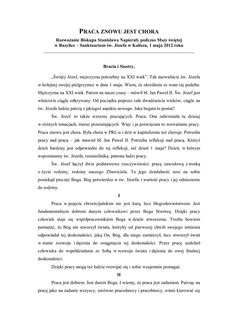 PRACA ZNOWU JEST CHORA Rozważanie Biskupa Stanisława Napierały podczas Mszy świętej w Bazylice – Sanktuarium św. Józefa w Kaliszu, 1 maja 2012 roku __________________________________________________________________ Bracia i Siostry, „Święty Józef, mężczyzna potrzebny na XXI wiek”. Tak nazwaliście św. Józefa w kolejnej swojej pielgrzymce w dniu 1 maja. Wiem, że określenie to wam się podoba: Mężczyzna na XXI wiek. Patron na nasze czasy – mówił bł. Jan Paweł II. Św. Józef jest właściwie ciągle odkrywany. Od początku poprzez całe dwadzieścia wieków, ciągle na św. Józefa ludzie patrzą z jakiegoś aspektu nowego. Jaka bogata to postać! Św. Józef to także wzorzec pracujących. Praca. Ona zabrzmiała tu dzisiaj w różnych tonacjach, nieraz przerażających. Więc i ja poświęcam to rozważanie pracy. Praca znowu jest chora. Była chora w PRL-u i dziś w kapitalizmie też choruje. Potrzeba pracy nad pracą – jak mawiał bł. Jan Paweł II. Potrzeba refleksji nad pracą. Któryż dzień bardziej jest odpowiedni do tej refleksji, niż dzień 1 maja? Dzień, w którym wspominamy św. Józefa, rzemieślnika, patrona ludzi pracy. Św. Józef łączył dwie podstawowe rzeczywistości: pracę zawodową z troską o życie rodziny, rodziny naszego Zbawiciela. Ta jego działalność nosi na sobie poniekąd pieczęć Boga. Bóg potwierdza w św. Józefie i wartość pracy i jej odniesienie do rodziny. I Praca w pojęciu chrześcijańskim nie jest karą, lecz błogosławieństwem. Jest fundamentalnym dobrem danym człowiekowi przez Boga Stwórcę. Dzięki pracy człowiek staje się współpracownikiem Boga w dziele stworzenia. Trzeba bowiem pamiętać, że Bóg nie stworzył świata, któryby od pierwszej chwili swojego istnienia odpowiadał tej doskonałości, jaką On, Bóg, dla niego zamierzył, lecz stworzył świat w stanie rozwoju i dążenia do osiągnięcia tej doskonałości. Przez pracę uzdolnił człowieka do współdziałania ze Sobą w rozwoju świata i dążenia do owej finalnej doskonałości. Dzięki pracy mogą też ludzie rozwijać się i sobie wzajemnie pomagać. II Praca jest dobrem. Jest darem Boga. I wiemy, że praca jest zadaniem. Patrząc na pracę jako na zadanie wszyscy, zarówno pracodawcy i pracobiorcy, winni kierować się zasadami moralnymi. Pierwsza z tych zasad mówi, że praca nie jest celem, lecz środkiem i narzędziem do celu. Praca jest „dla człowieka”, a nie człowiek „dla pracy” (Jan Paweł II). Celem pracy jest rozwój człowieka i budowanie wspólnoty ludzkiej, poczynając od tej pierwszej i podstawowej wspólnoty, jaką jest rodzina. Ostatecznie celem pracy jest chwała Boża. Wymienioną zasadę łamano w okresie PRL-u, kiedy pracę wynoszono do rangi bożyszcza. Wielu z nas do dzisiaj pamięta tak zwane czyny społeczne, rekordy pracy, przodowników pracy. Wszystko to było sztuczne, celebrowane, mocno związane z dniem 1 maja. W kapitalizmie też jest łamana zasada, że praca jest narzędziem i środkiem do celu, a nie celem. Obecnie w Polsce, i nie tylko w Polsce, pracą się manipuluje, w rezultacie czego praca przestaje być środkiem, a staje się celem. Praca przesłania wszystko, nawet Ojczyznę. Liczy się tylko praca. Dziś wielu Polaków, zwłaszcza młodych, wyjeżdża w poszukiwaniu pracy za granicę. Dla nich Polska, Ojczyzna, gubi znaczenie. Ojczyzną dla nich, jeśli jeszcze to pojęcie zachowują, jest miejsce, gdzie znajdują pracę. III We współczesnym polskim kapitalizmie łamana jest także zasada sprawiedliwości. W sferze wynagrodzenia za pracę pojawiły się „kominy płacowe”. Są w Polsce ludzie, którzy – wierzyć się nie chce – zarabiają miesięcznie kilkaset tysięcy złotych, i są tacy, którzy miesięcznie zarabiają kilkaset złotych. Jedni i drudzy są Polakami. Jedni i drudzy są ludźmi. Jedni i drudzy mają rodziny. Czym usprawiedliwić tak ogromne różnice w płacach? Nie widać przecież znowu takich geniuszy, od których talentu i aktywności zależałby wysoki poziom dobrobytu naszego społeczeństwa! Poziom usprawiedliwiający przyznawane im honoraria, sięgające niemal Nagrody Nobla. IV Innym zjawiskiem, znanym i tolerowanym w Polsce, będącym wynikiem łamania molarności, jest krzywda wyrządzana szarym obywatelom przy wypłacaniu należnego im wynagrodzenia za pracę. Czyż nie jest krzywdą odprowadzanie składki ubezpieczeniowej od najniższego wynagrodzenia i przekazywanie reszty w osobnej kopercie? Co mają robić ci pracownicy? Odezwać się, protestować? Z lęku przed jeszcze gorszym, to jest utratą pracy w ogóle, wolą milczeć. A jaką będą otrzymywać 2 w przyszłości po długich latach pracy emeryturę? Czy to nie będzie emerytura głodowa? V Trzeba zdecydowanie powiedzieć, że w Polsce jest za mało pracy, stanowczo proporcjonalnie mniej, niż w innych krajach Unii Europejskiej. Poziom bezrobocia – ile w Polsce wynosi? 10, 11 %? Chyba trzeba powiedzieć 20%. Tak 20%, bo ta reszta wyjechała za pracą za granicę. Nie mogli jej znaleźć w Kraju. W Polsce jest za mało pracy. Nie starcza jej dla tych, którzy chcieliby pracować. Nie starcza jej głównie dla młodych. Tymczasem mają wszyscy przymusowo pracować dłużej. No dobrze, ale kto im da pracę, zwłaszcza gdy będą zbliżać się do pięćdziesiątki? Kto im da pracę? Im więcej lat w życiu, tym trudniej o pracę. Przymus pracy, rozciągnięty ustawowo na wszystkich obywateli do 67 roku życia, jest w obecnych realiach nie wykonalny. VI Dziś, po niewielu latach, jakie upłynęły od procesu tak zwanej prywatyzacji, widzimy, że zwiększanie liczby miejsc pracy w Polsce zależy przede wszystkim od podmiotów obcych. To one stały się wskutek tak zwanej prywatyzacji właścicielami głównych gałęzi i sektorów gospodarki. Mają pakiet większościowy. Decydują co, ile i na jakich warunkach będzie w Polsce produkowane. Od wielkości i różnorodności prod