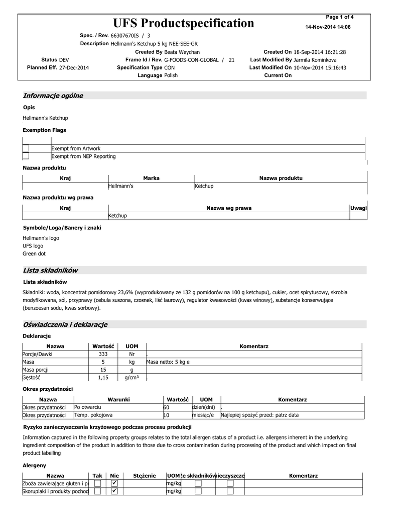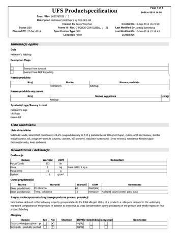 Page 1 of 4 UFS Productspecification 14-Nov-2014 14:06 Spec. / Rev. 66307670IS / 3 Description Hellmann's Ketchup 5 kg NEE-SEE-GR Created By Frame Id / Rev. Specification Type Language Status DEV Planned Eff. 27-Dec-2014 Beata Weychan G-FOODS-CON-GLOBAL / 21 CON Polish Created On 18-Sep-2014 16:21:28 Last Modified By Jarmila Kominkova Last Modified On 10-Nov-2014 15:16:43 Current On Informacje ogólne Opis Hellmann's Ketchup Exemption Flags Exempt from Artwork Exempt from NEP Reporting Nazwa produktu Kraj Marka Nazwa produktu Hellmann's Ketchup Nazwa produktu wg prawa Kraj Nazwa wg prawa Uwagi Ketchup Symbole/Loga/Banery i znaki Hellmann's logo UFS logo Green dot Lista składników Lista składników Składniki: woda, koncentrat pomidorowy 23,6% (wyprodukowany ze 132 g pomidorów na 100 g ketchupu), cukier, ocet spirytusowy, skrobia modyfikowana, sól, przyprawy (cebula suszona, czosnek, liść laurowy), regulator kwasowości (kwas winowy), substancje konserwujące (benzoesan sodu, kwas sorbowy). Oświadczenia i deklaracje Deklaracje Nazwa Porcje/Dawki Masa Masa porcji Gęstość Wartość 333 5 15 1,15 UOM Nr kg g g/cm³ Komentarz . Masa netto: 5 kg e . Okres przydatności Nazwa Okres przydatności Okres przydatności Warunki Po otwarciu Temp. pokojowa Wartość UOM dzień(dni) 60 miesiąc/e 10 Komentarz . Najlepiej spożyć przed: patrz data Ryzyko zanieczyszczenia krzyżowego podczas procesu produkcji Information captured in the following property groups relates to the total allergen status of a product i.e. allergens inherent in the underlying ingredient composition of the product in addition to those due to cross contamination during processing of the product and which impact on final product labelling Alergeny Nazwa Tak Nie Stężenie Zboża zawierające gluten i produkty pochodne Skorupiaki i produkty pochodne UOMZe składników Zanieczyszczenie mg/kg mg/kg Komentarz UFS Productspecification Page 2 of 4 14-Nov-2014 14:06 Spec. / Rev. 66307670IS / 3 Description Hellmann's Ketchup 5 kg NEE-SEE-GR Created By Frame Id / Rev. Specification Type Language Status DEV Planned Eff. 27-Dec-2014 Beata Weychan G-FOODS-CON-GLOBAL / 21 CON Polish Created On 18-Sep-2014 16:21:28 Last Modified By Jarmila Kominkova Last Modified On 10-Nov-2014 15:16:43 Current On Alergeny [Continued] Nazwa Tak Nie Stężenie Mięczaki i produkty pochodne Jaja i ich pochodne Ryby/Produkty rybne Orzeszki ziemne/Produkty z orzeszków ziemnych Soja/Produkty sojowe Mleko/Produkty mleczne Orzechy/Produkty z orzechów Nasiona sezamu/Produkty z nasion sezamu Siarczyny (=> 10mg/kg) Seler Groch Musztarda/Produkty z gorczycy Łubin i produkty pochodne 1,6 UOMZe składników Zanieczyszczenie Komentarz mg/kg mg/kg mg/kg mg/kg mg/kg mg/kg mg/kg mg/kg mg/kg waxy corn starch; mg/kg mg/kg mg/kg mg/kg Diety - zagwarantowane Nazwa Wegańska Lakto-ovo-wegetariańska Tak Nie Komentarz Tak Nie Komentarz Produkt wolny od: Nazwa Napromienianie Alkohol 0,03% Deklaracje . Oświadczenia Nazwa Oświadczenie Oświadczenie Oświadczenie Oświadczenie Oświadczenie Oświadczenie Oświadczenie Oświadczenie Oświadczenie Oświadczenie Oświadczenie Oświadczenie Oświadczenie Oświadczenie Oświadczenie Opis 1. 2. 3. 4. 5. 6. 7. 8. 9. 10. 11. 12. 13. 14. 15. Oświadczenie 1 (note) . Oświadczenie 2 (note) . Uwagi UFS Productspecification Page 3 of 4 14-Nov-2014 14:06 Spec. / Rev. 66307670IS / 3 Description Hellmann's Ketchup 5 kg NEE-SEE-GR Created By Frame Id / Rev. Specification Type Language Status DEV Planned Eff. 27-Dec-2014 Beata Weychan G-FOODS-CON-GLOBAL / 21 CON Polish Created On 18-Sep-2014 16:21:28 Last Modified By Jarmila Kominkova Last Modified On 10-Nov-2014 15:16:43 Current On Dodatkowe oświadczenia Nazwa Oświadczenie 1 without flavour enhancers Oświadczenie 2 without artificial flavours Opis Uwagi Oświadczenia / Orzeczenia (FoP- serving suggestion next to the picture) Ilustracja allergens Allergens cross-contamination in the factory not validated yet. Instrukcje Sposób przygotowania . Warunki przechowywania Przechowywać w suchym, chłodnym i zaciemnionym miejscu. Po otwarciu przechowywać w lodówce i spożyć dw ciągu 2 miesięcy. Instrukcje bezpieczeństwa . Utylizacja . Informacja żywieniowa Informacje żywieniowe Wartość odżywcza 100 g Energia Tłuszcz w tym kw. tłuszczowe nasycone Węglowodany w tym cukry Białko Sól Informacje żywieniowe na opakowanie [Produkt wprowadzany do obrotu] Inf. żywieniowe na produkt wprowadzany do obrotu Nazwa Wielkość porcji 15 G Wartość Wartości Energia Energia Białko Węglowodany Węglowodany w tym Tłuszcz kJ kcal Cukry - Cecha na 100 UOM g produktu wprowadzanegona do100 obrotu ml produktu kJ 460 kcal 110 g 0,9 g 25 g 22 g 0,1 na porcję 70 15 0,1 4,0 3,5 0 Page 4 of 4 UFS Productspecification 14-Nov-2014 14:06 Spec. / Rev. 66307670IS / 3 Description Hellmann's Ketchup 5 kg NEE-SEE-GR Status DEV Planned Eff. 27-Dec-2014 Wartości Created By Frame Id / Rev. Specification Type Language Tłuszcz w tym Sól Cecha Kwasy nasycone as NaCl Składniki odżywcze Energia Energia Białko Węglowodany Węglowodany w tym Tłuszcz Tłuszcz w tym Sól Cecha kJ kcal Cukry Kwasy nasycone as NaCl Beata Weychan G-FOODS-CON-GLOBAL / 21 CON Polish na 100 UOM g produktu wprowadzanegona do100 obrotu ml produktu g 0 g 1,8 Wskazane dzienne spożycie 8400 2000 50 260 90 70 20 6 * % referencyjnej wartości spożycia dla przeciętnej osoby dorosłej (8400 kJ/2000 kcal) Informacje żywieniowe na opakowanie [Na przygotowany produkt] Reference Intake * % referencyjnej wartości spożycia dla przeciętnej osoby dorosłej (8400 kJ/2000 kcal) Dane kontaktowe Kontakt www.ufs.com Unilever Food Solutions Unilever Polska Sp. z o.o. Al. Jerozolimskie 134 02-305 Warszawa (phone symbol) 800 66 11 11 (pon.-pt. 8:00-16:00) EAN CU: 5900300548569 na porcję 0 0,27 % <1 <1 <1 2 4 <1 <1 5 Reference Intake Informacje lokalne Created On 18-Sep-2014 16:21:28 Last Modified By Jarmila Kominkova Last Modified On 10-Nov-2014 15