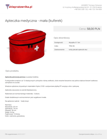 AGIMED Tomasz Dziwosz Ul. Kuźnicy Kołłątajowskiej 6A/41, 31-234 Kraków +48 530 328 132; +48 123 764 830 Apteczka medyczna - mała (kuferek) Cena: 58,00 PLN Opis słownikowy Dostępność Wysyłka 3-7 dni Index TRM-46 Zastosowanie torby plecaki apteczki etui Opis produktu Apteczka pierwszej pomocy w postaci kuferka. Funkcjonalne wnętrze: aż 12 elastycznych uchwytów różnej wielkości, dwie otwarte kieszenie oraz jedna większa kieszeń siatkowa zamykana na suwak. Wnętrze wyłożone zmywalnym materiałem Nylon 210D i usztywniane płytką PP wszytą w dno i pokrywę. Apteczka zasuwana na zamek błyskawiczny. Wykonana ze wzmacnianego materiału - Codura. Dzięki dodatkowym wzmocnieniom jest wyjątkowo trwała. Na apteczce nadruk – biały krzyż. Wymiary: Wysokość: 20 cm Szerokość: 16 cm Długość: 30 cm Waga: 0,4 kg Pojemność: 10 litrów Kolor: czerwony, granatowy Plik wygenerowano: 08-03-2017 Oprogramowanie sklepu: AptusShop AGIMED Tomasz Dziwosz Ul. Kuźnicy Kołłątajowskiej 6A/41, 31-234 Kraków +48 530 328 132; +48 123 764 830 Parametry Kolor czerwony, granatowy Galeria Plik wygenerowano: 08-03-2017 Powered by TCPDF (www.tcpdf.org) Oprogramowanie sklepu: AptusShop