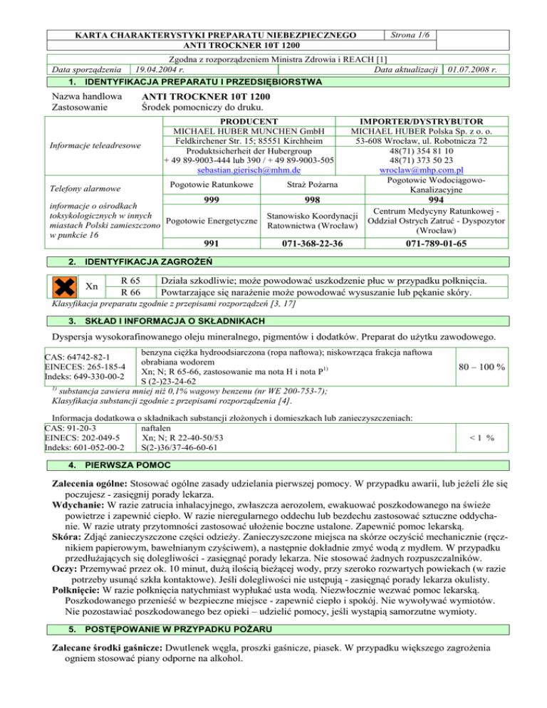 KARTA CHARAKTERYSTYKI PREPARATU NIEBEZPIECZNEGO ANTI TROCKNER 10T 1200 Strona 1/6 Zgodna z rozporządzeniem Ministra Zdrowia i REACH [1] Data sporządzenia 19.04.2004 r. Data aktualizacji 1. IDENTYFIKACJA PREPARATU I PRZEDSIĘBIORSTWA Nazwa handlowa Zastosowanie Informacje teleadresowe Telefony alarmowe 01.07.2008 r. ANTI TROCKNER 10T 1200 Środek pomocniczy do druku. PRODUCENT MICHAEL HUBER MUNCHEN GmbH Feldkirchener Str. 15; 85551 Kirchheim Produktsicherheit der Hubergroup + 49 89-9003-444 lub 390 / + 49 89-9003-505 [email protected] IMPORTER/DYSTRYBUTOR MICHAEL HUBER Polska Sp. z o. o. 53-608 Wrocław, ul. Robotnicza 72 48(71) 354 81 10 48(71) 373 50 23 [email protected] Pogotowie WodociągowoKanalizacyjne Pogotowie Ratunkowe StraŜ PoŜarna 999 998 994 Stanowisko Koordynacji Ratownictwa (Wrocław) Centrum Medycyny Ratunkowej Oddział Ostrych Zatruć - Dyspozytor (Wrocław) 071-368-22-36 071-789-01-65 informacje o ośrodkach toksykologicznych w innych Pogotowie Energetyczne miastach Polski zamieszczono w punkcie 16 991 2. IDENTYFIKACJA ZAGROśEŃ Xn R 65 R 66 Działa szkodliwie; moŜe powodować uszkodzenie płuc w przypadku połknięcia. Powtarzające się naraŜenie moŜe powodować wysuszanie lub pękanie skóry. Klasyfikacja preparatu zgodnie z przepisami rozporządzeń [3, 17] 3. SKŁAD I INFORMACJA O SKŁADNIKACH Dyspersja wysokorafinowanego oleju mineralnego, pigmentów i dodatków. Preparat do uŜytku zawodowego. benzyna cięŜka hydroodsiarczona (ropa naftowa); niskowrząca frakcja naftowa obrabiana wodorem Xn; N; R 65-66, zastosowanie ma nota H i nota P1) S (2-)23-24-62 1) substancja zawiera mniej niŜ 0,1% wagowy benzenu (nr WE 200-753-7); Klasyfikacja substancji zgodnie z przepisami rozporządzenia [4]. CAS: 64742-82-1 EINECES: 265-185-4 Indeks: 649-330-00-2 Informacja dodatkowa o składnikach substancji złoŜonych i domieszkach lub zanieczyszczeniach: CAS: 91-20-3 naftalen EINECS: 202-049-5 Xn; N; R 22-40-50/53 Indeks: 601-052-00-2 S(2-)36/37-46-60-61 80 – 100 % <1 % 4. PIERWSZA POMOC Zalecenia ogólne: Stosować ogólne zasady udzielania pierwszej pomocy. W przypadku awarii, lub jeŜeli źle się poczujesz - zasięgnij porady lekarza. Wdychanie: W razie zatrucia inhalacyjnego, zwłaszcza aerozolem, ewakuować poszkodowanego na świeŜe powietrze i zapewnić ciepło. W razie nieregularnego oddechu lub bezdechu zastosować sztuczne oddychanie. W razie utraty przytomności zastosować ułoŜenie boczne ustalone. Zapewnić pomoc lekarską. Skóra: Zdjąć zanieczyszczone części odzieŜy. Zanieczyszczone miejsca na skórze oczyścić mechanicznie (ręcznikiem papierowym, bawełnianym czyściwem), a następnie dokładnie zmyć wodą z mydłem. W przypadku przedłuŜających się dolegliwości - zasięgnąć porady lekarza. Nie stosować Ŝadnych rozpuszczalników. Oczy: Przemywać przez ok. 10 minut, duŜą ilością bieŜącej wody, przy szeroko rozwartych powiekach (w razie potrzeby usunąć szkła kontaktowe). Jeśli dolegliwości nie ustępują - zasięgnąć porady lekarza okulisty. Połknięcie: W razie połknięcia natychmiast wypłukać usta wodą. Niezwłocznie wezwać pomoc lekarską. Poszkodowanego przenieść w bezpieczne miejsce - zapewnić ciepło i spokój. Nie wywoływać wymiotów. Nie pozostawiać poszkodowanego bez opieki – udzielić pomocy, jeśli wystąpią samorzutne wymioty. 5. POSTĘPOWANIE W PRZYPADKU POśARU Zalecane środki gaśnicze: Dwutlenek węgla, proszki gaśnicze, piasek. W przypadku większego zagroŜenia ogniem stosować piany odporne na alkohol. KARTA CHARAKTERYSTYKI PREPARATU NIEBEZPIECZNEGO ANTI TROCKNER 10T 1200 Strona 2/6 Nieodpowiednie środki gaśnicze: Woda. Szczególne zagroŜenia ze strony produktów spalania i wydzielających się gazów: W wysokiej temperaturze opary tworzą mieszaniny wybuchowe z powietrzem. Podczas poŜaru powstają produkty pirolizy i niepełnego spalania. Wdychanie produktów rozkładu moŜe powodować powaŜne skutki zdrowotne. Specjalne wyposaŜenie ochronne straŜaków: Pełne wyposaŜenie bojowe z aparatami oddechowymi. Inne informacje: Sąsiednie pojemniki chłodzić wodą. 6. POSTĘPOWANIE W PRZYPADKU NIEZAMIERZONEGO UWOLNIENIA DO ŚRODOWISKA Indywidualne środki ostroŜności: Szczegółowe informacje zamieszczone są w punkcie 7 i 8. UniemoŜliwić dostęp osób postronnych. Zapewnić przewietrzanie pomieszczeń. Unikać zanieczyszczenia oczu i skóry. Środki ostroŜności w zakresie ochrony środowiska: Nie dopuszczać do zanieczyszczania wód powierzchniowych (gruntowych) oraz gruntu. Zapobiegać przedostaniu się zanieczyszczeń do kanalizacji. W przypadku przedostania się do rzek, przewodów kanalizacyjnych lub wodociągowych, powiadomić odpowiednie władze (Inspekcja Ochrony Środowiska, Państwowa StraŜ PoŜarna, Przedsiębiorstwo Wodno - Kanalizacyjne). Metody oczyszczania/usuwania: W przypadku wycieku absorbować ciecz niepalnym materiałem chłonnym np. piaskiem, wermikulitem, ziemią okrzemkową. Zebrać sorbent (i grunt) - umieścić w zamykanym i oznakowanym pojemniku, w celu dalszego bezpiecznego usunięcia. Postępowanie z odpadami - pkt 13. Resztki z powierzchni utwardzonej zebrać dokładnie czyściwem, a pozostałości zmyć wodą z detergentem. Nie spłukiwać cieczy wodą. 7. POSTĘPOWANIE Z PREPARATEM I JEGO MAGAZYNOWANIE Postępowanie z preparatem: Przestrzegać ogólnych zasad bezpieczeństwa i higieny pracy [5]. Podczas pracy nie jeść i nie pić. Opary tworzą z powietrzem mieszaniny wybuchowe w temperaturze powyŜej 65 oC. Pojemnik bezciśnieniowy – nie wytłaczać pod zwiększonym ciśnieniem. Unikać kontaktu z oczami i ze skórą. UŜywać środków ochrony osobistej wymienionych w punkcie 8. Magazynowanie: Zabezpieczyć przed dostępem osób nieuprawnionych. Magazynować w suchym i chłodnym miejscu. Magazynować na utwardzonej powierzchni. Pojemniki przechowywać szczelnie zamknięte. Po uŜyciu pojemniki dokładnie zamknąć. Przechowywać w oryginalnych po