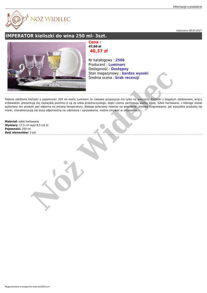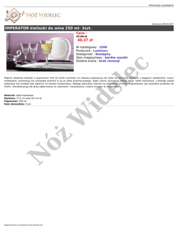 Informacje o produkcie Utworzono 08-03-2017 IMPERATOR kieliszki do wina 250 ml- 3szt. Cena : 47,50 zł 40,37 zł le c Nr katalogowy : 2506 Producent : Luminarc Dostępność : Dostępny Stan magazynowy : bardzo wysoki Średnia ocena : brak recenzji id e Pięknie zdobione kieliszki o pojemności 250 ml marki Luminarc to ciekawa propozycja nie tylko na wieczory. Kieliszki z bogatym zdobieniem, wręcz królewskim, prezentują się niezwykle pomimo iż są ze szkła przeźroczystego, dzęki czemu zachowują wielką klasę. Szkło hartowane, z którego został wykonany ten produkt jest odporne na zmianę temperatury, dlatego polecamy również na wieczorne, zimowe rozgrzewanie. Jak wszystkie produkty tej marki, charakteryzują się dużą odpornością na uderzenia i zarysowania, można zmywać w zmywarkach. N óż W Materiał: szkło hartowane Wymiary: 17,5 cm wys/ 8,5 cm śr. Pojemność: 250 ml Ilość elementów: 3 szt. Wygenerowano w programie www.oscGold.com