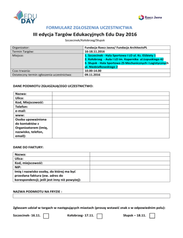 FORMULARZ ZGŁOSZENIA UCZESTNICTWA III edycja Targów Edukacyjnych Edu Day 2016 Szczecinek/Kołobrzeg/Słupsk Organizator: Termin Targów: Miejsce: Czas trwania: Ostateczny termin zgłoszenia uczestnictwa: Fundacja Rzecz Jasna/ Fundacja ArchitectsPL 16-18.11.2016 1. Szczecinek - Hala Sportowa I LO ul. Ks. Elżbiety 1 2. Kołobrzeg - Aula I LO im. Kopernika ul.Łopuskiego 42 3. Słupsk - Hala Sportowa ZS Mechanicznych i Logistycznych ul. Niedziałkowskiego 2 10.00-14.00 09.11.2016 DANE PODMIOTU ZGŁASZAJĄCEGO UCZESTNICTWO: Nazwa: Ulica: Kod, Miejscowość: Telefon: e-mail: www: Osoba upoważniona do kontaktów z Organizatorem (imię, nazwisko, telefon, email): DANE DO FAKTURY: Nazwa: Ulica: Kod, miejscowość: NIP: Imię i nazwisko osoby, do której ma być przesłana faktura (ew. adres do korespondencji; jeśli jest inny niż powyżej): NAZWA PODMIOTU NA FRYZIE : Zgłaszam udział w targach w następujących miastach (proszę wstawić znak x w odpowiednim polu): Szczecinek- 16.11. Kołobrzeg- 17.11. Słupsk – 18.11. DODATKOWE UWAGI: OPIS DOSTĘPNYCH STANDARDÓW UCZESTNICTWA: Stoisko zabudowane box – 6m2 *(3m x 2m) – w skład wchodzi: 6m² – bazowa powierzchnia wystawowa Stolik + 3 krzesła Źródło prądu Napis na fryzie Catering (kawa, herbata, kanapki, ciastka, woda) Cena 800 zł brutto – 1 miasto, 1400 zł brutto – 2 miasta, 1900 zł brutto – 3 miasta Stoisko niezabudowane 6 m2 – w skład wchodzi: 6m² – powierzchnia niezabudowana Stolik +3 krzesła Źródło prądu Catering (kawa, herbata, kanapki, ciastka, woda) Cena 550 zł brutto - 1 miasto, 1000 zł brutto– 2 miasta, 1350 zł brutto - 3 miasta Wybierając jeden ze standardów możecie Państwo dokupić dodatkową opcję: Więcej info o opcjach dodatkowych http://eduday.pl/kategoria-produktu/uslugi-dodatkowe/ Łączna wartość wybranego standardu Łączna wartość wybranych opcji dodatkowych brutto brutto Wpisz wybrane opcje dodatkowe [_____________________________________________________________] Łączna wartość zamówienia brutto W imieniu Wystawcy oświadczam, że zapoznałem/am się z treścią Regulaminu targów i w pełni akceptuję zamieszczone w nim warunki, tym samym zobowiązuję się do ich przestrzegania. ……………………………………… Data ……………………………………… Pieczęć i podpis osoby upoważnionej do reprezentowania Instytucji Regulamin TARGÓW I. Postanowienia ogólne Przepisy niniejszego regulaminu dotyczą Wystawców Targów EDU DAY 2016. II. Dane podstawowe 1. Organizatorem oraz Realizatorem Targów EDU DAY 2016 jest Fundacja Rzecz Jasna. 2. Targi EDU DAY 2016 odbędą się w dniach 16-18 listopada 2016 r. na terenie: – I Liceum Ogólnokształcącego nr I im. Księżnej Elżbiety w Szczecinku (ul. Księżnej Elżbiety 1, Szczecinek) – 16 listopada; – I Liceum Ogólnokształcącego nr I im. Mikołaja Kopernika w Kołobrzegu (ul. Łopuskiego 42-44, Kołobrzeg) – 17 listopada; – Zespół Szkół Mechanicznych i Logistycznych im. inż. Tadeusza Tańskiego (ul. Niedziałkowskiego 2, Słupsk) – 18 listopada; 3. Targi będą otwarte dla Zwiedzających w godzinach 10:00 – 14:00. III. Zgłoszenie uczestnictwa w Targach 1. Wystawca nabywa prawo do możliwości udziału w Targach EDU DAY 2016 w momencie zaakceptowania wysłanego formularza zgłoszeniowego przez Biuro Fundacji Rzecz Jasna (ul. Andersa 16A, 75-015 Koszalin). 2. Zgłoszenie na Targi należy dokonać poprzez stronę internetową Organizatora www.eduday.pl lub wysyłając wypełniony i podpisany skan formularz zgłoszeniowego. 3. Termin zgłoszenia udziału upływa 09 listopada 2016 r. IV. Warunki płatności 1. Wystawca dokonuje wpłaty na konto Fundacji Rzecz Jasna w terminie 7 dni od daty otrzymania faktury. 2. Organizator wystawia Rachunek zgodnie z obowiązującymi przepisami na podstawie formularzy zgłoszeniowych. 3. W przypadku niedokonania wpłaty w terminie Organizator ma prawo odstąpić od realizacji zamówienia. 4. W przypadku rezygnacji z udziału w Targach EDU DAY 2016 po 01 listopada 2016 r. Wystawca jest zobowiązany do zapłacenia 100% wartości brutto zamówienia zadeklarowanego w formularzu zgłoszeniowym. 5. Wymagane jest pisemne oświadczenie o rezygnacji z udziału w Targach. V. Stoiska 1. Organizator przekazuje Wystawcy na czas trwania Targów powierzchnię oraz określa lokalizację stoiska. 2. Organizator zastrzega sobie prawo zmiany lokalizacji stoiska oraz powierzchni zamówionej przez Wystawcę, jeśli względy organizacyjne lub projektowo-techniczne uniemożliwiają realizację zlecenia Wystawcy 3. Powierzchnia stoiska jest przeznaczona tylko dla Wystawcy. 4. Udostępnienie powierzchni przez Wystawcę innym podmiotom może nastąpić tylko za zgodą Organizatora. 5. Powierzchnia zabudowana targowa to powierzchnia zabudowana przez Organizatora w wersji uzgodnionej z Wystawcą. 6. Standardowa powierzchnia targowa to 6m². Po uzgodnieniu z Organizatorem istnieje możliwość wynajmu mniejszej lub większej powierzchni targowej oraz dodatkowego wyposażenia. 7. Opłata za powierzchnię ze standardową zabudową obejmuje: wynajem powierzchni wystawienniczej, montaż i demontaż stoiska, ściany zewnętrzne w kolorze białym, napis z nazwą Wystawcy na fryzie, gniazdo elektryczne, sprzątanie stoiska i ciągów komunikacyjnych, stolik i krzesła w ilości odpowiadającej standardowi stoiska. 8. Powierzchnia niezabudowana to powierzchnia, która Wystawca organizuje we własnym zakresie (standardowa powierzchnia to 6 m²). 9. Zabudowa własna Wystawcy musi zostać zaakceptowana przez Organizatora. 10. Zabudowę własną należy ustawić najpóźniej do godz. 9.00 w dniu targów i zdemontować najpóźniej 2 godziny po zakończeniu targów. 11. Wszelkie naprawy lub zmiany w formie stoiska, usuwanie i dodawanie materiałów muszą być przeprowadzane poza godzinami zwiedzania Targów i w uzgodnieniu z Organizatorem. 12. Eksponaty nie mogą być umieszczane w obr