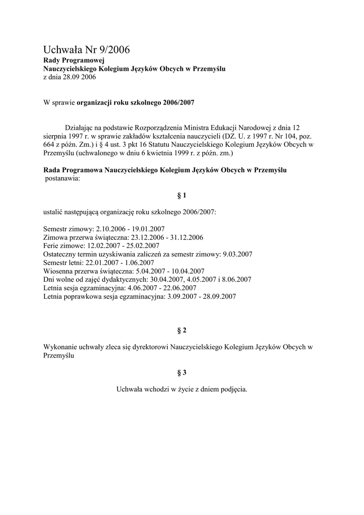 Uchwała Nr 9/2006 Rady Programowej Nauczycielskiego Kolegium Języków Obcych w Przemyślu z dnia 28.09 2006 W sprawie organizacji roku szkolnego 2006/2007 Działając na podstawie Rozporządzenia Ministra Edukacji Narodowej z dnia 12 sierpnia 1997 r. w sprawie zakładów kształcenia nauczycieli (DZ. U. z 1997 r. Nr 104, poz. 664 z późn. Zm.) i § 4 ust. 3 pkt 16 Statutu Nauczycielskiego Kolegium Języków Obcych w Przemyślu (uchwalonego w dniu 6 kwietnia 1999 r. z późn. zm.) Rada Programowa Nauczycielskiego Kolegium Języków Obcych w Przemyślu postanawia: §1 ustalić następującą organizację roku szkolnego 2006/2007: Semestr zimowy: 2.10.2006 - 19.01.2007 Zimowa przerwa świąteczna: 23.12.2006 - 31.12.2006 Ferie zimowe: 12.02.2007 - 25.02.2007 Ostateczny termin uzyskiwania zaliczeń za semestr zimowy: 9.03.2007 Semestr letni: 22.01.2007 - 1.06.2007 Wiosenna przerwa świąteczna: 5.04.2007 - 10.04.2007 Dni wolne od zajęć dydaktycznych: 30.04.2007, 4.05.2007 i 8.06.2007 Letnia sesja egzaminacyjna: 4.06.2007 - 22.06.2007 Letnia poprawkowa sesja egzaminacyjna: 3.09.2007 - 28.09.2007 §2 Wykonanie uchwały zleca się dyrektorowi Nauczycielskiego Kolegium Języków Obcych w Przemyślu §3 Uchwała wchodzi w życie z dniem podjęcia.