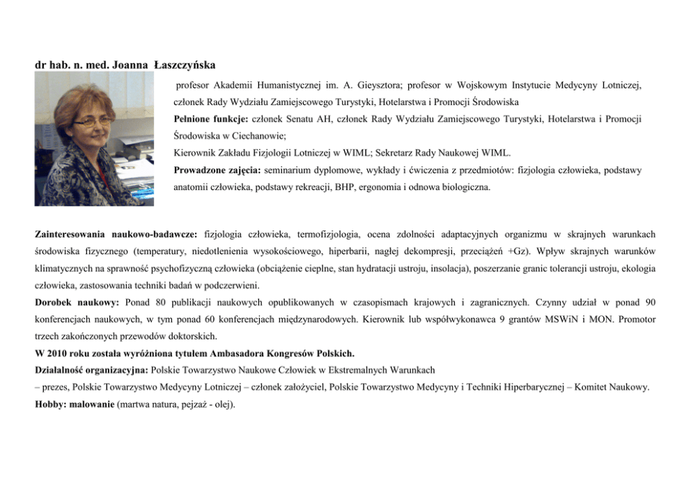 dr hab. n. med. Joanna Łaszczyńska profesor Akademii Humanistycznej im. A. Gieysztora; profesor w Wojskowym Instytucie Medycyny Lotniczej, członek Rady Wydziału Zamiejscowego Turystyki, Hotelarstwa i Promocji Środowiska Pełnione funkcje: członek Senatu AH, członek Rady Wydziału Zamiejscowego Turystyki, Hotelarstwa i Promocji Środowiska w Ciechanowie; Kierownik Zakładu Fizjologii Lotniczej w WIML; Sekretarz Rady Naukowej WIML. Prowadzone zajęcia: seminarium dyplomowe, wykłady i ćwiczenia z przedmiotów: fizjologia człowieka, podstawy anatomii człowieka, podstawy rekreacji, BHP, ergonomia i odnowa biologiczna. Zainteresowania naukowo-badawcze: fizjologia człowieka, termofizjologia, ocena zdolności adaptacyjnych organizmu w skrajnych warunkach środowiska fizycznego (temperatury, niedotlenienia wysokościowego, hiperbarii, nagłej dekompresji, przeciąŜeń +Gz). Wpływ skrajnych warunków klimatycznych na sprawność psychofizyczną człowieka (obciąŜenie cieplne, stan hydratacji ustroju, insolacja), poszerzanie granic tolerancji ustroju, ekologia człowieka, zastosowania techniki badań w podczerwieni. Dorobek naukowy: Ponad 80 publikacji naukowych opublikowanych w czasopismach krajowych i zagranicznych. Czynny udział w ponad 90 konferencjach naukowych, w tym ponad 60 konferencjach międzynarodowych. Kierownik lub współwykonawca 9 grantów MSWiN i MON. Promotor trzech zakończonych przewodów doktorskich. W 2010 roku została wyróŜniona tytułem Ambasadora Kongresów Polskich. Działalność organizacyjna: Polskie Towarzystwo Naukowe Człowiek w Ekstremalnych Warunkach – prezes, Polskie Towarzystwo Medycyny Lotniczej – członek załoŜyciel, Polskie Towarzystwo Medycyny i Techniki Hiperbarycznej – Komitet Naukowy. Hobby: malowanie (martwa natura, pejzaŜ - olej).