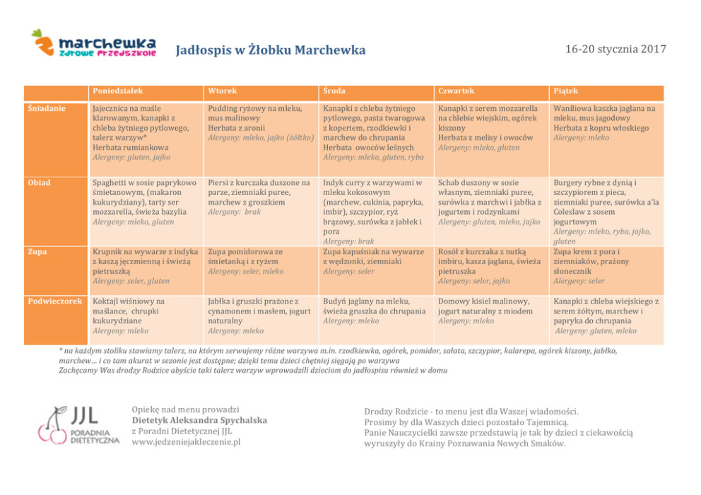 16-20stycznia2017 JadłospiswŻłobkuMarchewka Poniedziałek Wtorek Środa Czwartek Piątek Śniadanie Jajecznicanamaśle klarowanym,kanapkiz chlebażytniegopytlowego, talerzwarzyw* Herbatarumiankowa Alergeny:gluten,jajko Puddingryżowynamleku, musmalinowy Herbatazaronii Alergeny:mleko,jajko(żółtko) Kanapkizchlebażytniego pytlowego,pastatwarogowa zkoperiem,rzodkiewkii marchewdochrupania Herbataowocówleśnych Alergeny:mleko,gluten,ryba Kanapkizseremmozzarella nachlebiewiejskim,ogórek kiszony Herbatazmelisyiowoców Alergeny:mleko,gluten Waniliowakaszkajaglanana mleku,musjagodowy Herbatazkopruwłoskiego Alergeny:mleko Obiad Spaghettiwsosiepaprykowo śmietanowym,(makaron kukurydziany),tartyser mozzarella,świeżabazylia Alergeny:mleko,gluten Piersizkurczakaduszonena parze,ziemniakipuree, marchewzgroszkiem Alergeny:brak Indykcurryzwarzywamiw mlekukokosowym (marchew,cukinia,papryka, imbir),szczypior,ryż brązowy,surówkazjabłeki pora Alergeny:brak Zupakapuśniaknawywarze zwędzonki,ziemniaki Alergeny:seler Schabduszonywsosie własnym,ziemniakipuree, surówkazmarchwiijabłkaz jogurtemirodzynkami Alergeny:gluten,mleko,jajko Burgeryrybnezdyniąi szczypioremzpieca, ziemniakipuree,surówkaa’la Coleslawzsosem jogurtowym Alergeny:mleko,ryba,jajko, gluten Zupakremzporai ziemniaków,prażony słonecznik Alergeny:seler Kanapkizchlebawiejskiegoz seremżółtym,marchewi paprykadochrupania Alergeny:gluten,mleko Zupa Krupniknawywarzezindyka Zupapomidorowaze Rosółzkurczakaznutką zkasząjęczmiennąiświeżą śmietankąizryżem imbiru,kaszajaglana,świeża pietruszką Alergeny:seler,mleko pietruszka Alergeny:seler,gluten Alergeny:seler,jajko Podwieczorek Koktajlwiśniowyna Jabłkaigruszkiprażonez Budyńjaglanynamleku, Domowykisielmalinowy, maślance,chrupki cynamonemimasłem,jogurt świeżagruszkadochrupania jogurtnaturalnyzmiodem kukurydziane naturalny Alergeny:mleko Alergeny:mleko Alergeny:mleko Alergeny:mleko *nakażdymstolikustawiamytalerz,naktórymserwujemyróżnewarzywam.in.rzodkiewka,ogórek,pomidor,sałata,szczypior,kalarepa,ogórekkiszony,jabłko, marchew…icotamakuratwsezoniejestdostępne;dziękitemudziecichętniejsięgająpowarzywa ZachęcamyWasdrodzyRodziceabyścietakitalerzwarzywwprowadzilidzieciomdojadłospisurównieżwdomu Opiekęnadmenuprowadzi DietetykAleksandraSpychalska zPoradniDietetycznejJJL www.jedzeniejakleczenie.pl DrodzyRodzicie-tomenujestdlaWaszejwiadomości. ProsimybydlaWaszychdziecipozostałoTajemnicą. PanieNauczycielkizawszeprzedstawiąjetakbydziecizciekawością wyruszyłydoKrainyPoznawaniaNowychSmaków.