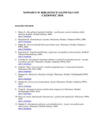 NOWOŚCI W BIBLIOTECE GŁÓWNEJ UEP CZERWIEC 2010 KSIĄŻKI POLSKIE 1. Baron A.: Zarządzanie kapitałem ludzkim : uzyskiwanie wartości dodanej dzięki ludziom. Kraków: Wolters Kluwer, 2008 opis w katalogu 2. Bergstrom B.: Komunikacja wizualna. Warszawa: Wydaw. Naukowe PWN, 2009 opis w katalogu 3. Dupre B.: 50 teorii filozofii które powinieneś znać. Warszawa: Wydaw. Naukowe PWN, 2008 opis w katalogu 4. Kasiewicz S.: Kapitał intelektualny: spojrzenie z perspektywy interesariuszy. Kraków: Oficyna Ekonomiczna, 2006 opis w katalogu 5. Lewicka D.: Zarządzanie kapitałem ludzkim w polskich przedsiębiorstwach : metody, narzędzia, mierniki. Warszawa: Wydaw. Naukowe PWN, 2010 opis w katalogu 6. Łaski K.: Mity i rzeczywistość w polityce gospodarczej i w nauczaniu ekonomii. Warszawa: INE PAN, 2009 opis w katalogu 7. Morgan M.: Skuteczne wdrażanie strategii. Warszawa: Wydaw. Profesjonalne PWN, 2010 opis w katalogu 8. Stocker H.: Nowoczesne kompendium z fizyki. Warszawa: Wydaw. Naukowe PWN, 2010 opis w katalogu 9. Tyagi R.: Strategiczna karta wyników firm usługowych. Warszawa: Wydaw. Profesjonalne PWN, 2010 opis w katalogu 10. Wrycz S. (red.): Informatyka ekonomiczna : podręcznik akademicki. Warszawa: PWE, 2010 opis w katalogu 11. Zapłata S.: Zarządzanie jakością w przedsiębiorstwie : ocena i uwarunkowania skuteczności. Warszawa: Wolters Kluwer, 2009 opis w katalogu KSIĄŻKI ZAGRANICZNE 1. Blanchard O.: Macroeconomics. 5 ed. Upper Saddle River: Prentice Hall, 2009 opis w katalogu 2. Cooley Ch.: Human nature and the social order. New York: Charles Scribner`s Sons, 2010 opis w katalogu 3. Laudon K.: Essentials of business information systems. Pearson Education, 2007 opis w katalogu 4. Lehu J-M.: Branded entertainment : product placement & brand strategy in the entertainment business. London: Kogan Page, 2009 opis w katalogu 5. Side C. (ed.): Food product development : based on experience. Ames: Iowa State Press, 2002 opis w katalogu 6. Smith V.L.: Discovery - a memoir. Bloomington: AuthorHouse, 2008 opis w katalogu 7. Smith V.L.: Papers in experimental economics. Cambridge: Cambridge University Press, 2006 opis w katalogu 8. Smith V.L.: Rationality in economics : constructivist and ecological forms. Cambridge: Cambridge University Press, 2008 opis w katalogu