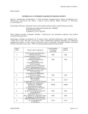 Wrocław, dnia 07.12.2010 r. RAP/119/2010 INFORMACJA O WYBORZE NAJKORZYSTNIEJSZEJ OFERTY Dotyczy: postępowania prowadzonego w trybie przetargu nieograniczonego, którego przedmiotem jest: Modernizacja pomieszczeń dla dużych i małych zwierząt Katedry Kliniki Chirurgii we Wrocławiu pl. Grunwaldzki 51. Zamawiający informuje o dokonaniu wyboru oferty najkorzystniejszej, która została złożona przez firmę: Przedsiębiorstwo Budowlano-Instalacyjne „TOMEK” Wojciechowski Tomasz ul. Igielna 9/1, 50-117 Wrocław Oferta spełnia wszystkie wymagania formalne i merytoryczne oraz przedstawia najniższą cenę spośród wszystkich złożonych ofert. Zamawiający, działając na podstawie art. 92 ustawy Prawo zamówień publicznych, (tekst jednolity Dz.U. z 2010r. Nr 113, poz. 759 i Dz.U. Nr 161 poz. 1078, z późniejszymi zmianami) informuje, że w niniejszym postępowaniu złożono 10 ofert, których streszczenie oceny i porównanie zawierające punktację przyznaną ofertom w kryterium oceny (cena – 100%) oraz łączną punktację przedstawiono poniżej: Numer oferty 1. 2. 3. 4. 5. 6. 7. 8. RAP/120/2010 Nazwa i adres wykonawcy P.U.H. Instalacyjno-Budowlane Mikołaj Zychowicz ul. Kutrowskiego 13, 55-200 Oława Konsorcjum firm: 1. MAKO Przedsiębiorstwo Budowlane ul. Komuny Paryskiej 23/9, 50-451 Wrocław, 2. Zakład Instalacji Sanitarnych Wodno -Kanalizacyjnych C.O. i Gazowych MURARSTWO MARCIN WOŹNIAK, ul. Hynka 17/1 54-129 Wrocław Przedsiębiorstwo REM-BUD K. Kowal –Gąska ul. M. Reja 12, 35-211 Rzeszów BGS SYSTEM Jerzy Garbino ul. Kamienna 31/51, 53-307 Wrocław Przedsiębiorstwo BudowlanoInstalacyjne „TOMEK” Wojciechowski Tomasz ul. Igielna 9/1,50-117 Wrocław MARAPOL Sp. z o. o. ul. Marii Curie-Skłodowskiej 43/7 50-369 Wrocław „Falter-Król” Sp. z o. o. Prace podłogowe i urządzanie wnętrz ul. Hubska 20, 50-502 Wroclaw Zakład INS-BUD Jacek Syryjczyk ul. 11 Listopada 9/10 55-200 Oława Liczba punktów w kryterium cena 100% Razem punktów 0,00 0,00 0,00 0,00 0,00 0,00 54,18 54,18 100,00 100,00 0,00 0,00 0,00 0,00 91,34 91,34 Strona 1 z 2 9. 10. OLBUD II Zakład BudowlanoRemontowy Wojciech Sanak ul. J. Kossaka 11/4, 48-303 Nysa Spółdzielnia Rzemieślnicza ul. Cukrownicza 6 57-200 Ząbkowice Śląskie 0,00 0,00 0,00 0,00 Prorektor ds. rozwoju i informatyzacji Prof. dr hab. inż. Andrzej Drabiński RAP/120/2010 Strona 2 z 2