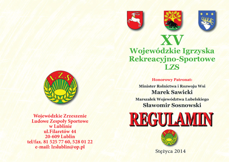 XV Wojewódzkie Igrzyska Rekreacyjno-Sportowe LZS Honorowy Patronat: Minister Rolnictwa i Rozwoju Wsi Marek Sawicki Marszałek Województwa Lubelskiego Sławomir Sosnowski Wojewódzkie Zrzeszenie Ludowe Zespoły Sportowe w Lublinie ul.Filaretów 44 20-609 Lublin tel/fax. 81 525 77 60, 528 01 22 e-mail: [email protected] REGULAMIN Stężyca 2014 XV Wojewódzkiech Igrzyska Rekreacyjno-Sportowych LZS Stężyca 2014 XIV WOJEWÓDZKICH IGRZYSK REKREACYJNO-SPORTOWYCH LZS Przewodniczący Komitetu Honorowego Krzysztof Hetman - Poseł do Parlamentu Europejskiego Arkadiusz Bratkowski Stanisław Jagiełło Hanna Czerska – Gąsiewska Zbigniew Chlaściak Andrzej Szmania Marek Tchórz Krzysztof Miłosz Jarosław Ptaszek Jerzy Stępień - Przewodniczący MP LZS w Zamościu – Starosta Rycki – Przewodnicząca Rady Powiatu Ryckiego – Wójt Gminy Stężyca – Przewodniczący Rady Gminy Stężyca – Komendant Powiatowy Policji w Rykach – Komendant Powiatowy PSP w Rykach – Prezes Towarzystwa Przyjaciół Stężycy – Prezes Wspólnoty Gruntowej Stężycy STĘŻYCA 2014 I. - Komitet Organizacyjny Przewodniczący Komitetu Organizacyjnego Józef Poterucha - Przewodniczący RW Z LZS w Lublinie Tadeusz Oryl Małgorzata Grzechnik Grażyna Domańska Andrzej Wąsik Grażyna Kurek Marian Kozak Zbigniew Radziejczuk Wacław Słomkowski Konrad Firek Elżbieta Orzechowska Teresa Paczkowska Ryszard Nilipiuk Dariusz Piwoński Jakub Pietrzak Andrzej Kołodziej Wojciech Lembrych Tomasz Łukasiak Jan Kijko – Wicestarosta Rycki – Naczelnik Wydziału Edukacji, Kultury, Zdrowia i Spraw Społecznych – Zastępca Wójta Gminy Stężyca – Sekretarz Gminy – Dyrektor GOK w Stężycy – Przewodniczący WKR WZ LZS w Lublinie – Wiceprzewodniczący RW Z LZS w Lublinie, Sędzia Główny Igrzysk - Wiceprzewodniczący RW Z LZS w Lublinie, Spiker Igrzysk - Wiceprzewodniczący RW Z LZS w Lublinie, Spiker Igrzysk – Sekretarz RW Z LZS w Lublinie, Biuro Igrzysk – Skarbnik RW Z LZS w Lublinie, Biuro Igrzysk – Członek Prezydium RW Z LZS w Lublinie, Spiker Igrzysk – Zastępca Sędziego Głównego Igrzysk – Prezes LKS Mazowsze w Stężycy – Organizator Sportu WZ LZS – Organizator Sportu WZ LZS – Organizator Sportu WZ LZS - Członek Prezydium RW LZS REGULAMIN - CEL Popularyzacja sportu, rekreacji i turystyki w środowisku wiejskim i małomiasteczkowym; Promocja systemu imprez masowych i turystycznych dostępnych dla wszystkich mieszkańców lubelszczyzny; Zapewnienie młodzieży czynnego wypoczynku i współzawodnictwa sportowego; Wyłonienie Mistrzów Województwa Lubelskiego LZS w piłce nożnej 5-cio osobowej kobiet i mężczyzn, w siatkówce 3 osobowej kobiet i mężczyzn, koszykówce 3 osobowej kobiet i mężczyzn oraz piłce siatkowej plażowej kobiet i mężczyzn na rok 2013; Wyłonienie najbardziej usportowionych Gmin i Powiatów w województwie lubelskim; Popularyzacja przepisów o bezpieczeństwie ruchu drogowego; Aktywizacja samorządów gminnych i powiatowych do systematycznych działań na rzecz rozwoju sportu i turystyki; Promocja Powiatu Ryckiego oraz Gminy Stężyca; Wyłonienie reprezentacji Województwa Lubelskiego na Ogólnopolskie Igrzyska Rekreacyjne LZS Słubice 2014. II. ORGANIZATOR Wojewódzkie Zrzeszenie LZS w Lublinie przy współudziale: - Urzędu Marszałkowskiego w Lublinie, - Starostwa Powiatowego w Rykach, - Komendy Powiatowej Policji w Rykach - Urzędu Gminy Stężyca, - WojewódzkiegoOśrodkaRuchuDrogowegowLublinie, - Urzędów Miast i Gmin Powiatu Ryckiego - Powiatowego Zrzeszenia LZS w Rykach, - LKS Mazowsze Stężyca, 3 V. PROGRAM III. TERMIN I MIEJSCE XV Wojewódzkie Igrzyska Rekreacyjno-Sportowe LZS odbędą się w dniu 27.07.2014 roku /niedziela/ na obiektach sportowych LKS Mazowsze Stężyca GRY SPORTOWE I PRZECIĄGANIE LINY IV. ZASADY UCZESTNICTWA W Igrzyskach prawo startu mają: 1. Członkowie LZS, LKS, ULKS, UKS, ULPKS oraz innych organizacji współpracujących z wymienionymi na terenie ich działania. 2. Wszyscy zawodnicy muszą posiadać ważne badanie lekarskie i dokument stwierdzający miejsce zamieszkania (dowód osobisty, legitymacja szkolna, legitymacja LZS. 3. Pracownicy samorządowi (Wójt, Burmistrz, Prezydent, Starosta, Naczelnik Wydziału itp.) Radni Rad Gmin, Powiatu oraz członkowie Rad Gminnych i Powiatowych LZS startujący w czwórboju dla władz samorządowych muszą posiadać dokument stwierdzający pełnioną funkcję oraz zgodę lekarza na udział w zawodach. 4. Zgłoszenie do startu w konkurencjach rekreacyjnosportowych dokonuje kierownik ekipy lub sam zawodnik na podstawie zgłoszenia potwierdzonego przez Urząd Gminy lub Radę Gminną Zrzeszenia LZS ewentualnie Starostwo Powiatowe lub Powiatowe Zrzeszenie LZS wg wzoru: Lp. 4 Imię i nazwisko Rocznik Konkurencja 27 lipca 2014 - niedziela UROCZYSTE OTWARCIE IGRZYSK- godz. 11.15 Zawody rekreacyjno –sportowe - godz. 12.00 /zgodnie z programem minutowym i regulaminem./ Gmina Powiat Piłka nożna kobiet drużyn 5 osobowych, startują zawodniczki, rocz. 1996 i starsze. W Igrzyskach uczestniczy jedna drużyna z Powiatu (Mistrz Powiatu) licząca 5 zawodniczek w tym bramkarz, plus 3 zaw. rezerwowe. Turniej zostanie rozegrany na boisku (sztuczna trawa) o wymiarach 25m x 42 m, bramki 2m x 5m. System rozgrywek oraz czas gry zostanie podany podczas losowania i uzależniony będzie od ilości zgłoszonych drużyn. Turniej zostanie przeprowadzony zgodnie z przepisami PZPN. Obowiązującym obuwiem są: lanki, korkotrampki, trampki. Zawodniczki muszą posiadać aktualne badania lekarskie. Zwycięzca reprezentować będzie Województwo Lubelskie na Ogólnopolskich Igrzyskach Rekreacyjnych LZS w Słubicach. Weryfikacja wieku na podstawie dow. osob. lub innego dokumentu przed każdym meczem. Piłka nożna mężczyzn drużyn 5 osobowych, startują zawodnicy, rocz. 1996 i starsi. W Igrzyskach uczestniczy jedna drużyna z Powiatu (Mistrz Powiatu) licząca 5 zawodników w tym bramkarz, plus 3 zaw. rezerwowych. Turn