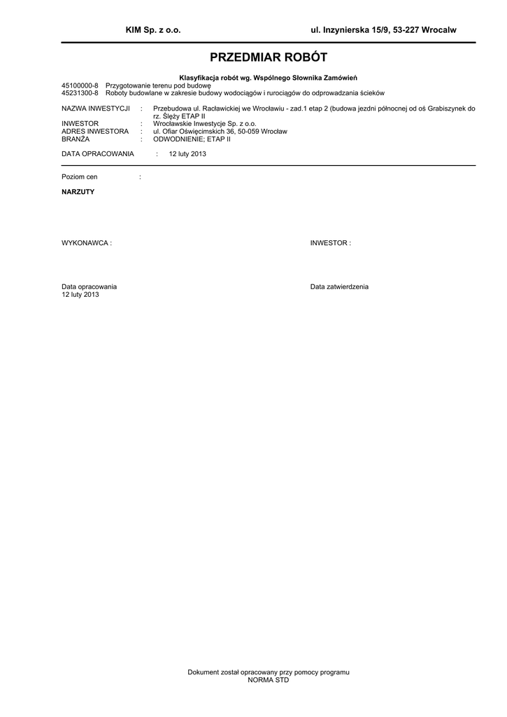 KIM Sp. z o.o. ul. Inzynierska 15/9, 53-227 Wrocalw PRZEDMIAR ROBÓT 45100000-8 45231300-8 Klasyfikacja robót wg. Wspólnego Słownika Zamówień Przygotowanie terenu pod budowę Roboty budowlane w zakresie budowy wodociągów i rurociągów do odprowadzania ścieków NAZWA INWESTYCJI : INWESTOR ADRES INWESTORA BRANŻA : : : DATA OPRACOWANIA Poziom cen Przebudowa ul. Racławickiej we Wrocławiu - zad.1 etap 2 (budowa jezdni północnej od oś Grabiszynek do rz. Ślęży ETAP II Wrocławskie Inwestycje Sp. z o.o. ul. Ofiar Oświęcimskich 36, 50-059 Wrocław ODWODNIENIE; ETAP II : 12 luty 2013 : NARZUTY WYKONAWCA : INWESTOR : Data opracowania 12 luty 2013 Data zatwierdzenia Dokument został opracowany przy pomocy programu NORMA STD P_KD_Racławicka_EtapII Lp. 1 2 3 4 DZIAŁY KOSZTORYSU Nazwa działu Od ROBOTY ZIEMNE I PRZYGOTOWAWCZE ODWODNIENIE WYKOPÓW ROBOTY MONTAŻOWE KASKADY RUROWE PRZY STUDNIACH 1 20 24 54 -2- Norma STD Wersja 4.32 Nr seryjny: 10790 Użytkownik: RR Do 19 23 53 64 P_KD_Racławicka_EtapII Lp. Podstawa Nr spec. techn. 1 45100000-8 1 KNNR 1 Dd.1 0111-01 01.06.00 2 KNR-W 2- D d.1 01 0301-03 01.06.00 3 KNR-W 2- D d.1 01 0203-09 01.06.00 4 d.1 kalk. własna 5 d.1 kalk. własna D01.06.00 D01.06.00 6 wyc. wlasna D d.1 01.06.00 7 KNNR 1 d.1 0314-02 8 KNNR 1 d.1 0314-02 analogia 9 KNNR 1 d.1 0315-04 PRZEDMIAR D01.06.00 D01.06.00 D01.06.00 Opis i wyliczenia j.m. ROBOTY ZIEMNE I PRZYGOTOWAWCZE Roboty pomiarowe przy liniowych robotach ziemnych, na drogach w te- km renie równinnym (45.5+17.5+2+77.5+98.5)/1000 km Ręczne roboty ziemne z transportem urobku samochodami samowyładowczymi na odległość do 1 km (kat. gruntu IV) wykopy liniowe <D2-D1>(5.10+4.48)/2*1.7*(28.00-2.67) <D1- >(4.48+3.71)/2*1.7*(17.50-1.92) <D2-D3>(2.97+3.05)/2*1.00*(22.5-3.65) <D5- >(4.07+4.07)/2*1.25*(2.0-0.5) <D5-D6>(3.99+3.15)/2*1.0*(35.0-2.05) <D8-D7>(2.65+2.55)/2*1.0*(20.00-2.05) <D9- >(4.09+3.92)/2*1.55*(17.50-0.5) <przykanaliki>2.3*1.0*98.50 wykopu obiektowe <studnia D1>3.84*3.84*4.02 <studnia D3>3.1*3.1*2.32 <studnia D6>3.1*3.1*2.70 <studnia D7>3.1*3.1*2.54 <kask 1>2.1*2.1*3.87 <kask 3>2.1*2.1*4.18 <kask 8>2.1*2.1*4.29 <kask 9>2.1*2.1*4.29 <wpusty>2.1*2.1*2.22*11 A (obliczenia pomocnicze) m3 poz.2A*0.4 m3 Poszcz 0.241 RAZEM Razem 0.241 206.262 108.460 56.739 7.631 117.632 46.670 105.532 226.550 Roboty ziemne wykonywane koparkami podsiębiernymi o pojemności m3 łyżki 0.60 m3 w gruncie kat. IV z transportem urobku samochodami samowyładowczymi na odległość do 1 km poz.2A*0.6 m3 Wywóz gruntu na odkład czasowy m3 poz.14C*0.30 m3 Wywóz gruntu na składowisko wykonawcy m3 poz.2A-poz.4 m3 Utylizacja gruntu z wykopów t poz.5 t Umocnienie ścian wykopów o szer.do 1.0 m i głęb.do 6.0 m w gruntach nawodnionych kat. I-III grodzicami wbijanymi pionowo wraz z wyciąganiem grodzic <D2-D3>(2.97+3.05)/2*(22.5-3.65)*2 <D5-D6>(3.99+3.15)/2*(35.0-2.05)*2 <D8-D7>(2.65+2.55)/2*(20.00-2.05)*2 <przykanaliki>2.3*98.50*2 m2 m2 m2 m2 m2 59.277 22.295 25.947 24.409 17.067 18.434 18.919 18.919 107.692 ======== 1 188.435 475.374 RAZEM 475.374 713.061 RAZEM 713.061 190.939 RAZEM 190.939 997.496 RAZEM 997.496 997.496 RAZEM 997.496 113.477 235.263 93.340 453.100 RAZEM 895.180 242.661 127.600 12.210 136.170 RAZEM 518.641 28.768 33.480 31.496 205.128 RAZEM 298.872 Umonienie pionowych ścian wykopów liniowych grodzicami GZ4 wraz z m2 wyciąganiem grodzic; szerokość wykopu do 1,8 m <D2-D1>(5.10+4.48)/2*(28.00-2.67)*2 <D1- >(4.48+3.71)/2*(17.50-1.92)*2 <D5- >(4.07+4.07)/2*(2.0-0.5)*2 <D9- >(4.09+3.92)/2*(17.50-0.5)*2 m2 m2 m2 m2 Umocnienie ścian wykopów palami szalunkowymi stalowymi na gł. do 3, 0 m pod komory, studzienki itp. na sieciach zewnętrznych w gruntach suchych kat.I-IV wraz z rozbiórką <studnia D3>3.10*4*2.32 <studnia D6>3.10*4*2.70 <studnia D7>3.10*4*2.54 <wpusty>2.10*4*2.22*11 m2 -3- Norma STD Wersja 4.32 Nr seryjny: 10790 Użytkownik: RR m2 m2 m2 m2 P_KD_Racławicka_EtapII Lp. Podstawa 10 KNNR 1 d.1 0315-05 11 KNR 9-06 d.1 0101-02 12 KNR 9-06 d.1 0102-02 13 d.1 kalk. własna Nr spec. techn. D01.06.00 D01.06.00 D01.06.00 D01.06.00 14 KNR-W 2- D d.1 01 0312-04 01.06.00 PRZEDMIAR Opis i wyliczenia j.m. Umocnienie ścian wykopów palami szalunkowymi stalowymi na gł. do 6, 0 m pod komory, studzienki itp. na sieciach zewnętrznych w gruntach suchych kat.I-IV wraz z rozbiórką <kask 1>2.10*4*3.87 <kask. 3>2.1*4*4.18 <kask. 8>2.10*4*4.29 <kask. 9>2.10*4*4.29 m2 Wbijanie ścianek szczelnych stalowych z grodzic G-62 wibromłotem HVB; głębokość wbicia do 6 m, grunt kat. III <D1 >3.34*4 m m2 m2 m2 m2 m Wyciąganie ścianek szczelnych stalowych z grodzic G-62 wibromłotem m HVB; głębokość wbicia do 6 m, grunt kat. III poz.11 m Koszt zakupu i dowozu gruntu m3 poz.14C*0.70 m3 Zasypywanie wykopów liniowych o ścianach pionowych głębokości do 3.0 m i szer. 0.8-1.5 m; kat. gr. I-II poz.2A A (obliczenia pomocnicze) m3 16 KNR-W 2- D d.1 01 0228-01 01.06.00 m3 17 KNNR 1 d.1 0529-01 18 KNNR 1 d.1 0529-06 D01.06.00 D01.06.00 19 D-01.06.00 D d.1 kalk. włas- 01.06.00 na 2 45100000-8 20 KNNR 1 Dd.2 0605-03 01.06.00 21 KNR 2-01 d.2 0615-01 D01.06.00 Zasypywanie wykopów spycharkami z przemieszczeniem gruntu na od- m3 ległość do 10 m w gruncie kat. I-III poz.14C*0.6 m3 Zagęszczenie nasypów ubijakami mechanicznymi; grunty sypkie kat. IIII poz.15 m3 Demontaż konstrukcji podwieszeń rurociągów i kanałów; element o roz- kpl. piętości 4 m 1 kpl. Wykonanie i rozbrka dróg montażowych wzdłuż wykopów otwartych do kpl. transportu urobku, wykonania robót montazowych (np. z płyt PD-2 na podsypce z pospółki) 1 kpl. ODWODNIENIE WYKOPÓW Igłofiltry o średnicy do 50 mm wpłukiwane w grunt bezpośrednio bez ob- szt. sypki do głębokości 8 m. 200 szt. Rurociągi stalowe spawane tymczasowe- śr. 80-125 mm m 600 m Norma STD Wersja 4.32 Nr seryjny: 10790 Użytkownik: RR 139.692 13.360 RAZEM 13.360 13.360 RAZEM 13.360 445.523 RAZEM 445.523 ======== 551.973 636.462 ======== 636.462 254.585 RAZEM 254.585 381.877 R