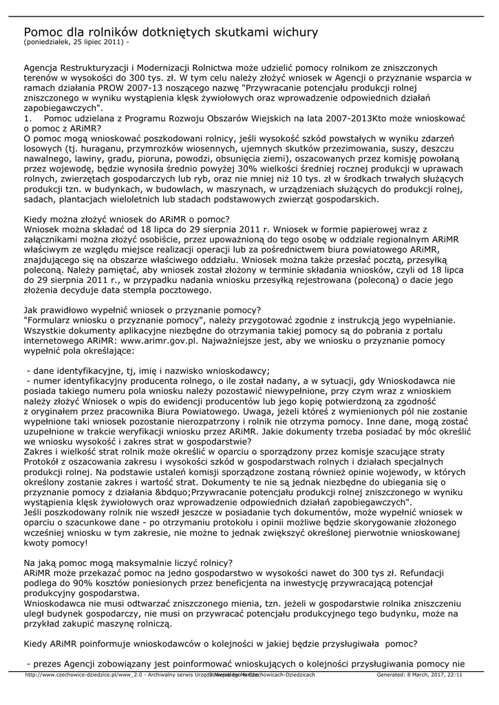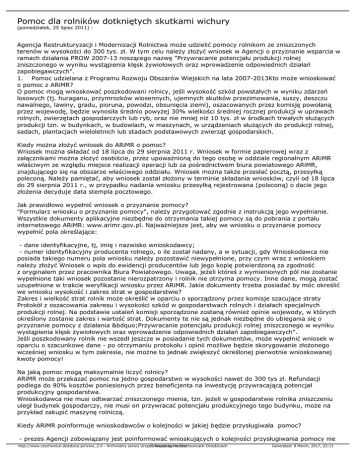 Pomoc dla rolników dotkniętych skutkami wichury (poniedziałek, 25 lipiec 2011) - Agencja Restrukturyzacji i Modernizacji Rolnictwa może udzielić pomocy rolnikom ze zniszczonych terenów w wysokości do 300 tys. zł. W tym celu należy złożyć wniosek w Agencji o przyznanie wsparcia w ramach działania PROW 2007-13 noszącego nazwę "Przywracanie potencjału produkcji rolnej zniszczonego w wyniku wystąpienia klęsk żywiołowych oraz wprowadzenie odpowiednich działań zapobiegawczych". 1. Pomoc udzielana z Programu Rozwoju Obszarów Wiejskich na lata 2007-2013Kto może wnioskować o pomoc z ARiMR? O pomoc mogą wnioskować poszkodowani rolnicy, jeśli wysokość szkód powstałych w wyniku zdarzeń losowych (tj. huraganu, przymrozków wiosennych, ujemnych skutków przezimowania, suszy, deszczu nawalnego, lawiny, gradu, pioruna, powodzi, obsunięcia ziemi), oszacowanych przez komisję powołaną przez wojewodę, będzie wynosiła średnio powyżej 30% wielkości średniej rocznej produkcji w uprawach rolnych, zwierzętach gospodarczych lub ryb, oraz nie mniej niż 10 tys. zł w środkach trwałych służących produkcji tzn. w budynkach, w budowlach, w maszynach, w urządzeniach służących do produkcji rolnej, sadach, plantacjach wieloletnich lub stadach podstawowych zwierząt gospodarskich. Kiedy można złożyć wniosek do ARiMR o pomoc? Wniosek można składać od 18 lipca do 29 sierpnia 2011 r. Wniosek w formie papierowej wraz z załącznikami można złożyć osobiście, przez upoważnioną do tego osobę w oddziale regionalnym ARiMR właściwym ze względu miejsce realizacji operacji lub za pośrednictwem biura powiatowego ARiMR, znajdującego się na obszarze właściwego oddziału. Wniosek można także przesłać pocztą, przesyłką poleconą. Należy pamiętać, aby wniosek został złożony w terminie składania wniosków, czyli od 18 lipca do 29 sierpnia 2011 r., w przypadku nadania wniosku przesyłką rejestrowana (poleconą) o dacie jego złożenia decyduje data stempla pocztowego. Jak prawidłowo wypełnić wniosek o przyznanie pomocy? "Formularz wniosku o przyznanie pomocy", należy przygotować zgodnie z instrukcją jego wypełnianie. Wszystkie dokumenty aplikacyjne niezbędne do otrzymania takiej pomocy są do pobrania z portalu internetowego ARiMR: www.arimr.gov.pl. Najważniejsze jest, aby we wniosku o przyznanie pomocy wypełnić pola określające: - dane identyfikacyjne, tj, imię i nazwisko wnioskodawcy; - numer identyfikacyjny producenta rolnego, o ile został nadany, a w sytuacji, gdy Wnioskodawca nie posiada takiego numeru pola wniosku należy pozostawić niewypełnione, przy czym wraz z wnioskiem należy złożyć Wniosek o wpis do ewidencji producentów lub jego kopię potwierdzoną za zgodność z oryginałem przez pracownika Biura Powiatowego. Uwaga, jeżeli któreś z wymienionych pól nie zostanie wypełnione taki wniosek pozostanie nierozpatrzony i rolnik nie otrzyma pomocy. Inne dane, mogą zostać uzupełnione w trakcie weryfikacji wniosku przez ARiMR. Jakie dokumenty trzeba posiadać by móc określić we wniosku wysokość i zakres strat w gospodarstwie? Zakres i wielkość strat rolnik może określić w oparciu o sporządzony przez komisje szacujące straty Protokół z oszacowania zakresu i wysokości szkód w gospodarstwach rolnych i działach specjalnych produkcji rolnej. Na podstawie ustaleń komisji sporządzone zostaną również opinie wojewody, w których określony zostanie zakres i wartość strat. Dokumenty te nie są jednak niezbędne do ubiegania się o przyznanie pomocy z działania „Przywracanie potencjału produkcji rolnej zniszczonego w wyniku wystąpienia klęsk żywiołowych oraz wprowadzenie odpowiednich działań zapobiegawczych". Jeśli poszkodowany rolnik nie wszedł jeszcze w posiadanie tych dokumentów, może wypełnić wniosek w oparciu o szacunkowe dane - po otrzymaniu protokołu i opinii możliwe będzie skorygowanie złożonego wcześniej wniosku w tym zakresie, nie możne to jednak zwiększyć określonej pierwotnie wnioskowanej kwoty pomocy! Na jaką pomoc mogą maksymalnie liczyć rolnicy? ARiMR może przekazać pomoc na jedno gospodarstwo w wysokości nawet do 300 tys zł. Refundacji podlega do 90% kosztów poniesionych przez beneficjenta na inwestycję przywracającą potencjał produkcyjny gospodarstwa. Wnioskodawca nie musi odtwarzać zniszczonego mienia, tzn. jeżeli w gospodarstwie rolnika zniszczeniu uległ budynek gospodarczy, nie musi on przywracać potencjału produkcyjnego tego budynku, może na przykład zakupić maszynę rolniczą. Kiedy ARiMR poinformuje wnioskodawców o kolejności w jakiej będzie przysługiwała pomoc? - prezes Agencji zobowiązany jest poinformować wnioskujących o kolejności przysługiwania pomocy nie http://www.czechowice-dziedzice.pl/www_2.0 - Archiwalny serwis Urzędu Powered Miejskiego by Mambo w Czechowicach-Dziedzicach Generated: 8 March, 2017, 22:11 później nie w terminie 40 dni od dnia upływu terminu składania wniosków (tj. liczonych od dnia zakończenia naboru)). Informacje zamieszczone zostaną na stronie internetowej www.arimr.gov.pl. - Wnioski będą rozpatrywane w ciągu 2 miesięcy od podania informacji o kolejności przysługiwania pomocy, a w przypadku pozytywnej weryfikacji będą zawierane umowy z wnioskującymi o pomoc. Po podpisaniu umowy, rolnik zobowiązany będzie zakończyć inwestycję i złożyć do Agencji wniosek o płatność – nie później jednak niż w ciągu 24 miesięcy od zawarcia umowy (w przypadku operacji jednoetapowych), bądź nie później niż w ciągu 36 miesięcy od zawarcia umowy (w przypadku operacji realizowanych w dwóch etapach).DODATKOWE INFORMACJE: Agencja Restrukturyzacji i Modernizacji Rolnictwa, www.arimr.gov.pl; bezpłatna infolinia tel:0-800-38-00-84, Ministerstwo Rolnictwa www.minrol.gov.pl oraz Oddziałach Regionalnych ARiMR – numery telefonów dostępne na stronie internetowej Agencji. 2. Pomoc krajow
