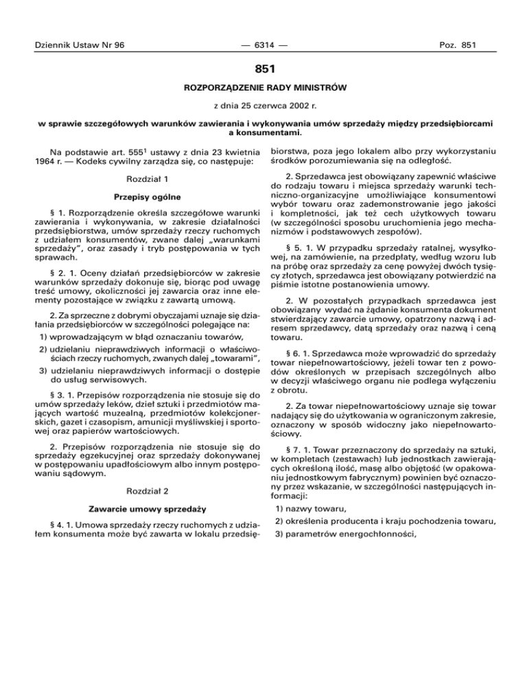 Dziennik Ustaw Nr 96 — 6314 — Poz. 851 851 ROZPORZÑDZENIE RADY MINISTRÓW z dnia 25 czerwca 2002 r. w sprawie szczegó∏owych warunków zawierania i wykonywania umów sprzeda˝y mi´dzy przedsi´biorcami a konsumentami. Na podstawie art. 5551 ustawy z dnia 23 kwietnia 1964 r. — Kodeks cywilny zarzàdza si´, co nast´puje: biorstwa, poza jego lokalem albo przy wykorzystaniu Êrodków porozumiewania si´ na odleg∏oÊç. Rozdzia∏ 1 2. Sprzedawca jest obowiàzany zapewniç w∏aÊciwe do rodzaju towaru i miejsca sprzeda˝y warunki techniczno-organizacyjne umo˝liwiajàce konsumentowi wybór towaru oraz zademonstrowanie jego jakoÊci i kompletnoÊci, jak te˝ cech u˝ytkowych towaru (w szczególnoÊci sposobu uruchomienia jego mechanizmów i podstawowych zespo∏ów). Przepisy ogólne § 1. Rozporzàdzenie okreÊla szczegó∏owe warunki zawierania i wykonywania, w zakresie dzia∏alnoÊci przedsi´biorstwa, umów sprzeda˝y rzeczy ruchomych z udzia∏em konsumentów, zwane dalej „warunkami sprzeda˝y”, oraz zasady i tryb post´powania w tych sprawach. § 2. 1. Oceny dzia∏aƒ przedsi´biorców w zakresie warunków sprzeda˝y dokonuje si´, bioràc pod uwag´ treÊç umowy, okolicznoÊci jej zawarcia oraz inne elementy pozostajàce w zwiàzku z zawartà umowà. 2. Za sprzeczne z dobrymi obyczajami uznaje si´ dzia∏ania przedsi´biorców w szczególnoÊci polegajàce na: 1) wprowadzajàcym w b∏àd oznaczaniu towarów, 2) udzielaniu nieprawdziwych informacji o w∏aÊciwoÊciach rzeczy ruchomych, zwanych dalej „towarami”, 3) udzielaniu nieprawdziwych informacji o dost´pie do us∏ug serwisowych. § 3. 1. Przepisów rozporzàdzenia nie stosuje si´ do umów sprzeda˝y leków, dzie∏ sztuki i przedmiotów majàcych wartoÊç muzealnà, przedmiotów kolekcjonerskich, gazet i czasopism, amunicji myÊliwskiej i sportowej oraz papierów wartoÊciowych. 2. Przepisów rozporzàdzenia nie stosuje si´ do sprzeda˝y egzekucyjnej oraz sprzeda˝y dokonywanej w post´powaniu upad∏oÊciowym albo innym post´powaniu sàdowym. Rozdzia∏ 2 Zawarcie umowy sprzeda˝y § 4. 1. Umowa sprzeda˝y rzeczy ruchomych z udzia∏em konsumenta mo˝e byç zawarta w lokalu przedsi´- § 5. 1. W przypadku sprzeda˝y ratalnej, wysy∏kowej, na zamówienie, na przedp∏aty, wed∏ug wzoru lub na prób´ oraz sprzeda˝y za cen´ powy˝ej dwóch tysi´cy z∏otych, sprzedawca jest obowiàzany potwierdziç na piÊmie istotne postanowienia umowy. 2. W pozosta∏ych przypadkach sprzedawca jest obowiàzany wydaç na ˝àdanie konsumenta dokument stwierdzajàcy zawarcie umowy, opatrzony nazwà i adresem sprzedawcy, datà sprzeda˝y oraz nazwà i cenà towaru. § 6. 1. Sprzedawca mo˝e wprowadziç do sprzeda˝y towar niepe∏nowartoÊciowy, je˝eli towar ten z powodów okreÊlonych w przepisach szczególnych albo w decyzji w∏aÊciwego organu nie podlega wy∏àczeniu z obrotu. 2. Za towar niepe∏nowartoÊciowy uznaje si´ towar nadajàcy si´ do u˝ytkowania w ograniczonym zakresie, oznaczony w sposób widoczny jako niepe∏nowartoÊciowy. § 7. 1. Towar przeznaczony do sprzeda˝y na sztuki, w kompletach (zestawach) lub jednostkach zawierajàcych okreÊlonà iloÊç, mas´ albo obj´toÊç (w opakowaniu jednostkowym fabrycznym) powinien byç oznaczony przez wskazanie, w szczególnoÊci nast´pujàcych informacji: 1) nazwy towaru, 2) okreÊlenia producenta i kraju pochodzenia towaru, 3) parametrów energoch∏onnoÊci, Dziennik Ustaw Nr 96 — 6315 — 4) znaku bezpieczeƒstwa wymaganego przez przepisy o certyfikacji, 5) informacji o dopuszczeniu towaru do obrotu w Polsce (homologacji). 2. Towar niepe∏nowartoÊciowy, poza oznaczeniami, o których mowa w ust. 1, powinien byç zaopatrzony w dodatkowà informacj´ wymieniajàcà cechy decydujàce o obni˝eniu jego jakoÊci (wartoÊci u˝ytkowej), które stanowià podstaw´ obni˝enia ceny. 3. Obok ceny obni˝onej na towarze niepe∏nowartoÊciowym powinna byç wyraênie przekreÊlona znakiem „x” cena takiego samego towaru pe∏nowartoÊciowego. 4. Informacje, o których mowa w ust. 1 i 2, powinny byç sformu∏owane w j´zyku polskim, w sposób jasny i zrozumia∏y oraz niewprowadzajàcy konsumenta w b∏àd. 5. Wymagania dotyczàce znakowania towarów okreÊlajà odr´bne przepisy. § 8. 1. Sprzedawca jest obowiàzany podaç do wiadomoÊci kupujàcego cen´ oferowanego towaru oraz jego cen´ jednostkowà (cen´ za jednostk´ miary). Przy sprzeda˝y towaru oferowanego luzem jest wymagane podanie jedynie ceny jednostkowej. 2. Je˝eli konsument z∏o˝y∏ oÊwiadczenie o przyj´ciu oferty, o której mowa w ust. 1, sprzedawca nie mo˝e ˝àdaç ceny wy˝szej ni˝ uwidoczniona na towarze. 3. Szczegó∏owe zasady uwidaczniania cen towarów oraz sposób oznaczania cenà towarów przeznaczonych do sprzeda˝y okreÊlajà przepisy odr´bne. Rozdzia∏ 3 Wykonanie umowy sprzeda˝y Poz. 851 § 10. 1. Towar dostarczony przez przedsi´biorc´ w jednostkowym zamkni´tym opakowaniu fabrycznym, który ze wzgl´du na swój charakter nie wymaga sprawdzenia cech u˝ytkowych, powinien byç sprzedawany bez naruszenia tego opakowania. 2. Przy sprzeda˝y samoobs∏ugowej nale˝y udost´pniç konsumentowi nieodp∏atnie materia∏y odpowiednie do zapakowania zakupionego towaru. § 11. Sprzedawca nie mo˝e odmówiç wydania konsumentowi oferowanego do sprzeda˝y towaru po z∏o˝eniu przez konsumenta oÊwiadczenia o przyj´ciu oferty. Konsumentowi powinien byç wydany wybrany przez niego towar, chyba ˝e ˝àdany przez konsumenta sposób wydzielenia okreÊlonej cz´Êci towaru z ca∏oÊci narusza interesy sprzedawcy. § 12. Sprzedawca jest obowiàzany wydaç towar w iloÊci, jakoÊci i asortymencie zgodnie z umowà. § 13. Przy wydawaniu pojazdów sprzedawca dodatkowo jest obowiàzany do sprawdzenia wszystkich podzespo∏ów majàcych wp∏yw na bezpieczeƒstwo konsumenta. Rozdzia∏ 4 OdpowiedzialnoÊç sprzedawcy za nienale˝ytà jakoÊç towaru § 14. 1. Do odpowiedzial