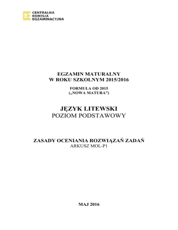 EGZAMIN MATURALNY W ROKU SZKOLNYM 2015/2016 FORMUŁA OD 2015 („NOWA MATURA”) JĘZYK LITEWSKI POZIOM PODSTAWOWY ZASADY OCENIANIA ROZWIĄZAŃ ZADAŃ ARKUSZ MOL-P1 MAJ 2016 1.1 užduotis (0–2) Wymagania ogólne II. Odbiór wypowiedzi i wykorzystanie zawartych w niej informacji. Wymagania szczegółowe 2.4. Zdający rozpoznaje wypowiedzi o charakterze emocjonalnym i perswazyjnym [gimnazjum]. Schemat punktowania 2 p. – za poprawne wskazanie dwóch sformułowań. 1 p. – za poprawne wskazanie jednego sformułowania. 0 p. – za odpowiedź błędną albo brak odpowiedzi. Przykładowe rozwiązanie 1. […] mes visada iš kiekvienos aklavietės randame kelią į laisvę […] 2. […] netikime, kad būna laimingų vergų […] 1.2 užduotis (0–1) II. Odbiór wypowiedzi i wykorzystanie zawartych w niej informacji. 2.9. Zdający […] nazywa zastosowane w tekście środki językowe i określa ich funkcje. Schemat punktowania 1 p. – za uzasadnienie użycia zaimków i czasowników w liczbie mnogiej. 0 p. – za odpowiedź błędną albo brak odpowiedzi. Przykładowe rozwiązanie Įvardžių ir veiksmažodžių daugiskaitos formos pabrėžia šalies vadovės kaip visų tautiečių atstovės poziciją bei reiškiamas jų vardu idėjas apie Lietuvos gyventojų bendrystę./ Įvardžių ir veiksmažodžių daugiskaitinės formos yra būdingos šalių vadovų kalbų stiliui. 1.3 užduotis (0–2) II. Odbiór wypowiedzi i wykorzystanie zawartych w niej informacji. 2.8. Zdający rozpoznaje cechy gatunkowe tekstu (w tym szczególnie intencje nadawcze). Schemat punktowania 2 p. – za poprawne podanie dwóch cech przemówienia. 1 p. – za poprawne podanie jednej cechy przemówienia. 0 p. – za odpowiedź błędną albo brak odpowiedzi. Przykładowe rozwiązanie 1. Vartojami kreipiniai, palyginimai. 2. Minimi istorijos ir politikos faktai, vertinami tam tikru (visuomenės vienybės, darnos) požiūriu. Strona 2 z 11 1.4 užduotis (0–1) II. Odbiór wypowiedzi i wykorzystanie zawartych w niej informacji. 2.10. Zdający odczytuje sens tekstu (a w nim znaczenie wyrazów […]) […]. Schemat punktowania 1 p. – za poprawne wyjaśnienie dwóch słów. 0 p. – za odpowiedź błędną albo brak odpowiedzi. Przykładowe rozwiązanie Propaganda – visuomenės nuomonės formavimas, primetant tam tikrą turinį; manipuliavimas; melagingos ar tendencingos indos. Pademonstruoti – aiškiai, ryškiai parodyti. 1.5 užduotis (0–1) II. Odbiór wypowiedzi i wykorzystanie zawartych w niej informacji. 2.10. Zdający odczytuje sens tekstu (a w nim znaczenie związków frazeologicznych […]) […]. Schemat punktowania 1 p. – za poprawną odpowiedź. 0 p. – za odpowiedź błędną albo brak odpowiedzi. Przykładowe rozwiązanie Meilės Lietuvai nesunaikino skaudi istorijos patirtis: nei kovos su kryžiuočiais, nei totalitarinė sistema. 2.1 užduotis (0–1) II. Odbiór wypowiedzi i wykorzystanie zawartych w niej informacji. 2.8. Zdający wyszukuje w wypowiedzi potrzebne informacje […] [gimnazjum]. Schemat punktowania 1 p. – za sformułowanie głównej myśli. 0 p. – za odpowiedź błędną albo brak odpowiedzi. Przykładowe rozwiązanie Romos Zagorskienės kelias į „Vagos” leidyklą. Strona 3 z 11 2.2 užduotis (0–1) II. Odbiór wypowiedzi i wykorzystanie zawartych w niej informacji. 2.10. Zdający odczytuje sens […] grupy zdań uporządkowanych w akapicie. Schemat punktowania 1 p. – za poprawną odpowiedź. 0 p. – za odpowiedź błędną albo brak odpowiedzi. Przykładowe rozwiązanie Roma Zagorskienė norėjo pasakyti, kad namų darbus ji ruošdavo greitomis, neatidžiai, nesusikaupusi. 2.3 užduotis (0–2) II. Odbiór wypowiedzi i wykorzystanie zawartych w niej informacji. 2.12. Zdający odczytuje sens tekstów […] publicystycznych […], uwzględniając zawarte w nich informacje zarówno jawne, jak i ukryte. Schemat punktowania 2 p. – za poprawne podanie dwóch argumentów. 1 p. – za poprawne podanie jednego argumentu. 0 p. – za odpowiedź błędną lub brak odpowiedzi. Przykładowe rozwiązanie 1. Reikėjo versti daugiausia sovietinių respublikų kūrinius. 2. Mažai buvo vertimų iš Vakarų Europos tautų kalbų. 2.4 užduotis (0–1) II. Odbiór wypowiedzi i wykorzystanie zawartych w niej informacji. 2.12. Zdający odczytuje sens tekstów […] publicystycznych […], uwzględniając zawarte w nich informacje zarówno jawne, jak i ukryte. Schemat punktowania 1 p. – za odpowiedź D. 0 p. – za odpowiedź błędną lub brak odpowiedzi. Rozwiązanie D. 2.5 užduotis (0–1) III. Tworzenie wypowiedzi [gimnazjum]. 3.11. Zdający […] dobiera synonimy […]. Schemat punktowania 1 p. – za prawidłowo dobrany synonim. 0 p. – za odpowiedź błędną lub brak odpowiedzi. Przykładowe rozwiązanie kruopšti Strona 4 z 11 3 užduotis 1 tema. Ar žmogus visada gali rinktis ir likti ištikimas sau artimiems idealams? Svarstykite remdamiesi pateiktomis ištraukomis iš Dalios Grinkevičiūtės apysakos Lietuviai prie Laptevų jūros ir kitu kultūros tekstu. Jūsų rašinio apimtis – ne mažiau kaip 250 žodžių. Wymagania ogólne Wymagania szczegółowe I. Zrozumienie własnego dziedzictwa narodowego lub etnicznego. III. Tworzenie wypowiedzi. IV. Analiza i interpretacja tekstów kultury. Zdający: 1.1. zna utwory literackie i inne teksty kultury ważne dla poczucia tożsamości narodowej […]. Zdający: 3.1. sprawnie posługuje się oficjalną odmianą języka narodowego [gimnazjum]; 3.1. tworzy dłuższy tekst pisany zgodnie z podstawowymi regułami jego organizacji, przestrzegając zasad spójności znaczeniowej i logicznej; 3.2. tworzy samodzielną wypowiedź argumentacyjną według podstawowych zasad logiki i retoryki (stawia tezę, dobiera i porządkuje argumenty, dobiera przykłady ilustrujące wywód myślowy, przeprowadza prawidłowe wnioskowanie); 3.4. stosuje uczciwe zabiegi perswazyjne, zdając sobie sprawę z ich wartości i funkcji. Zdający: 4.7. określa