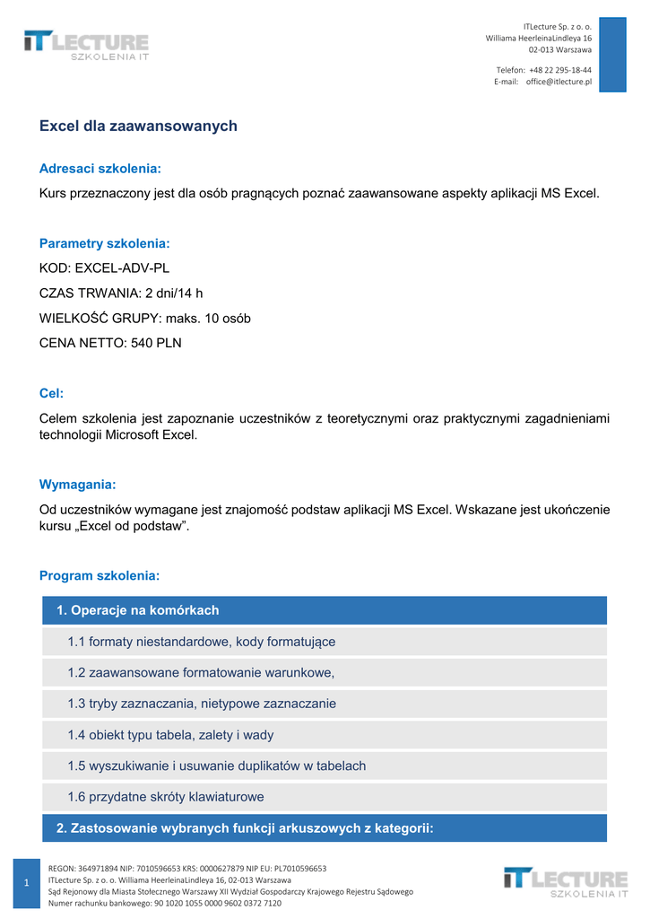 ITLecture Sp. z o. o. Williama HeerleinaLindleya 16 02-013 Warszawa Telefon: +48 22 295-18-44 E-mail: [email protected] Excel dla zaawansowanych Adresaci szkolenia: Kurs przeznaczony jest dla osób pragnących poznać zaawansowane aspekty aplikacji MS Excel. Parametry szkolenia: KOD: EXCEL-ADV-PL CZAS TRWANIA: 2 dni/14 h WIELKOŚĆ GRUPY: maks. 10 osób CENA NETTO: 540 PLN Cel: Celem szkolenia jest zapoznanie uczestników z teoretycznymi oraz praktycznymi zagadnieniami technologii Microsoft Excel. Wymagania: Od uczestników wymagane jest znajomość podstaw aplikacji MS Excel. Wskazane jest ukończenie kursu „Excel od podstaw”. Program szkolenia: 1. Operacje na komórkach 1.1 formaty niestandardowe, kody formatujące 1.2 zaawansowane formatowanie warunkowe, 1.3 tryby zaznaczania, nietypowe zaznaczanie 1.4 obiekt typu tabela, zalety i wady 1.5 wyszukiwanie i usuwanie duplikatów w tabelach 1.6 przydatne skróty klawiaturowe 2. Zastosowanie wybranych funkcji arkuszowych z kategorii: 1 REGON: 364971894 NIP: 7010596653 KRS: 0000627879 NIP EU: PL7010596653 ITLecture Sp. z o. o. Williama HeerleinaLindleya 16, 02-013 Warszawa Sąd Rejonowy dla Miasta Stołecznego Warszawy XII Wydział Gospodarczy Krajowego Rejestru Sądowego Numer rachunku bankowego: 90 1020 1055 0000 9602 0372 7120 ITLecture Sp. z o. o. Williama HeerleinaLindleya 16 02-013 Warszawa Telefon: +48 22 295-18-44 E-mail: [email protected] 2.1 logicznych 2.2 wyszukiwania 2.3 tekstowych 2.4 daty i czasu 2.5 wykorzystanie inspekcji w celu śledzenia i wykrywania błędów 2.6 zagnieżdżanie formuł 3. Używanie nazw niestandardowych w formułach: 3.1 metody tworzenia nazw 3.2 edycja nazw istniejących 3.3 zasięg nazw 4. Autokonspekt i grupowanie danych 5. Ochrona danych i metody zarządzania szablonem: 5.1 sprawdzanie poprawności danych 5.2 ochrona komórek 5.3 ochrona arkuszy 5.4 ochrona pliku 6. Konsolidacja danych: 6.1 pochodzących z wielu arkuszy 6.2 pochodzących z wielu plików 6.3 formuły operujące na wielu arkuszach 7. Kreator sum częściowych, agregacja wielopoziomowa 8. Zaawansowane możliwości tabel przestawnych: 8.1 grupowanie według czasu, liczb i wartości tekstowych 2 REGON: 364971894 NIP: 7010596653 KRS: 0000627879 NIP EU: PL7010596653 ITLecture Sp. z o. o. Williama HeerleinaLindleya 16, 02-013 Warszawa Sąd Rejonowy dla Miasta Stołecznego Warszawy XII Wydział Gospodarczy Krajowego Rejestru Sądowego Numer rachunku bankowego: 90 1020 1055 0000 9602 0372 7120 ITLecture Sp. z o. o. Williama HeerleinaLindleya 16 02-013 Warszawa Telefon: +48 22 295-18-44 E-mail: [email protected] 8.2 metody filtrowania tabeli przestawnej 8.3 pola obliczeniowe i elementy obliczeniowe 8.4 wykresy przestawne 9. Import danych zewnętrznych: 9.1 z plików tekstowych 9.2 z bazy danych Access 9.3 ze stron WWW 10. Tworzenie wykresów 10.1 szybkie metody tworzenia wykresów 10.2 dobór typu wykresu do danych 10.3 zarządzanie wyglądem 10.4 trend i prognozy na wykresie 10.5 mikrowykresy 11. Wstęp do makropoleceń: 11.1 aspekty bezpieczeństwa 11.2 rejestrowanie i uruchamianie makr 11.3 tworzenie przycisków uruchamiających makra 11.4 zarządzanie Wstążką, osadzanie makr na Wstążce 3 REGON: 364971894 NIP: 7010596653 KRS: 0000627879 NIP EU: PL7010596653 ITLecture Sp. z o. o. Williama HeerleinaLindleya 16, 02-013 Warszawa Sąd Rejonowy dla Miasta Stołecznego Warszawy XII Wydział Gospodarczy Krajowego Rejestru Sądowego Numer rachunku bankowego: 90 1020 1055 0000 9602 0372 7120