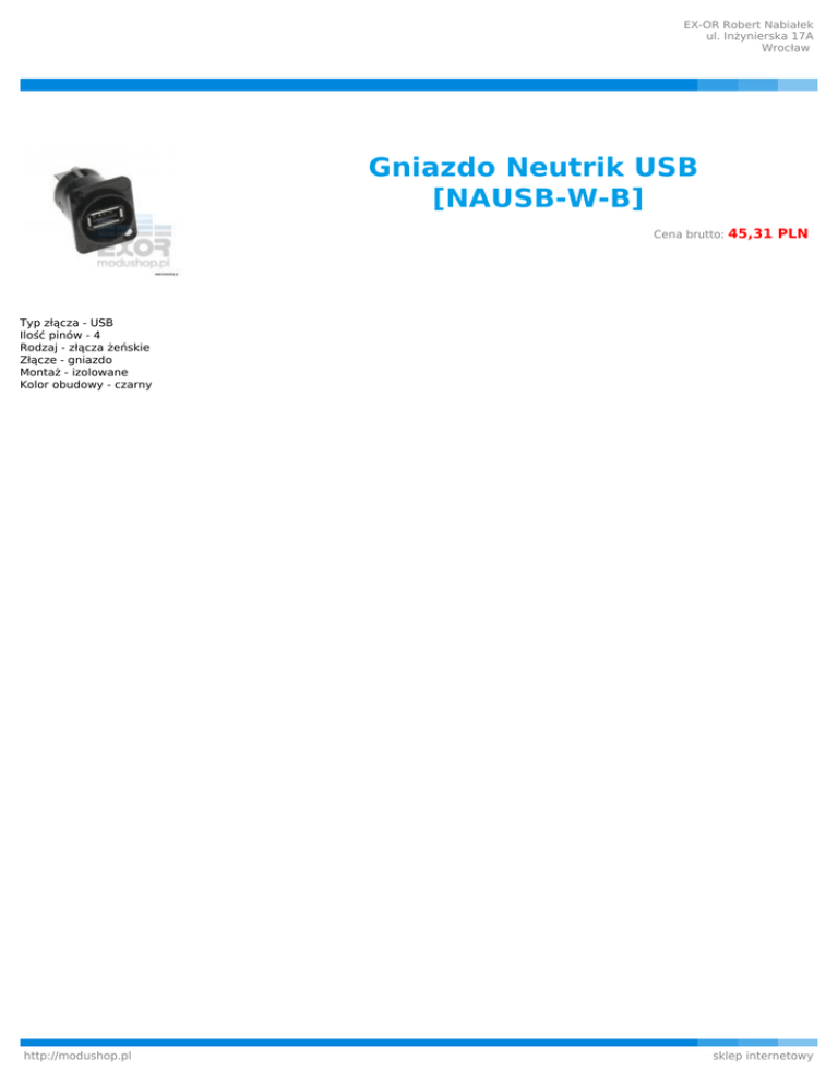 EX-OR Robert Nabiałek ul. Inżynierska 17A Wrocław Gniazdo Neutrik USB [NAUSB-W-B] Cena brutto: 45,31 PLN Typ złącza - USB Ilość pinów - 4 Rodzaj - złącza żeńskie Złącze - gniazdo Montaż - izolowane Kolor obudowy - czarny http://modushop.pl sklep internetowy