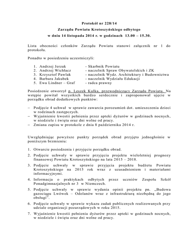 Protokół nr 228/14 Zarządu Powiatu Krotoszyńskiego odbytego w